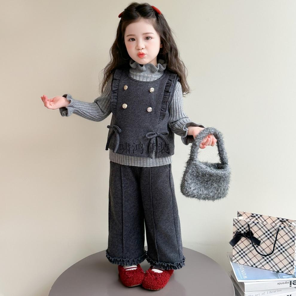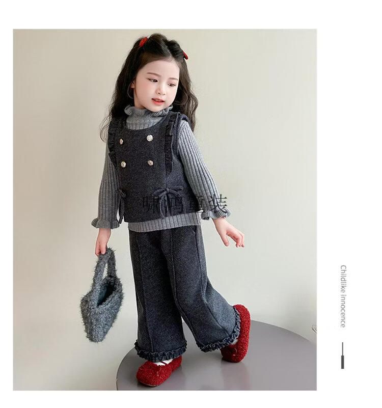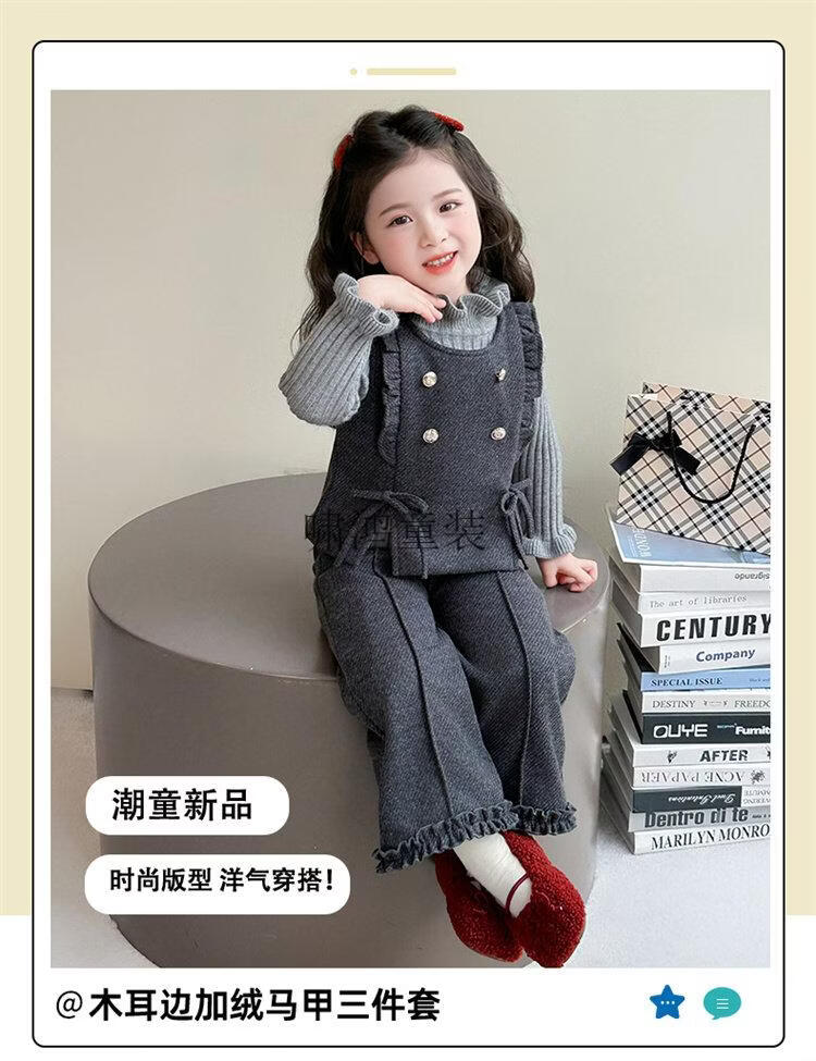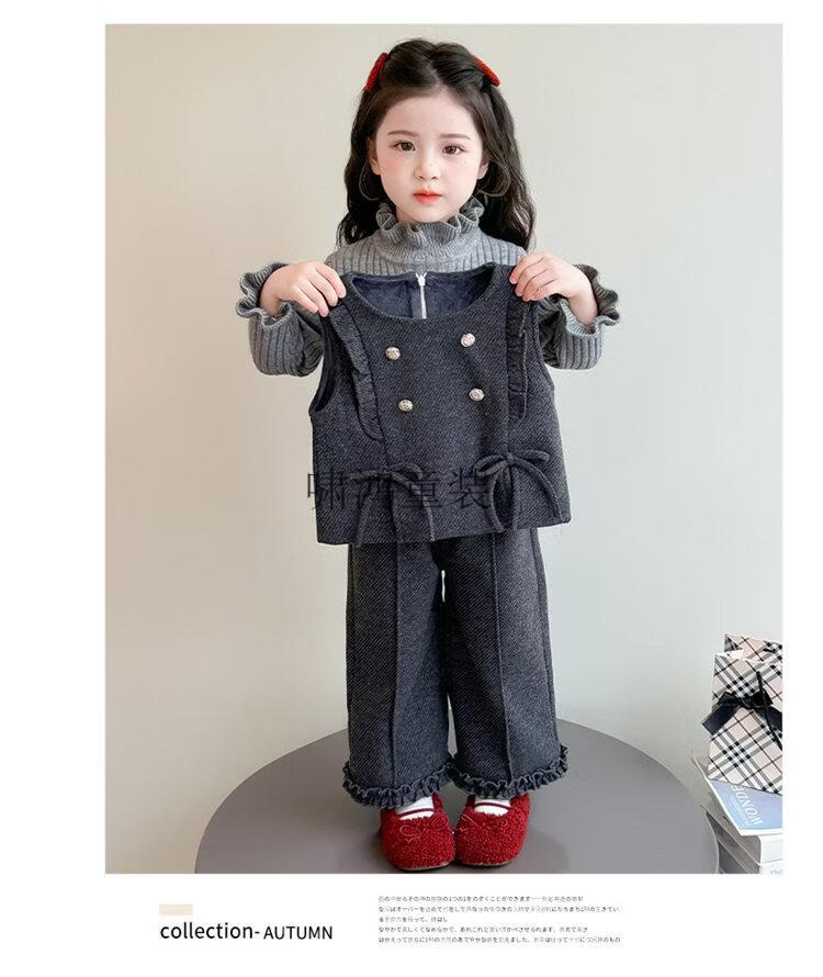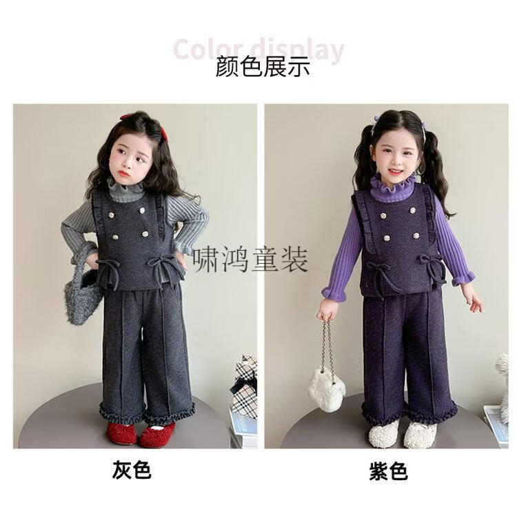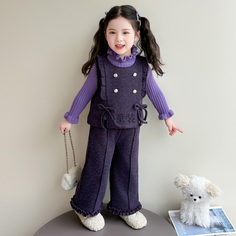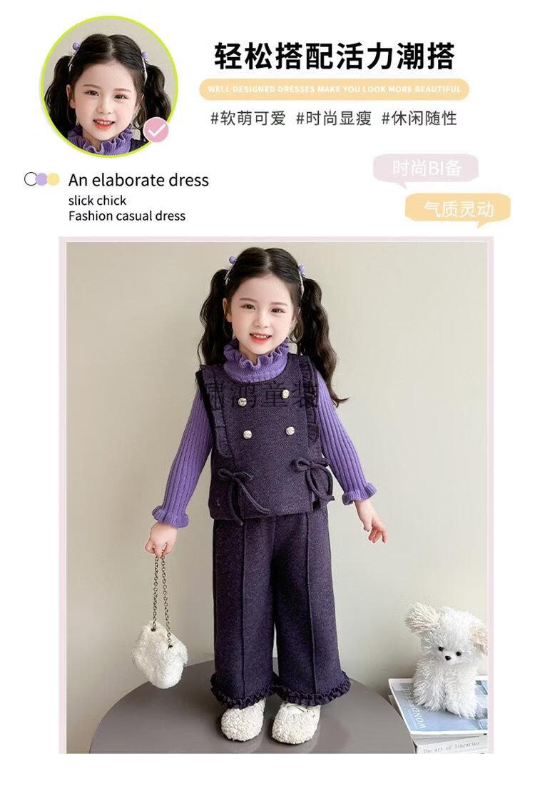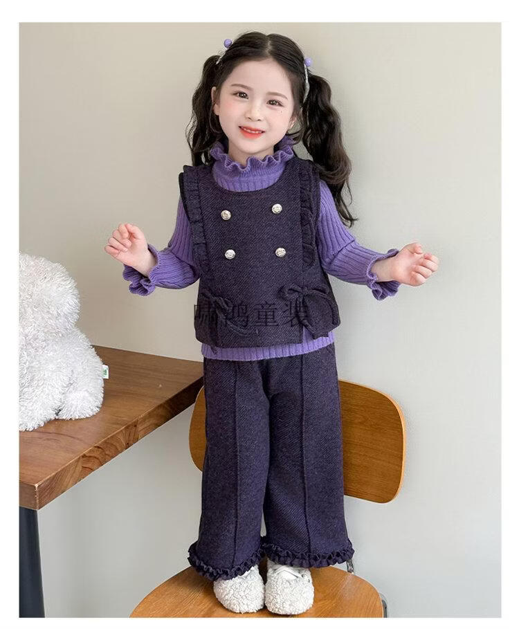 Log Cabin Girls' Velvet Suit Autumn and Winter 2026 New Style Fashionable Baby Girl Big Good-looking Sweater Winter Clothing Three-piece Set Purple Suit Vest + Pants 90 cm