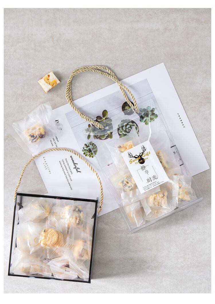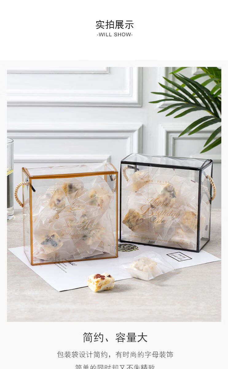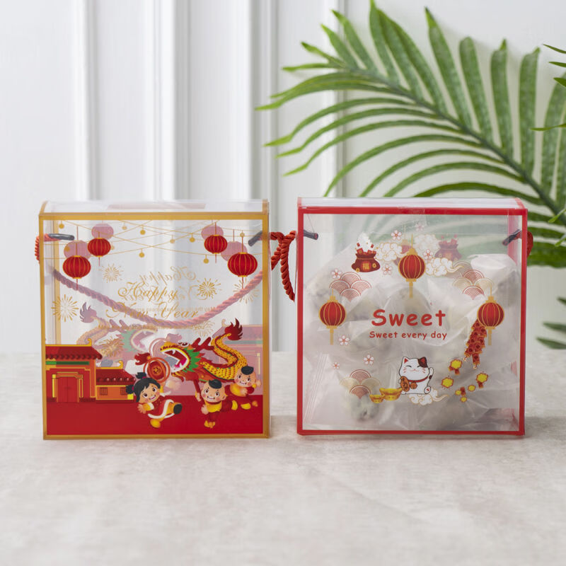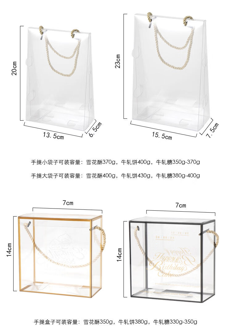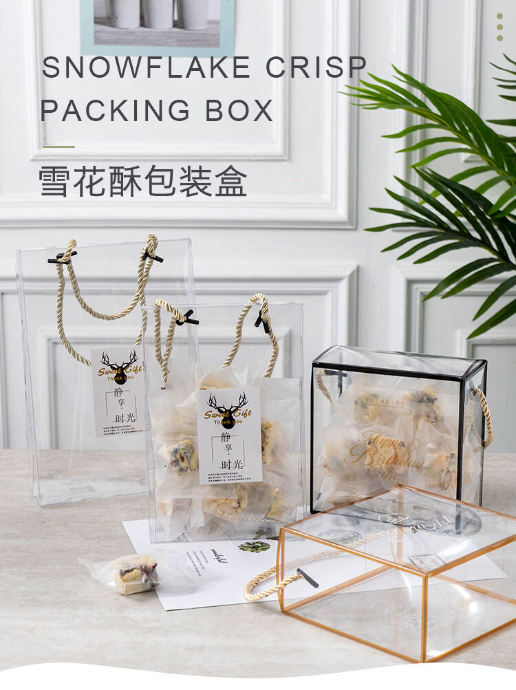 Fantasy transparent snowflake cake gift box hand bag large transparent baking biscuit packaging box plus hard New Year gift box large fully transparent hand gift box + Happy New Year sticker Can hold about 1Jin Jin is equal to 0.5kg 500 sets Loss momentum base price