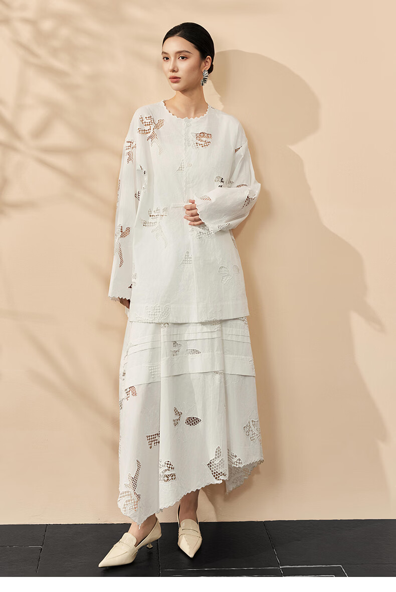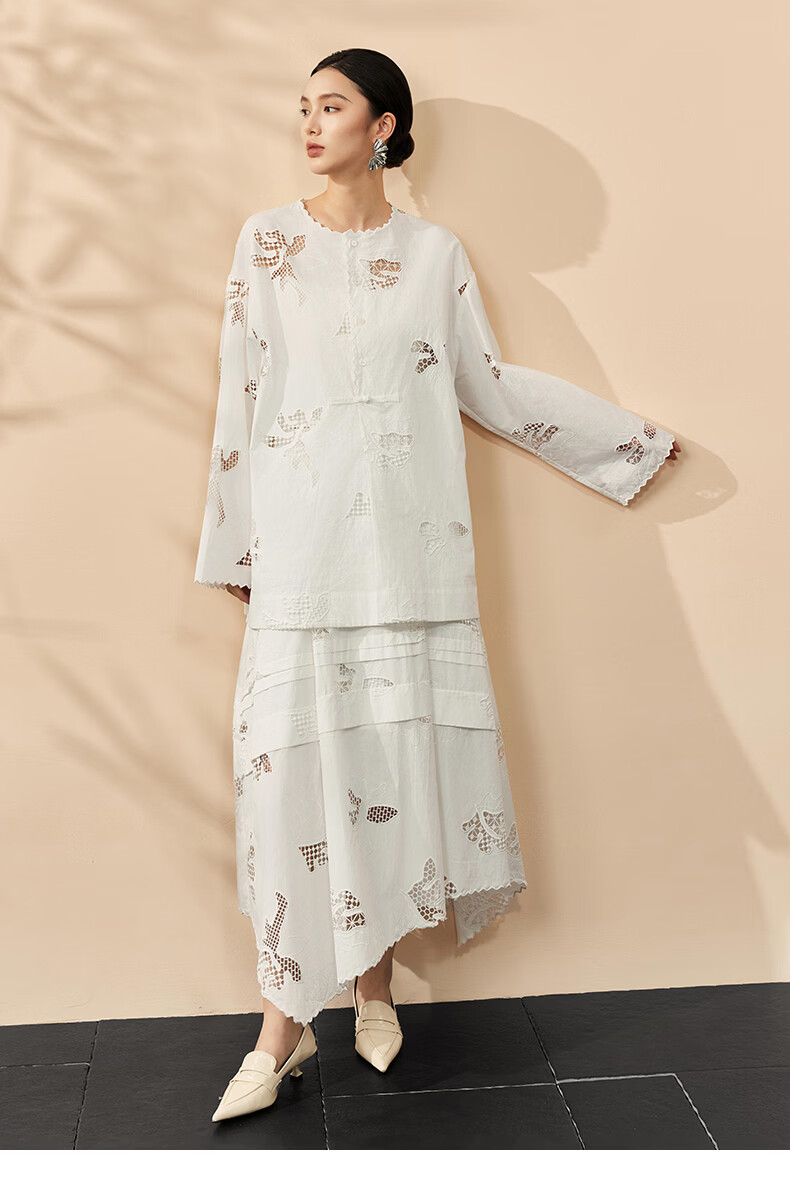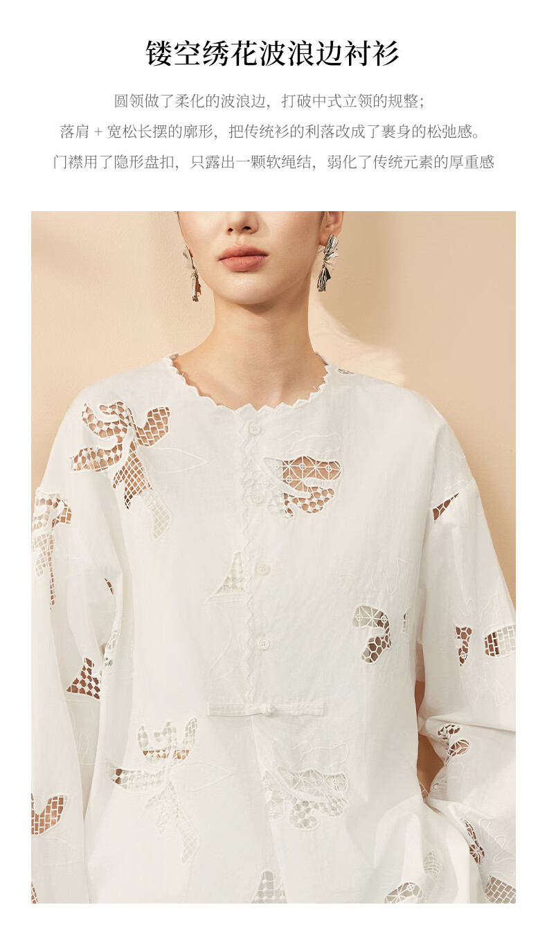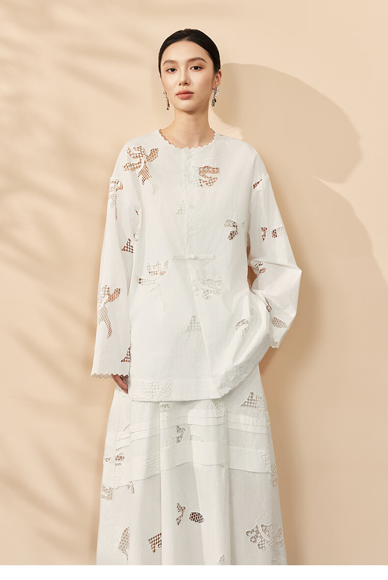 HECO Bai Qian Handmade Hollow Embroidery New Chinese Top National Style Women's Shirt 2026 Spring New Two-piece Suit White Shirt M