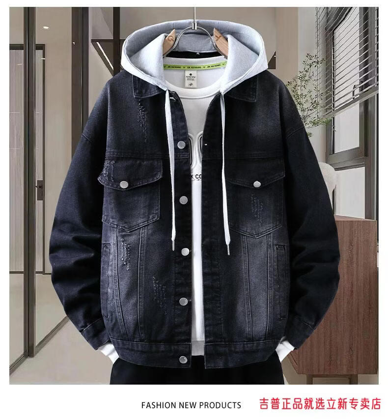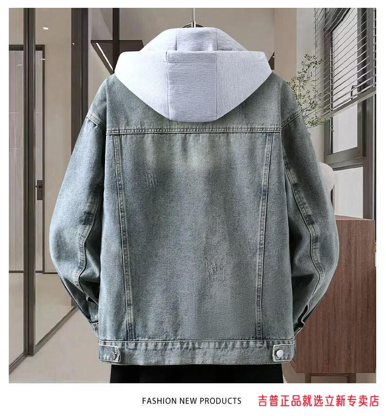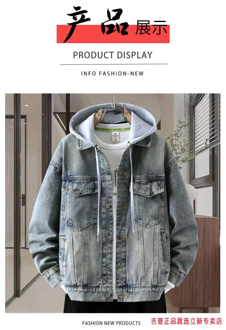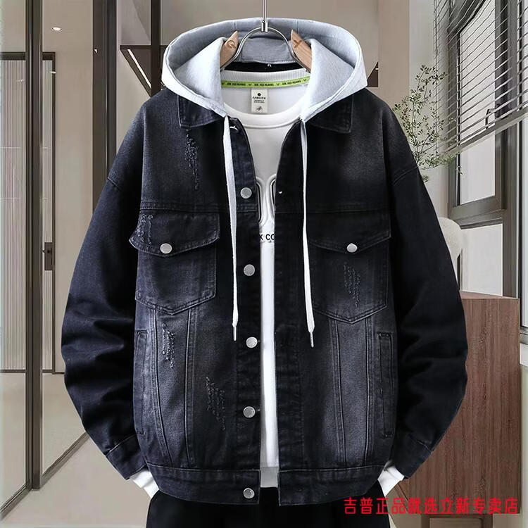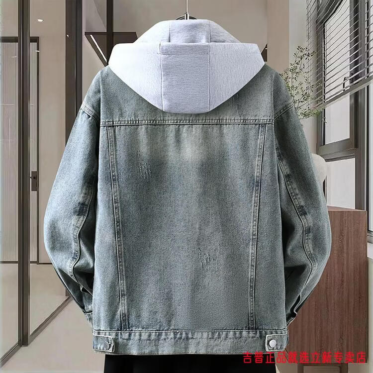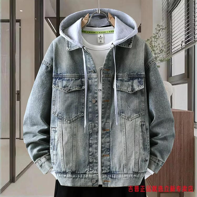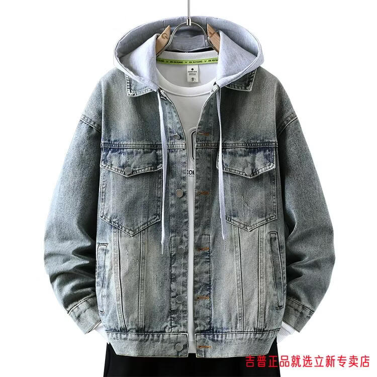 JEEP SPIRIT2026 Spring and Autumn Denim Jacket Boys' Sweater Trendy Loose Hooded Design Hong Kong Style Casual Handsome Jacket Plus Size Men's Clothing - Navy Blue M