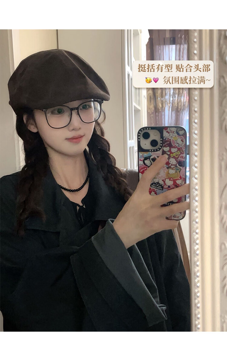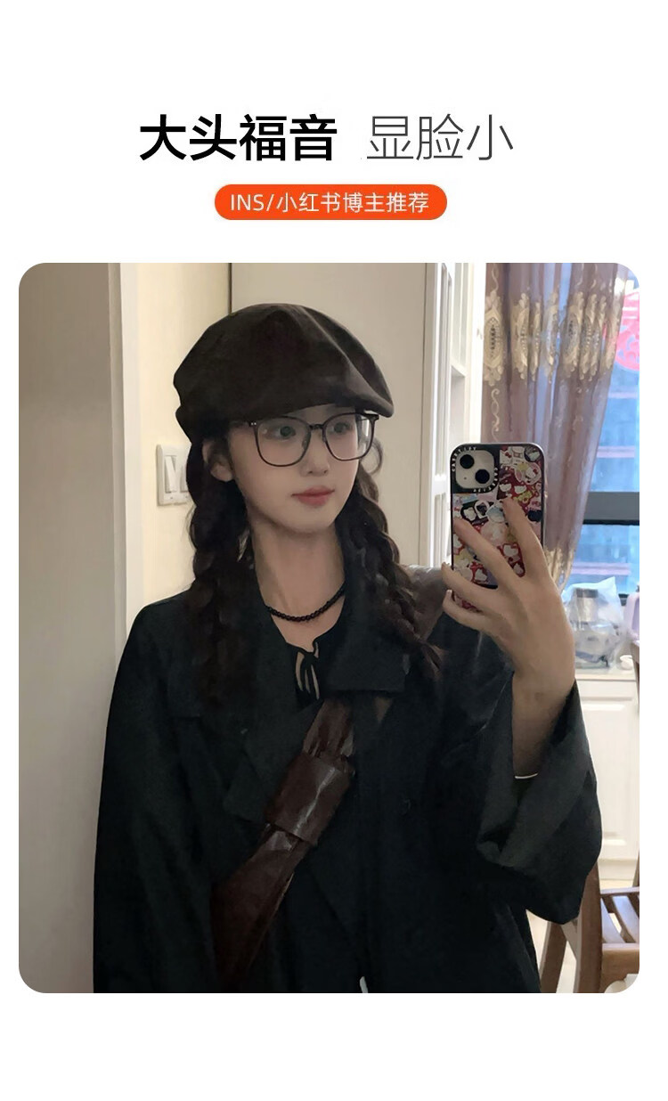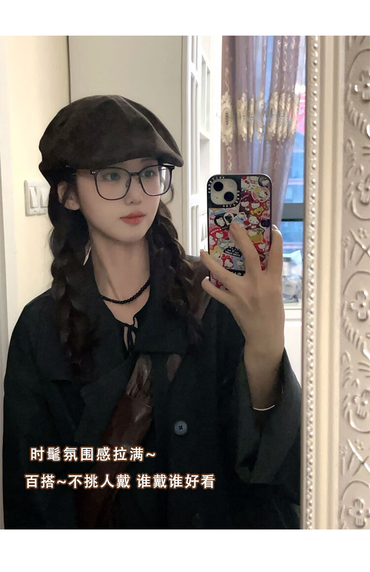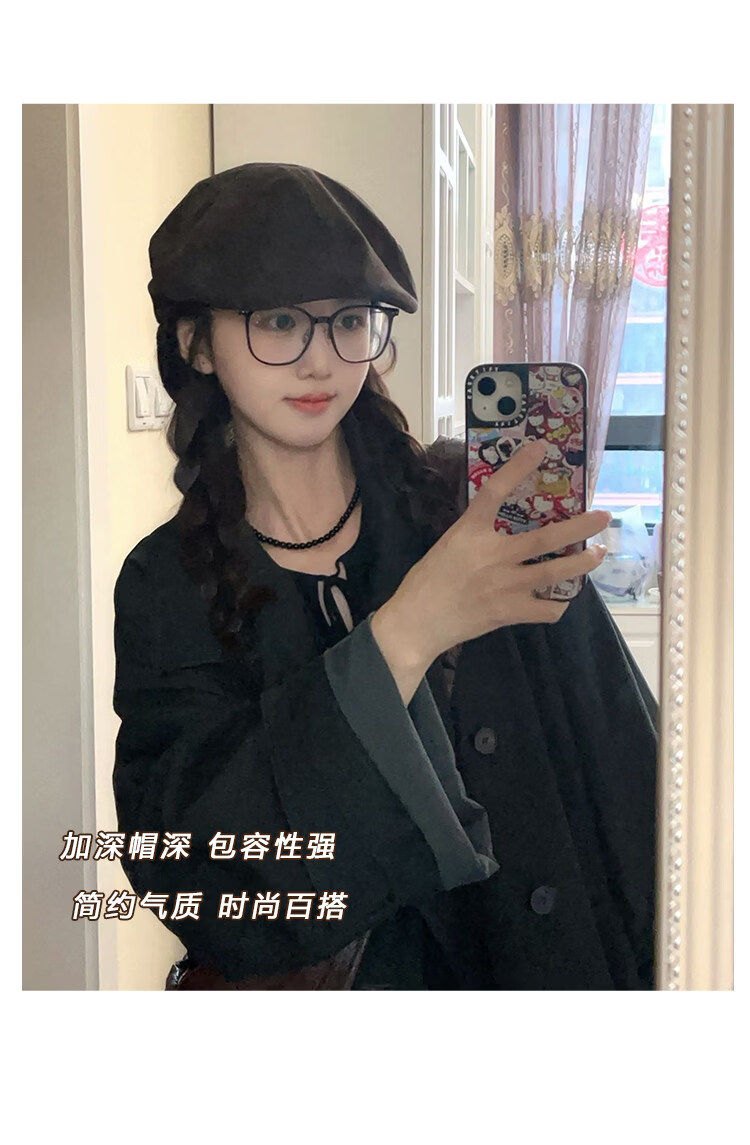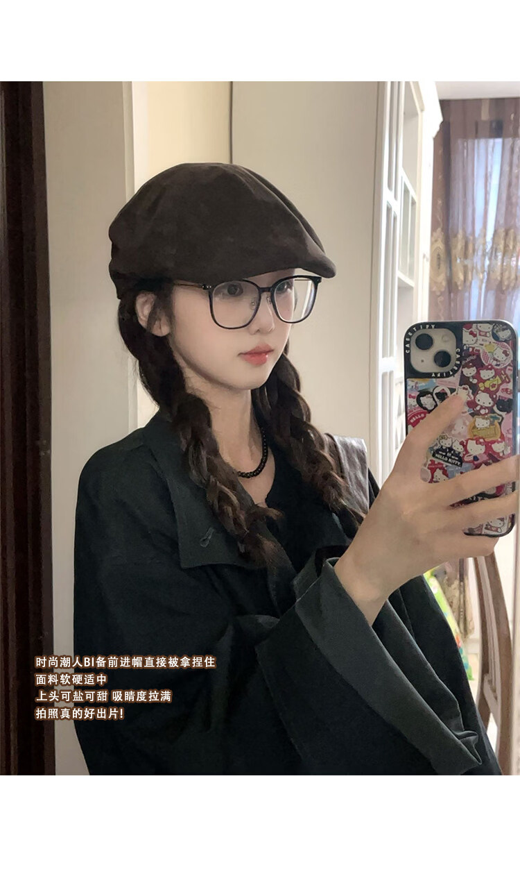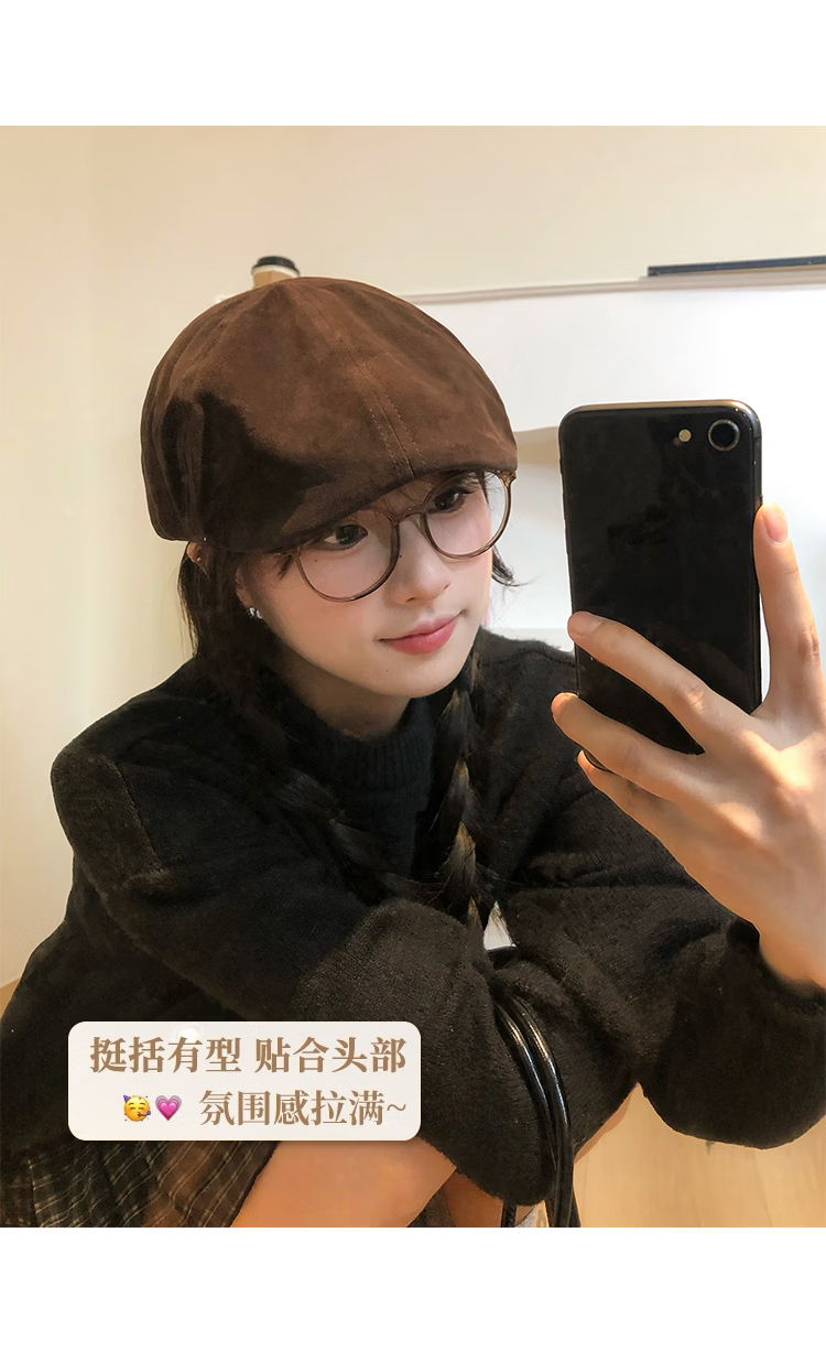 U&MUDI Japanese retro suede brown progressive hat for women with big head circumference and face, small literary and artistic versatile reverse beret hat trendy black one size (55-59cm)