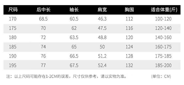 China (cm) 165 / 88-90 170 / 96-98 175 / 108-110 180 / 118-122 185 / 126-130