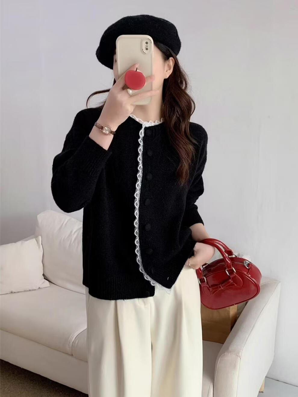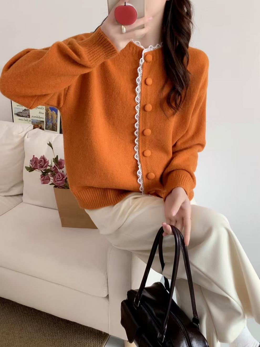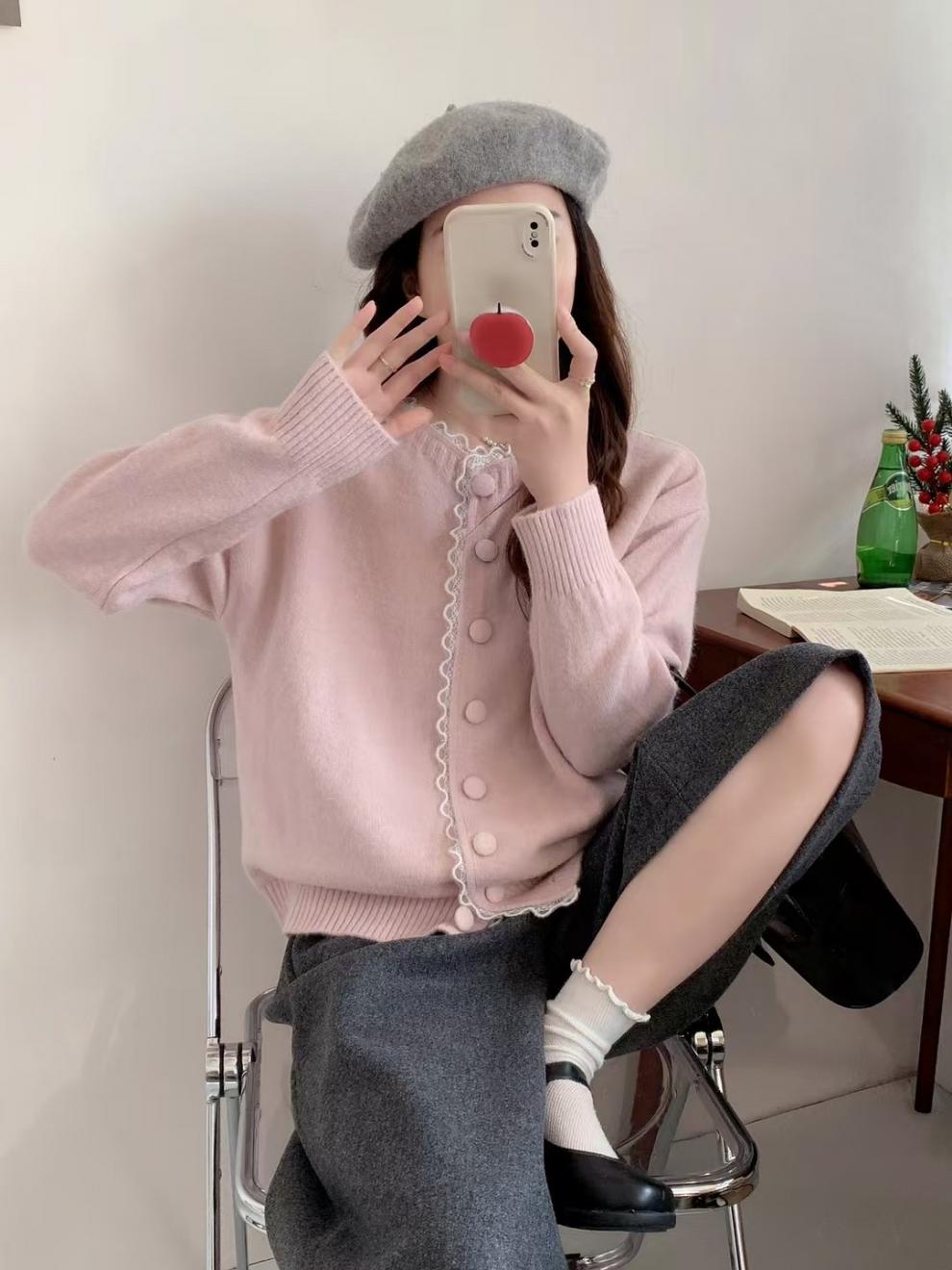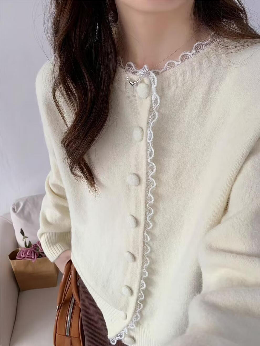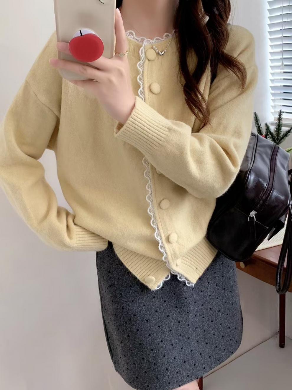 花花公子(PLAYBOY)法式春秋冬蕾丝花边时尚单排扣温柔风宽松甜美针织毛衣开衫外套女 浅黄色 S 建议70-95Jin Jin等于0.5千克