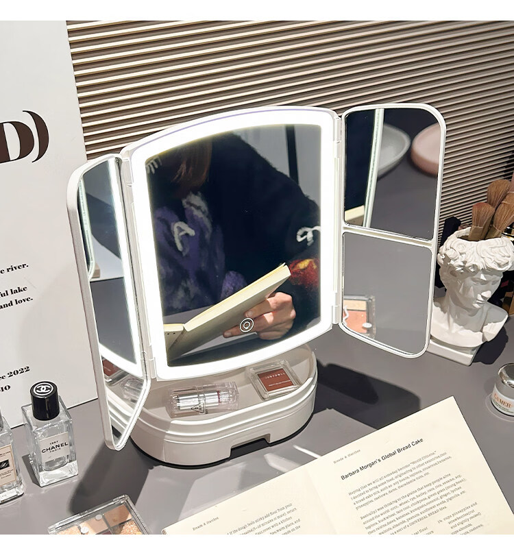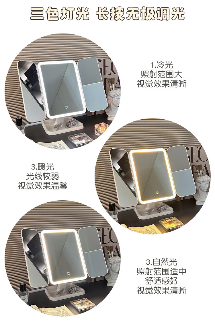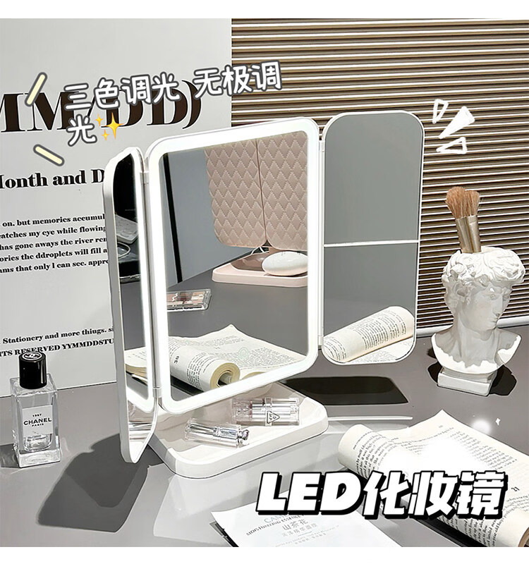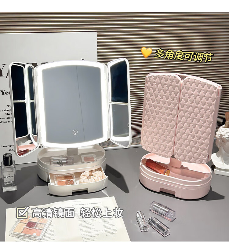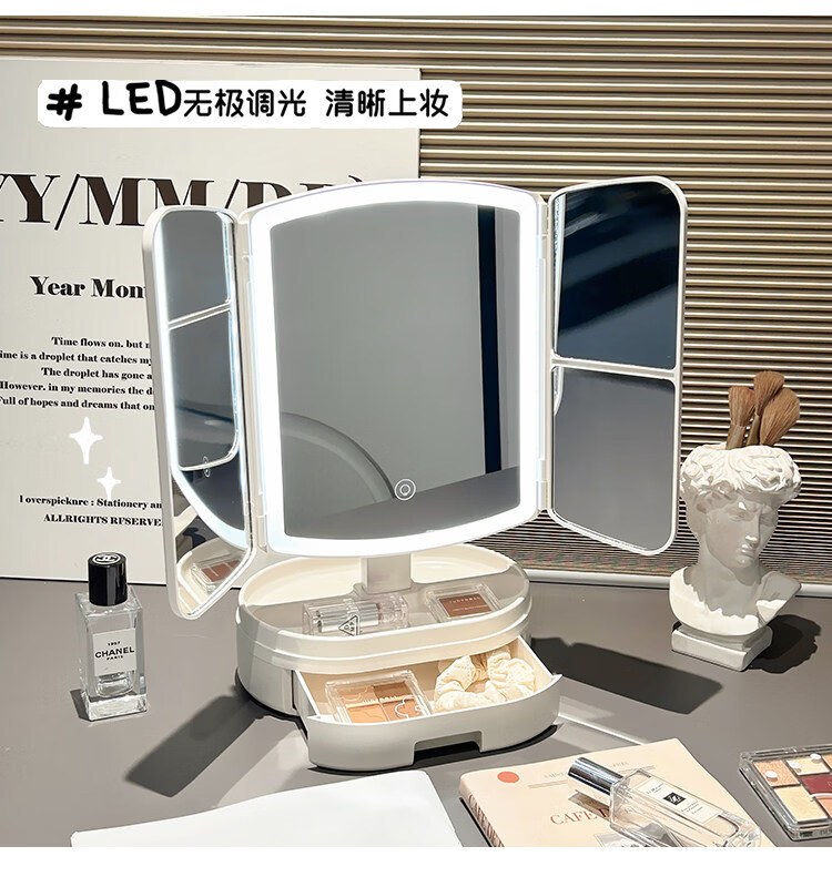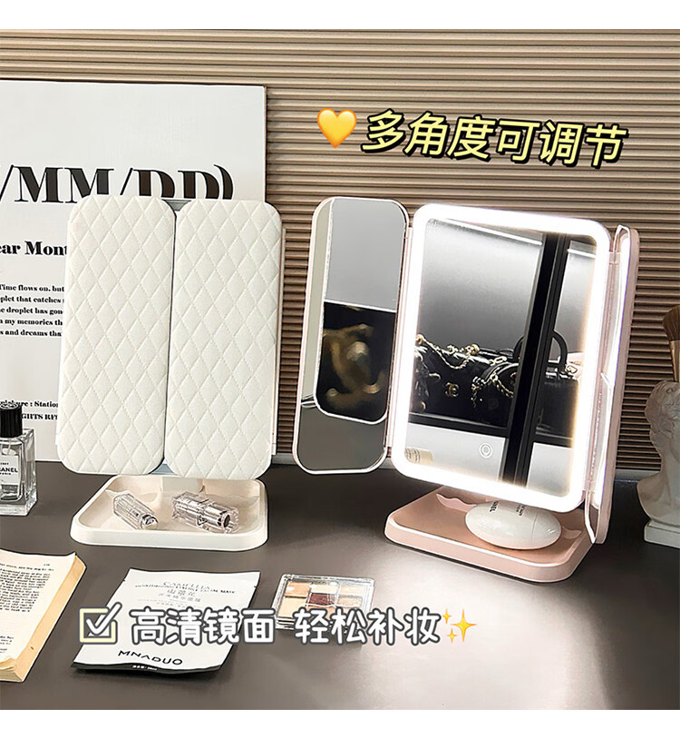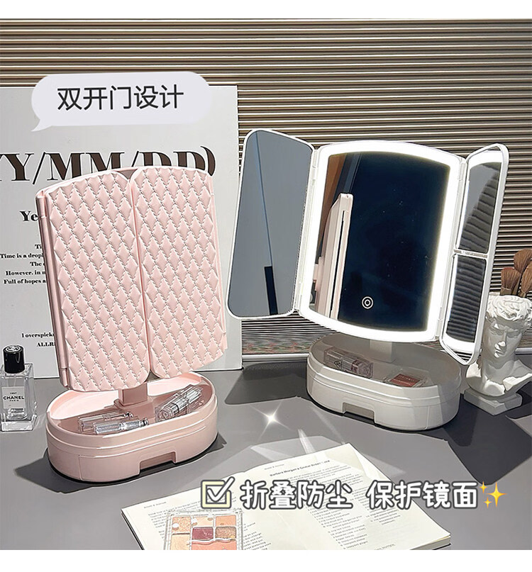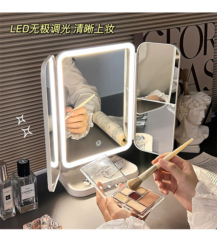 LED folding makeup mirror high-value makeup mirror student home bedroom desktop with light fill-in makeup mirror white-drawer three-color light
