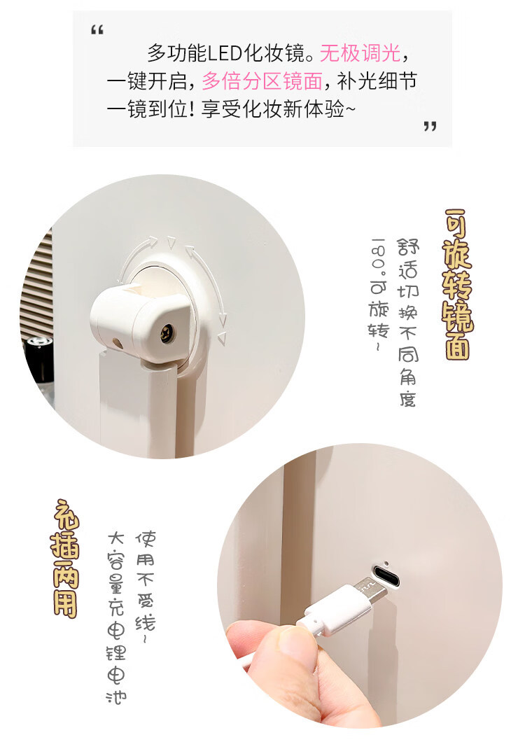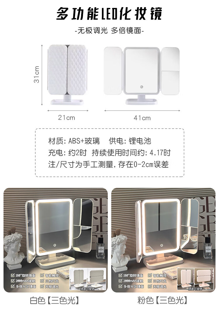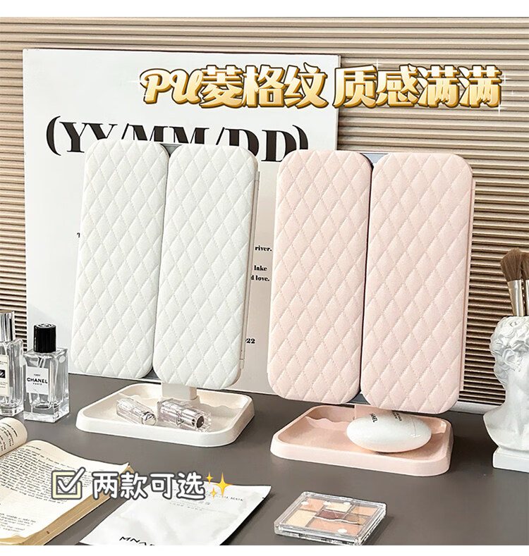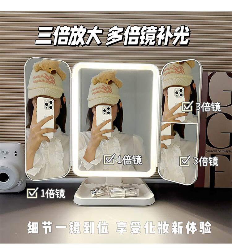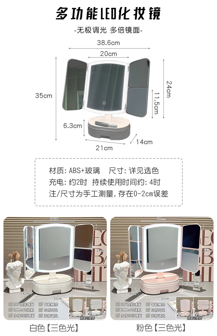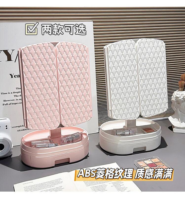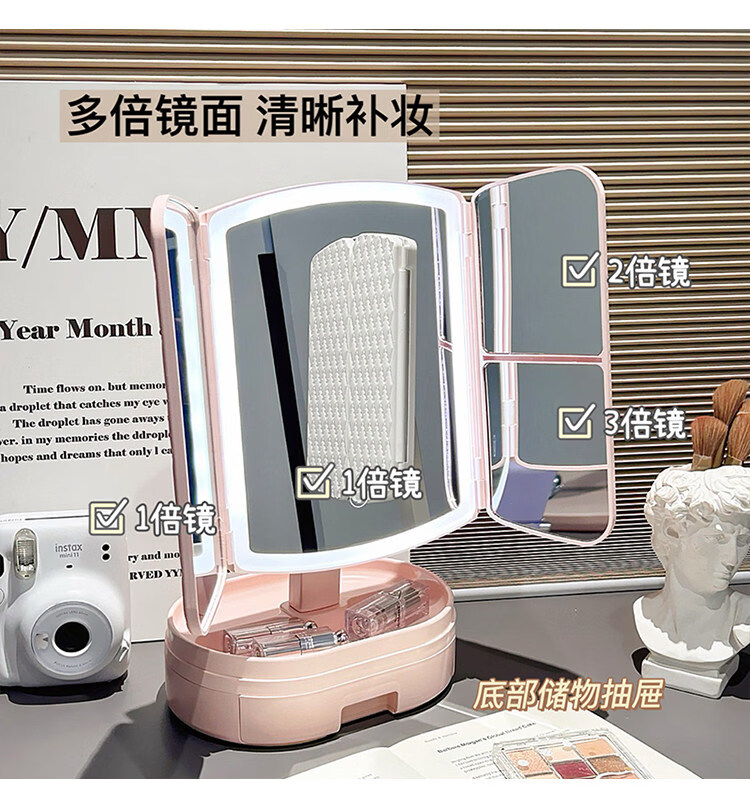 LED folding makeup mirror high-value makeup mirror student home bedroom desktop with light fill-in makeup mirror white-drawer three-color light