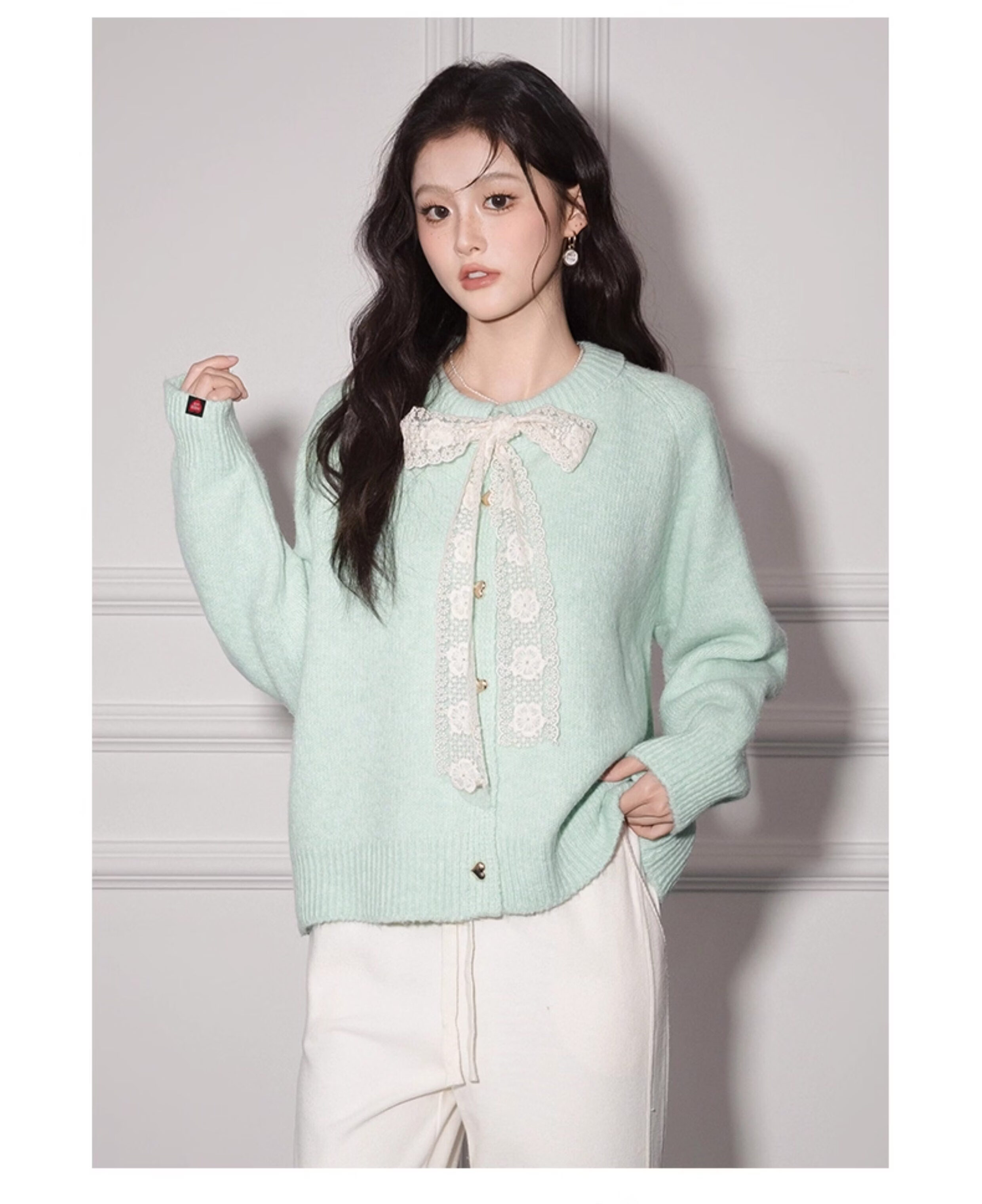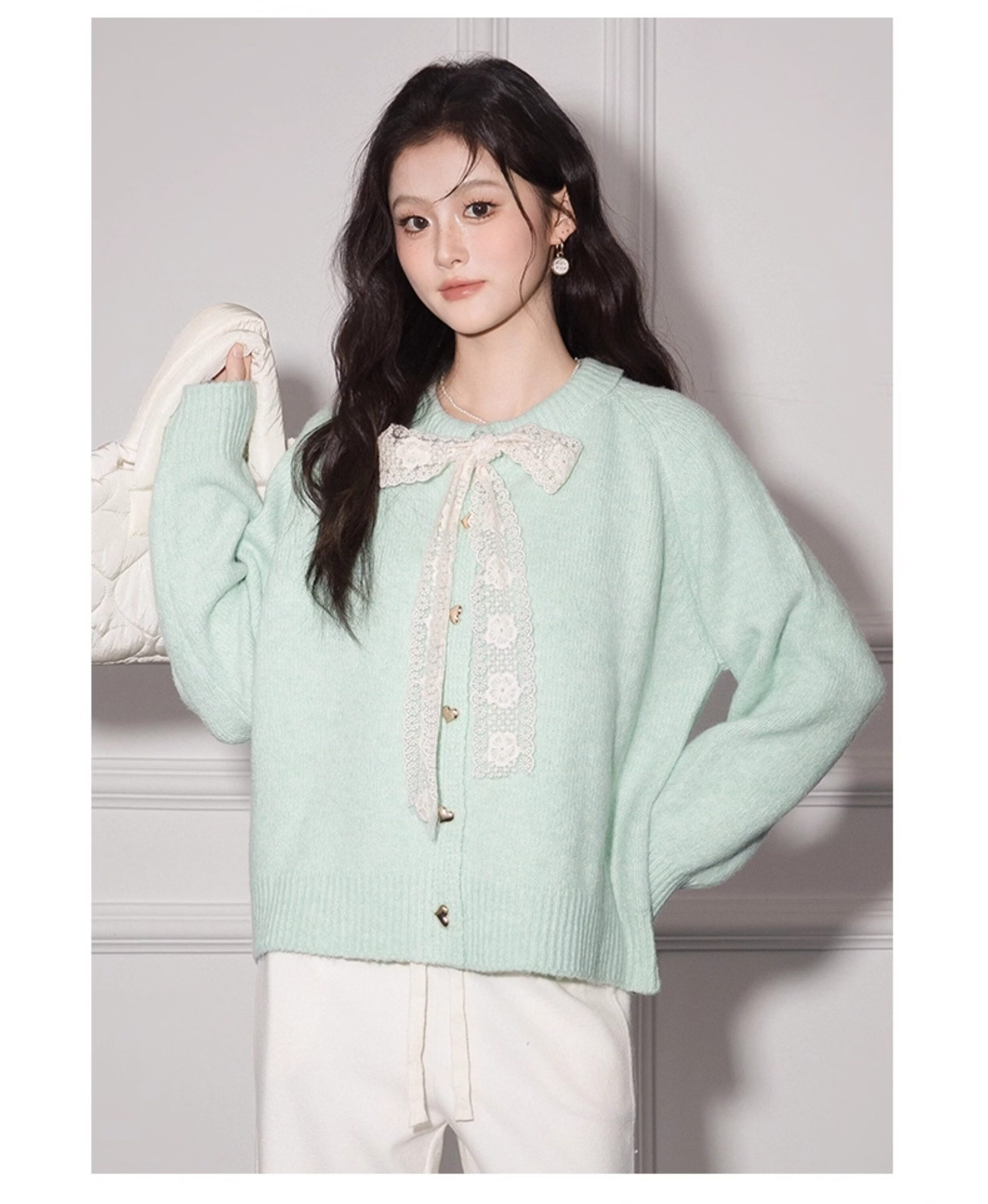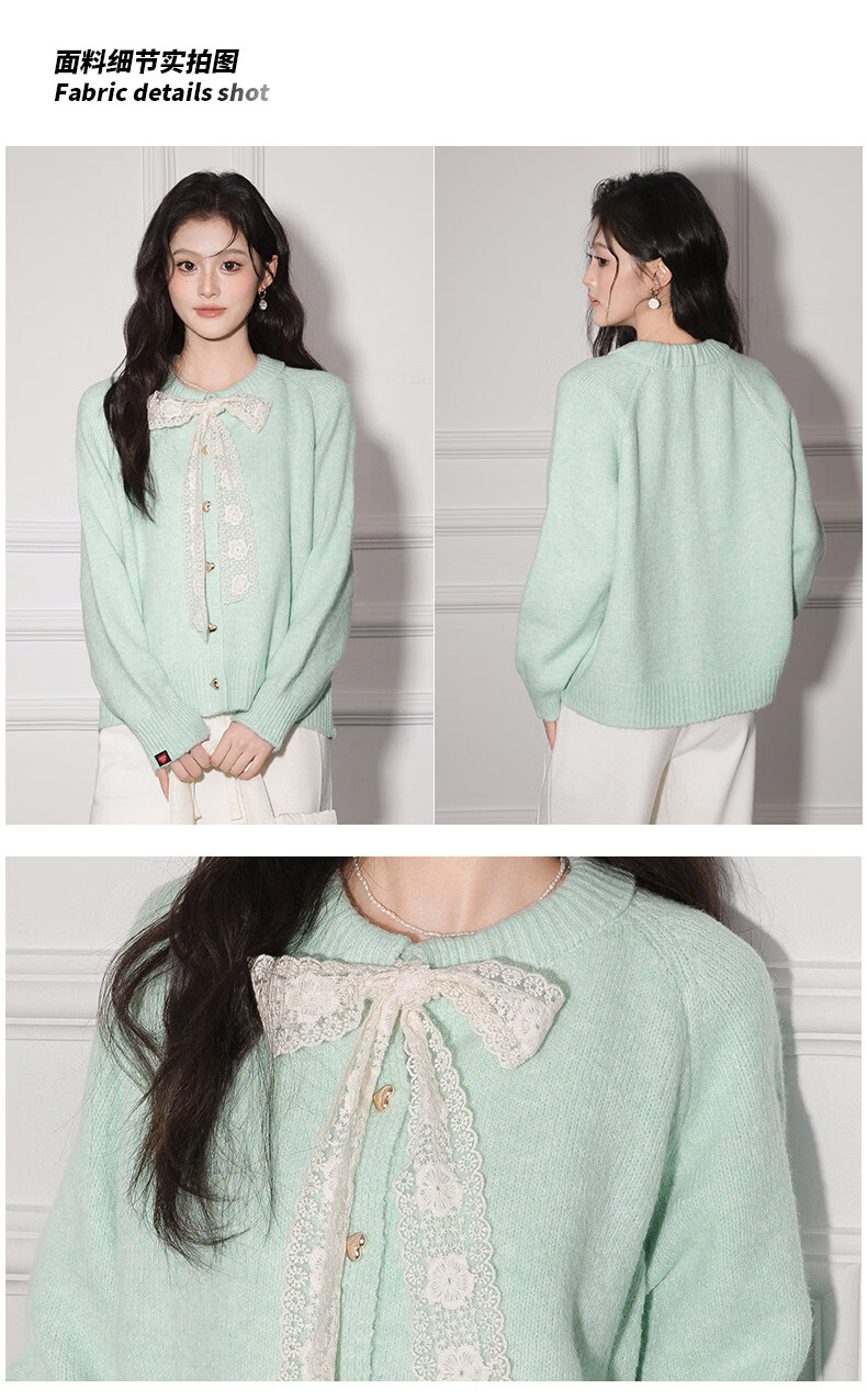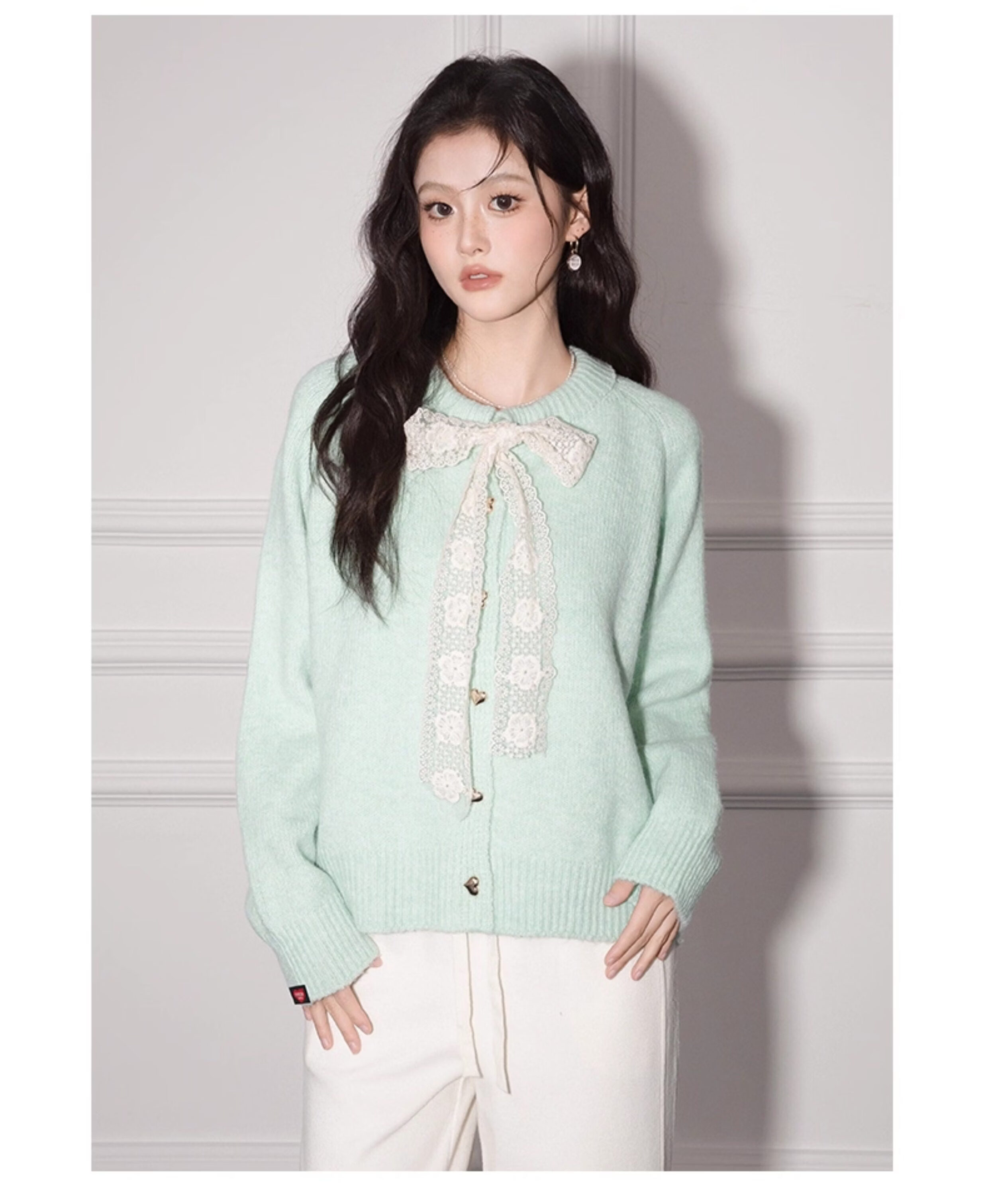 CHOCOOLATE it Women's Round Neck Bow Sweater Women's 2026 Spring New Loose Versatile High-Quality Knitted Jacket Women's Blue One Size