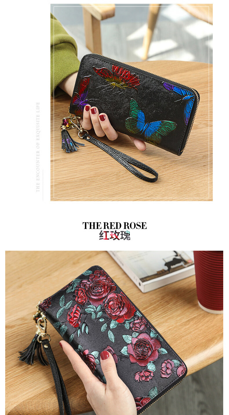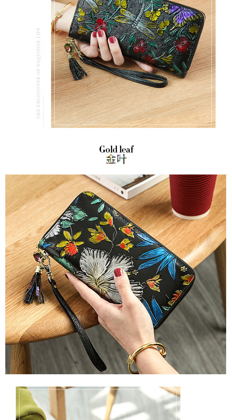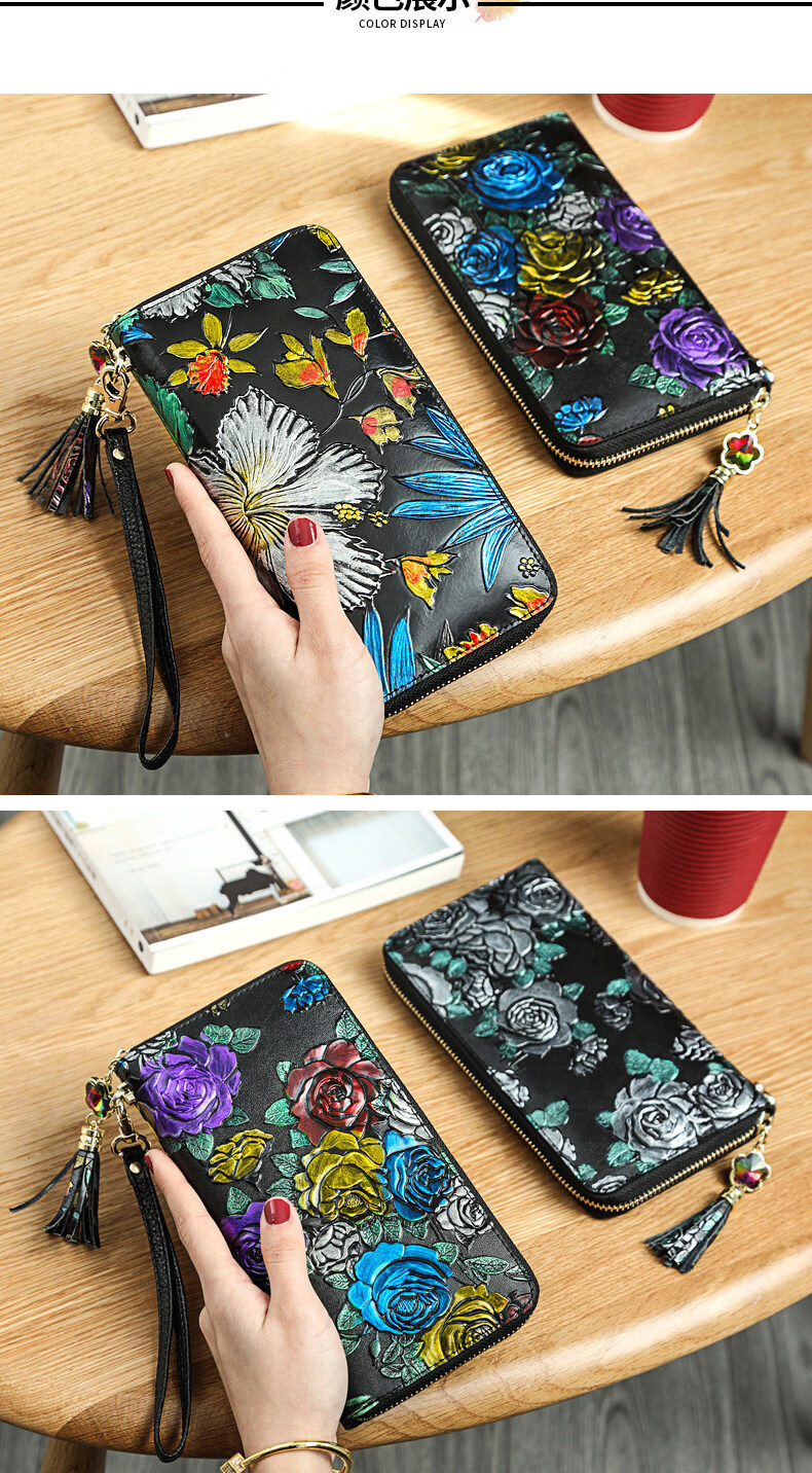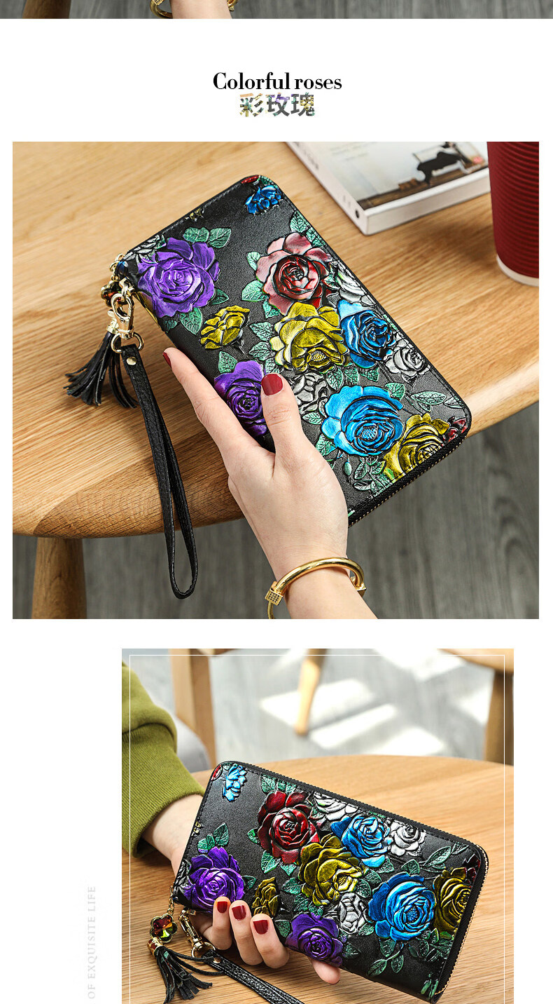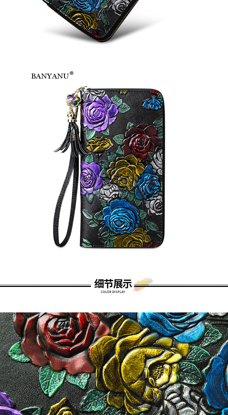 Banyanu 2025 new women's wallet women's long personalized painted large-capacity cowhide zipper women's clutch wallet trendy color rose-anti-theft brush