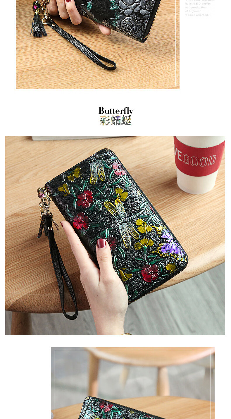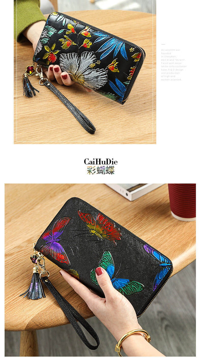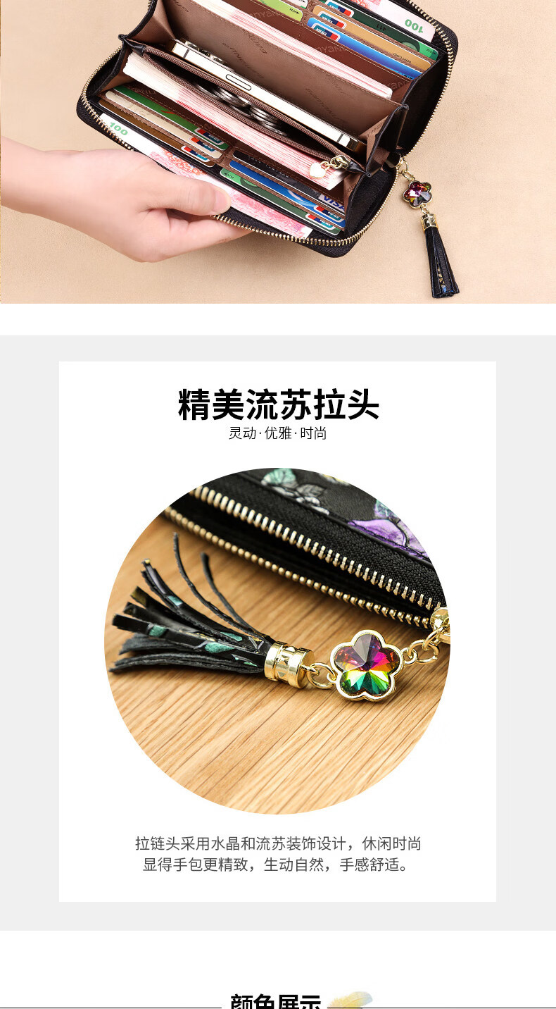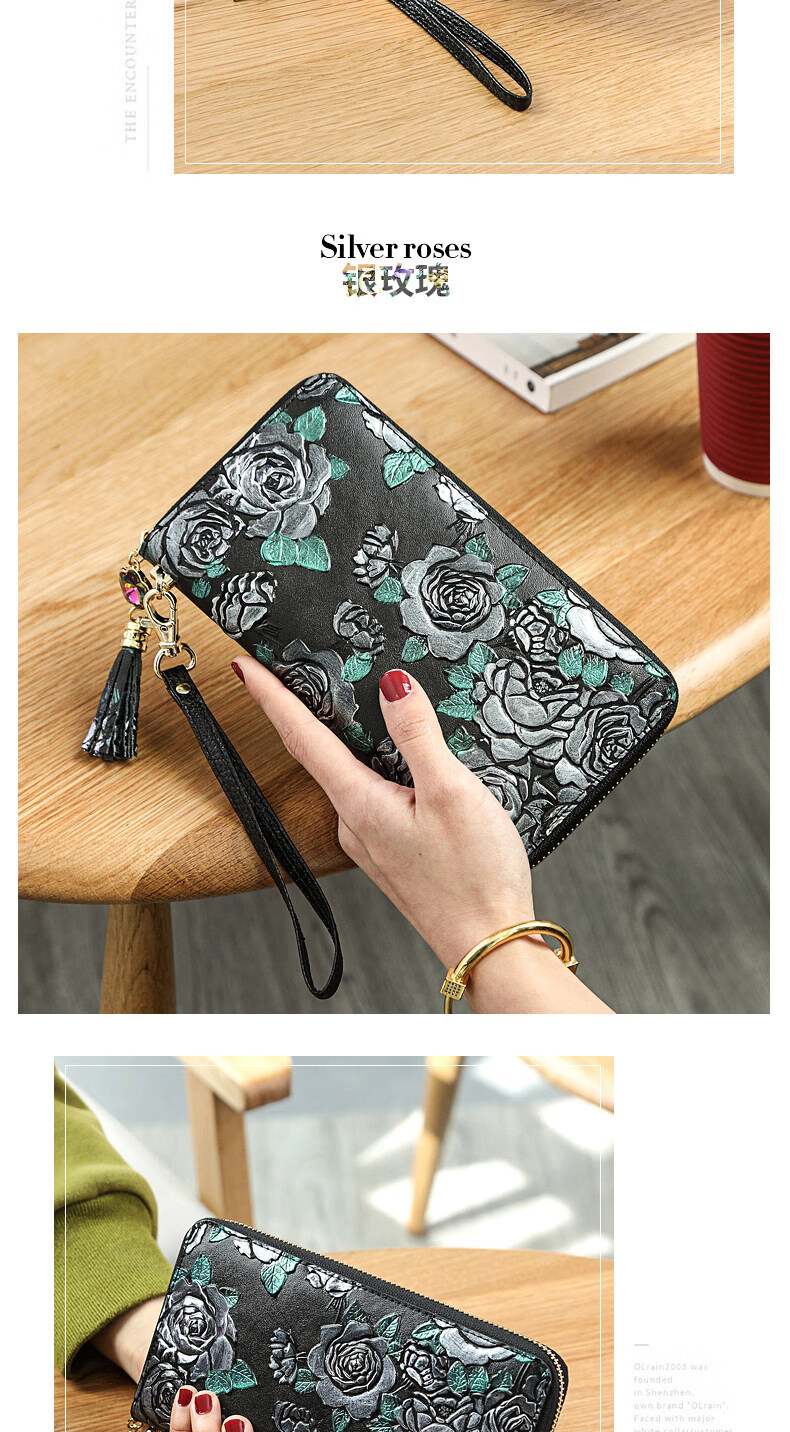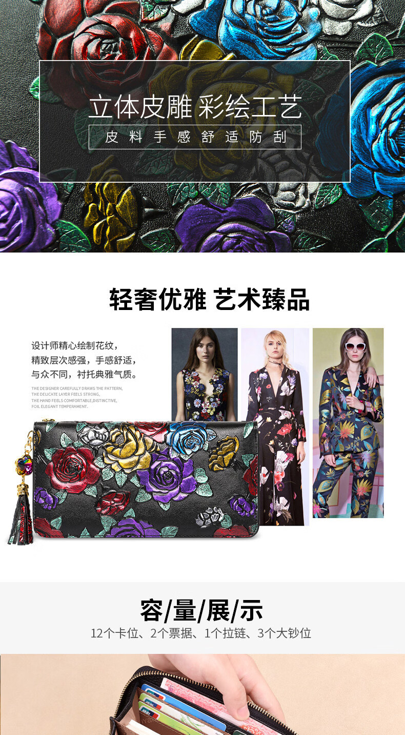 Banyanu 2025 new women's wallet women's long personalized painted large-capacity cowhide zipper women's clutch wallet trendy color rose-anti-theft brush