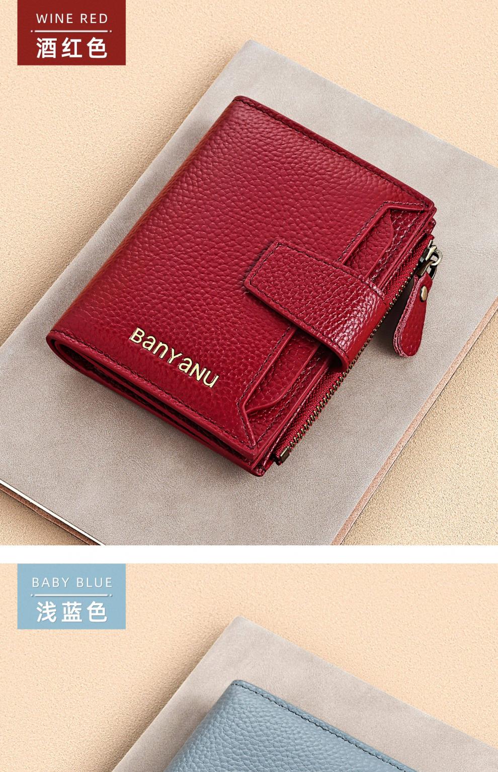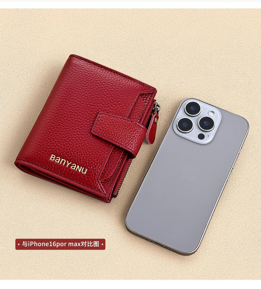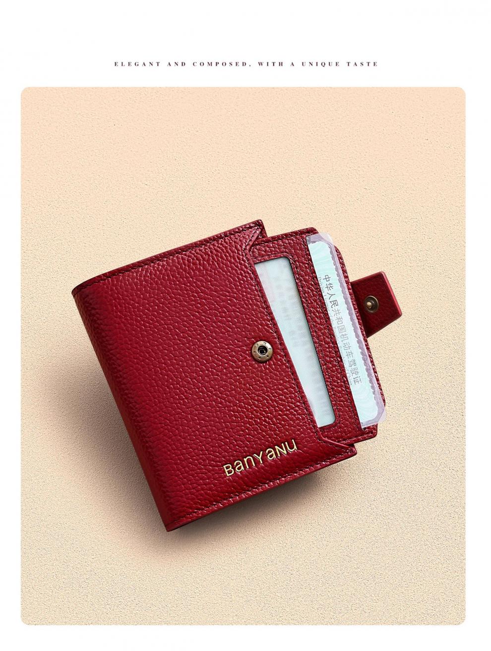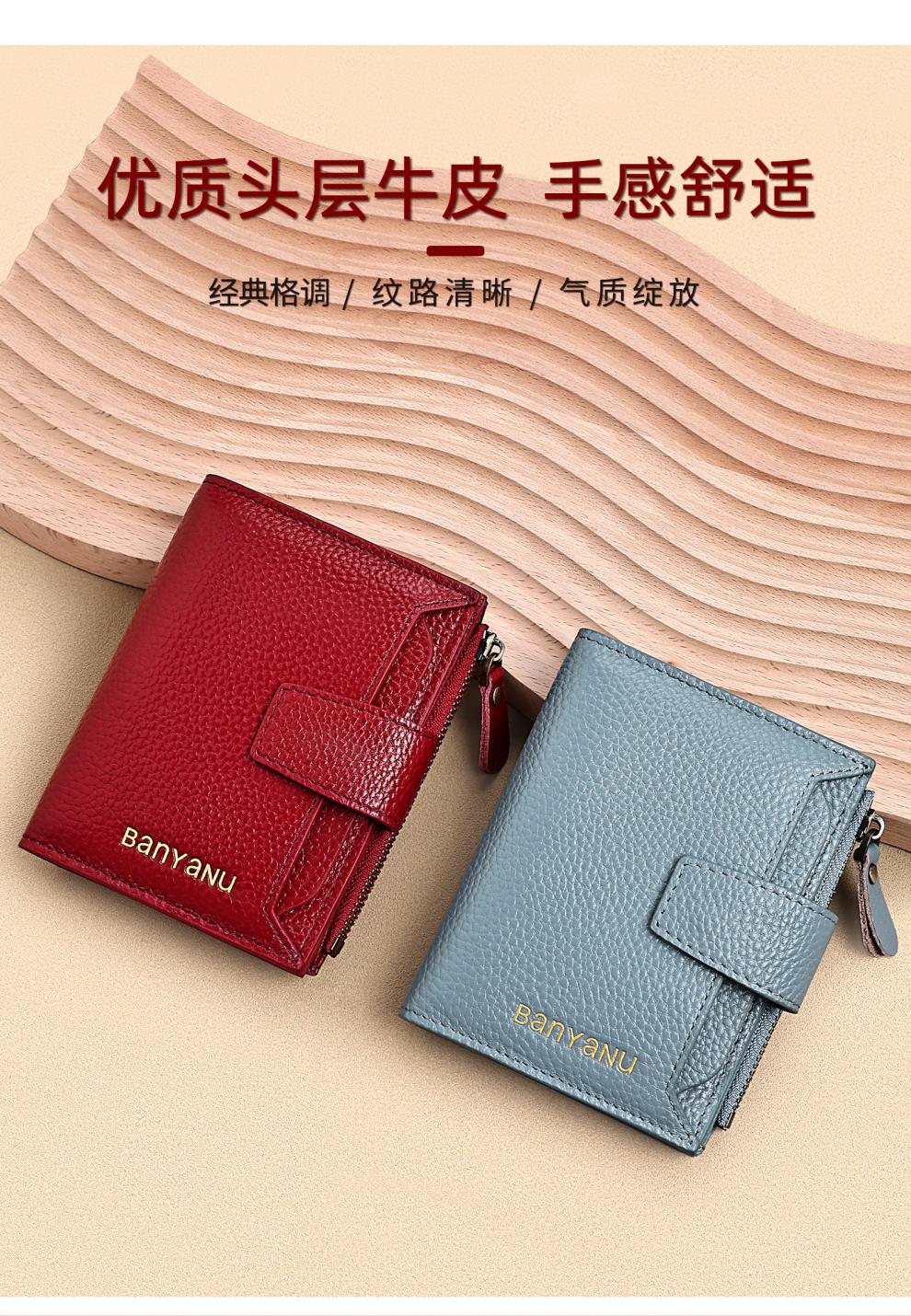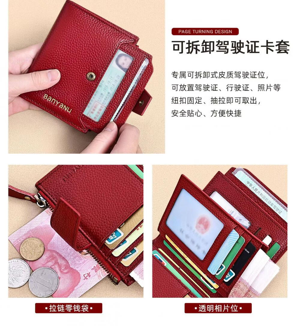 Banyanu pebbled cowhide short clip for women, genuine leather with multiple card slots, independent driver's license card holder, zipper coin purse for women, burgundy first-layer cowhide - anti-theft brush