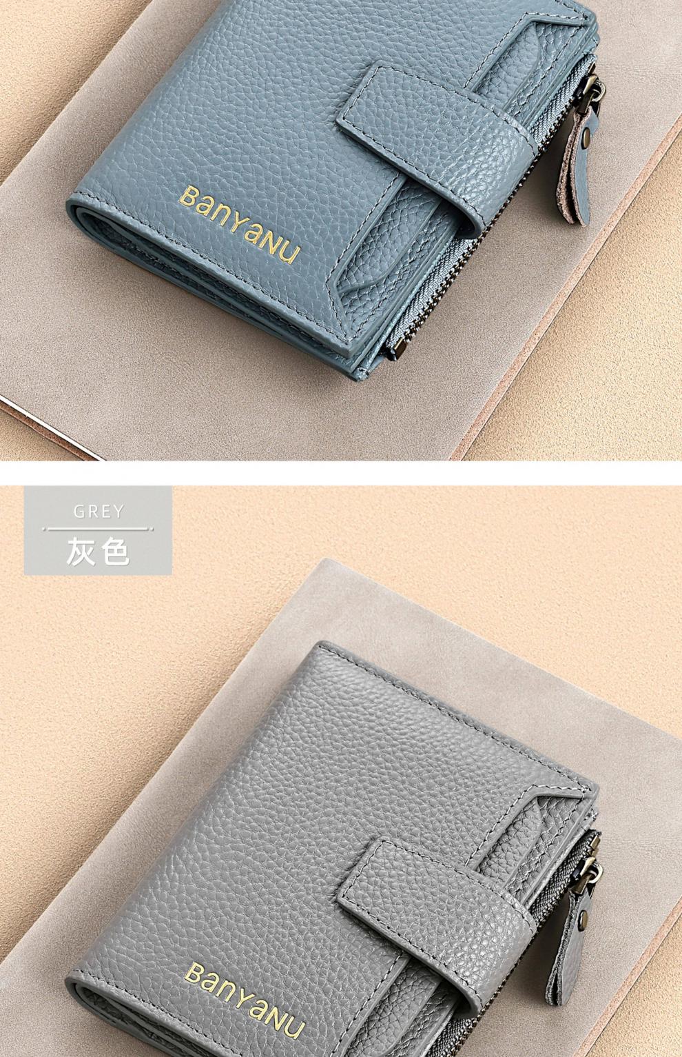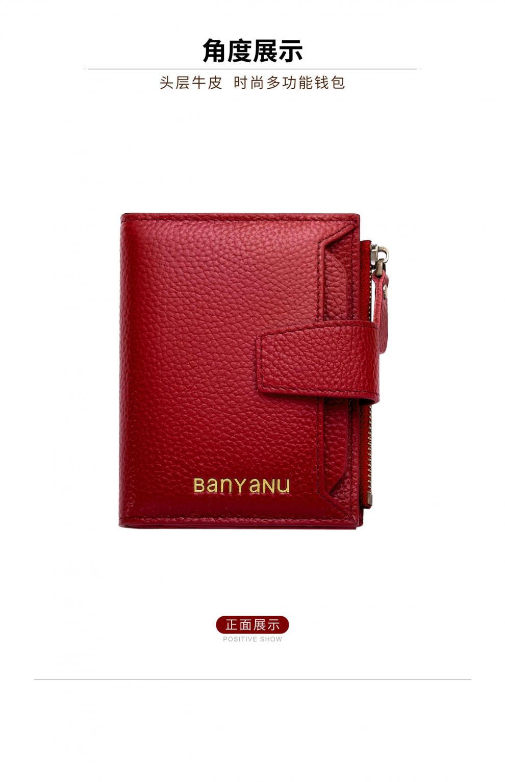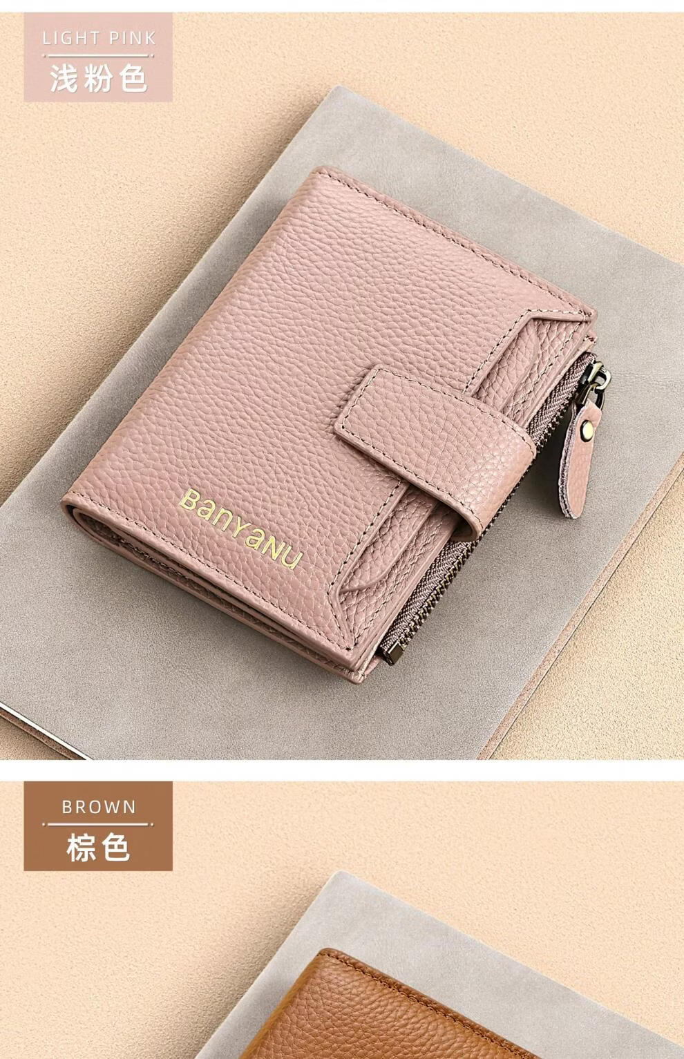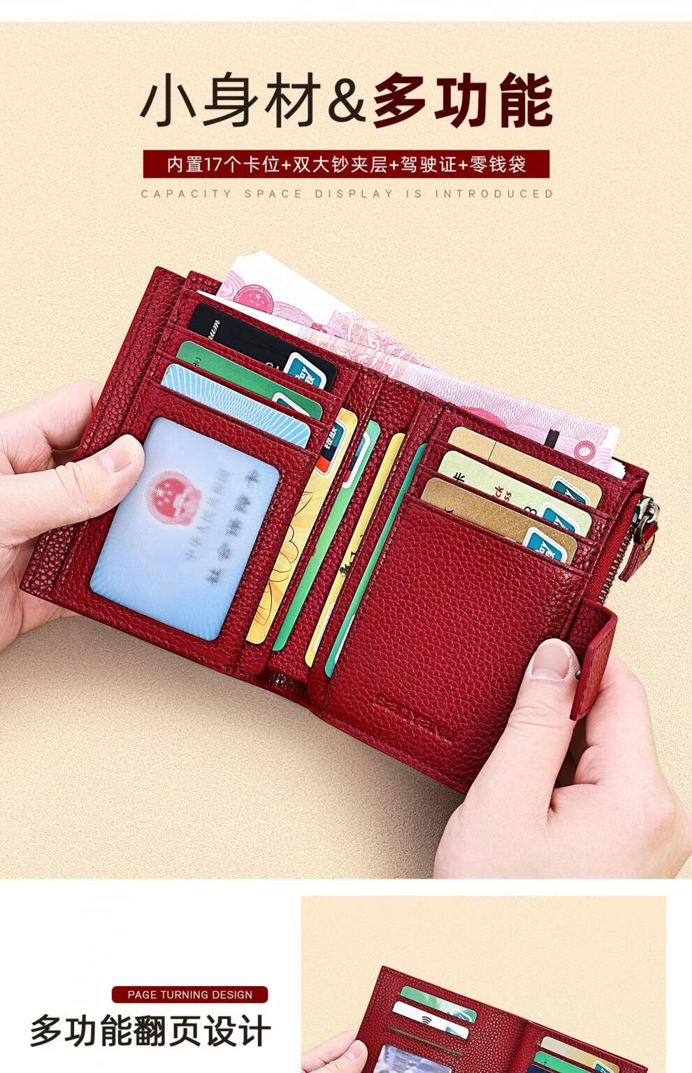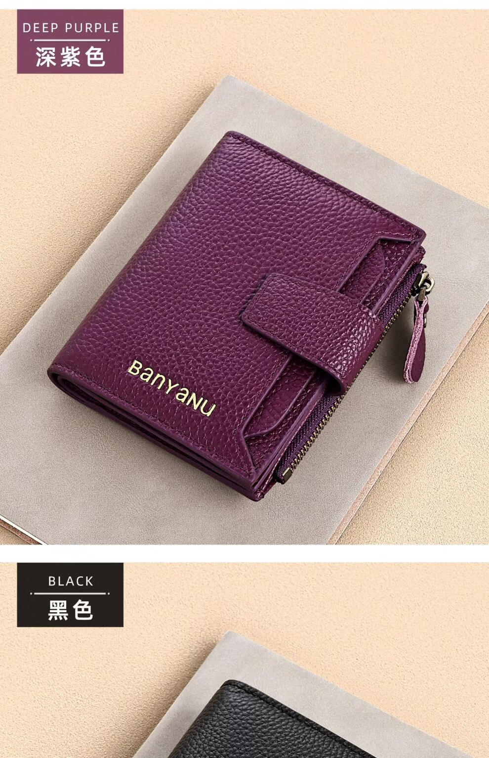 Banyanu pebbled cowhide short clip for women, genuine leather with multiple card slots, independent driver's license card holder, zipper coin purse for women, burgundy first-layer cowhide - anti-theft brush