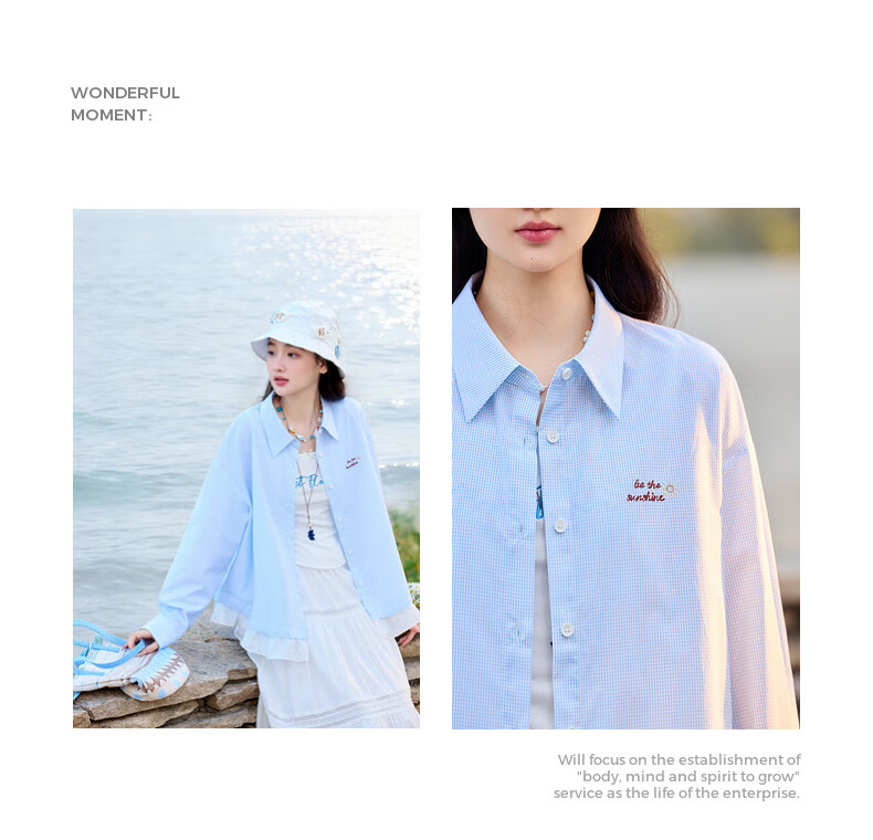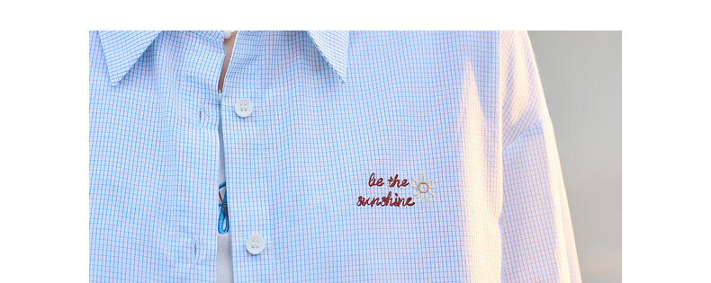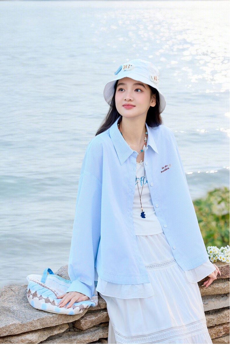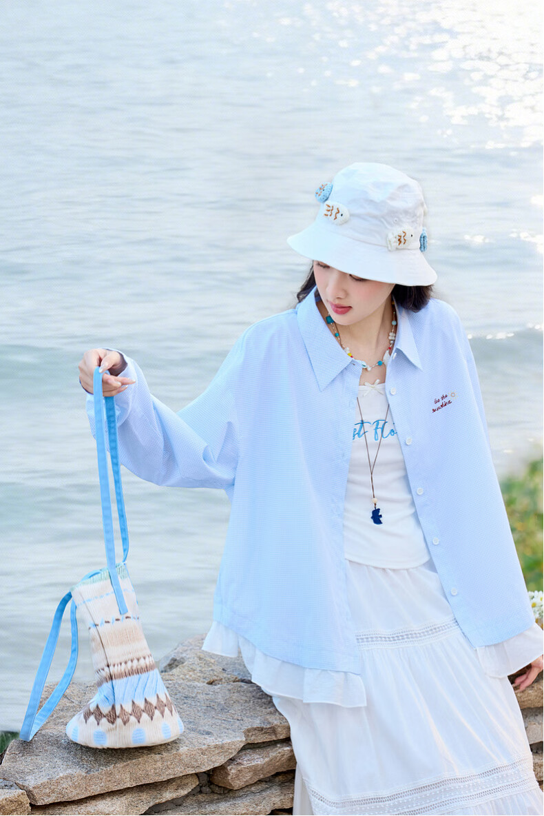 Zihan (ZIHAN) Zihan blue plaid shirt for women 2026 spring new style fungus hem hem stitched embroidered loose flesh-covering shirt Tide Blue XS