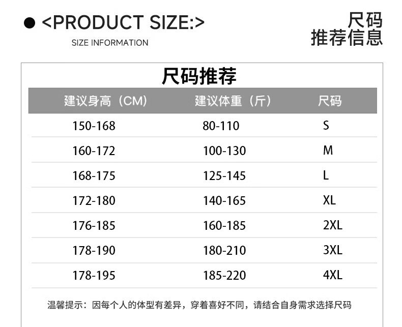 China (cm) 165 / 88-90 170 / 96-98 175 / 108-110 180 / 118-122 185 / 126-130