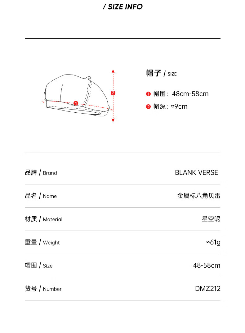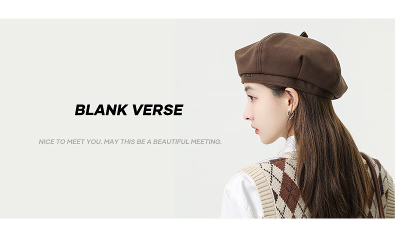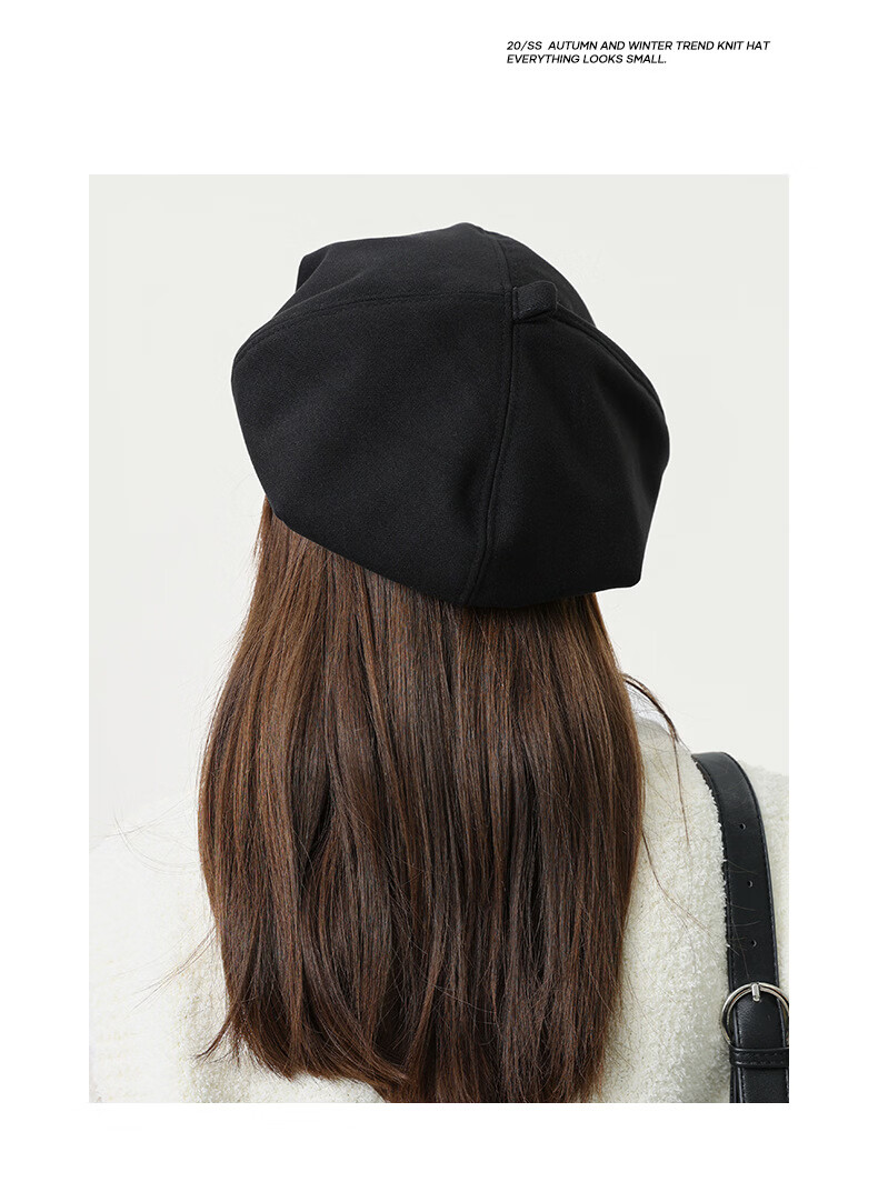 BLANK VERSE autumn and winter woolen metal beret hat women's octagonal hat big head circumference showing face small fashionable literary painter hat flat top black-DMZ304 one size