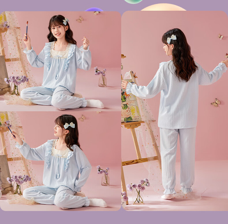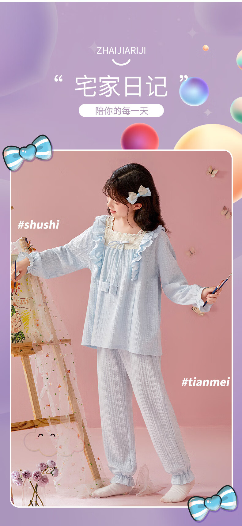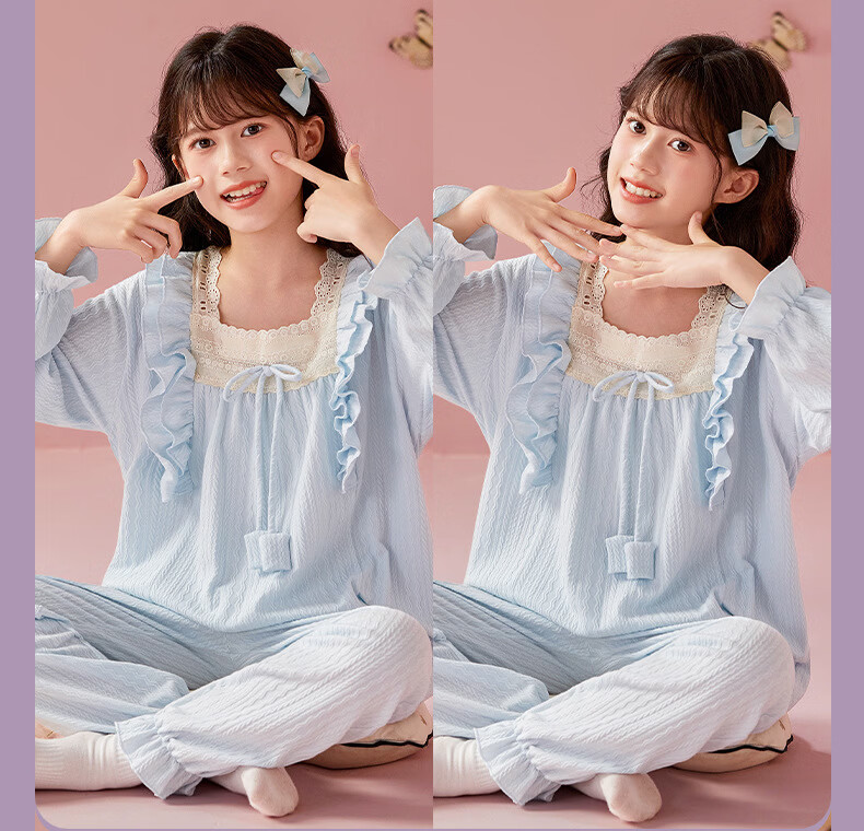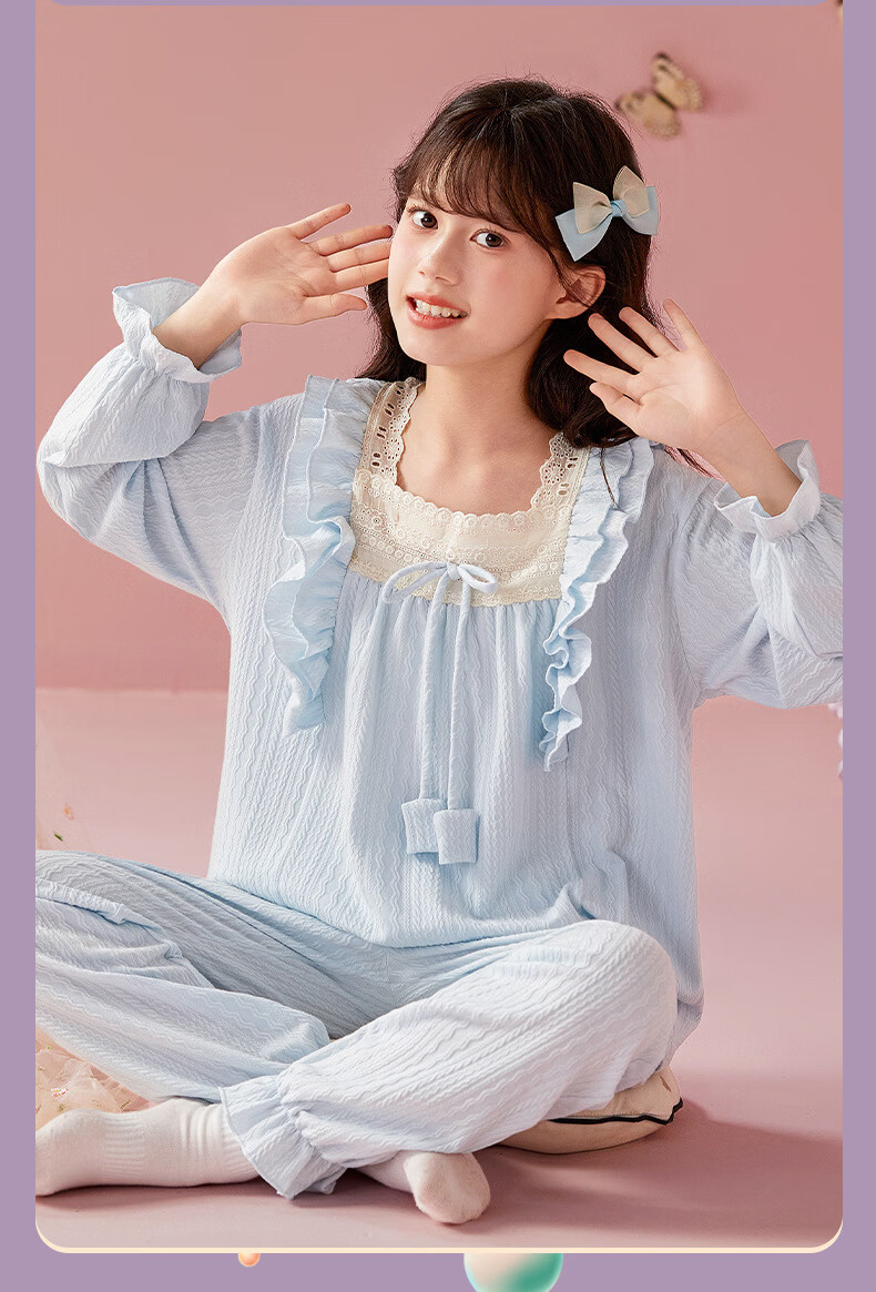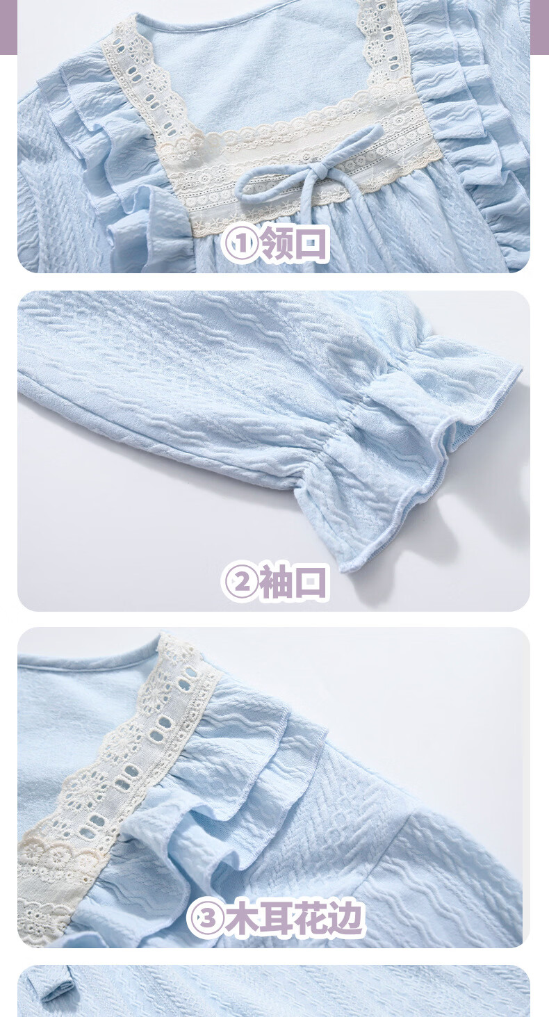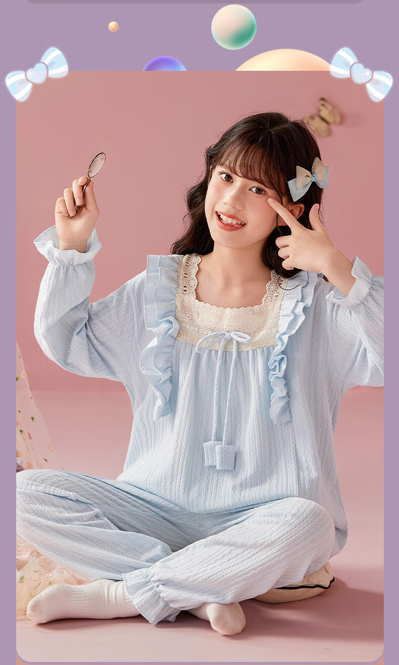 MiiOW children's pajamas girls pure cotton long-sleeved spring, autumn and winter palace-style big children's and girls' home wear suits with chest pads 44300# ice blue 170 size 12 (recommended height 115-125CM. Weight 50Jin Jin is equal to about 0.5 kg
