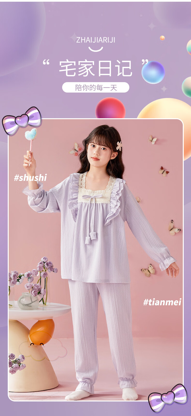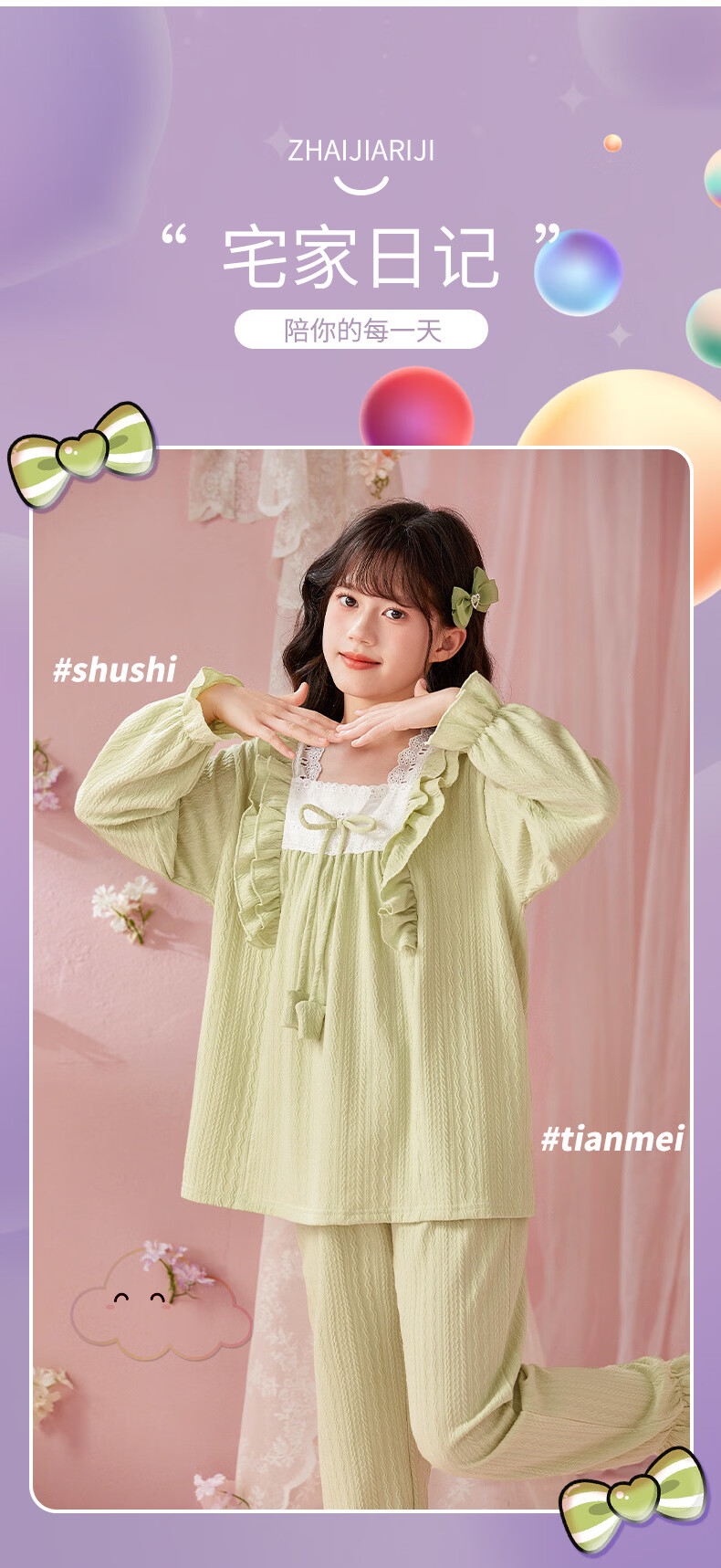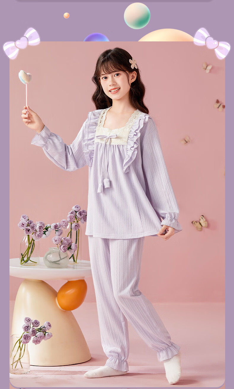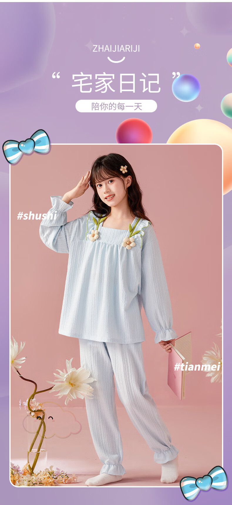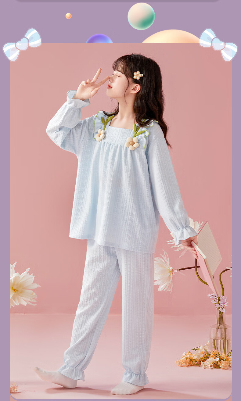 MiiOW children's pajamas girls pure cotton long-sleeved spring, autumn and winter palace-style big children's and girls' home wear suits with chest pads 44300# ice blue 170 size 12 (recommended height 115-125CM. Weight 50Jin Jin is equal to about 0.5 kg