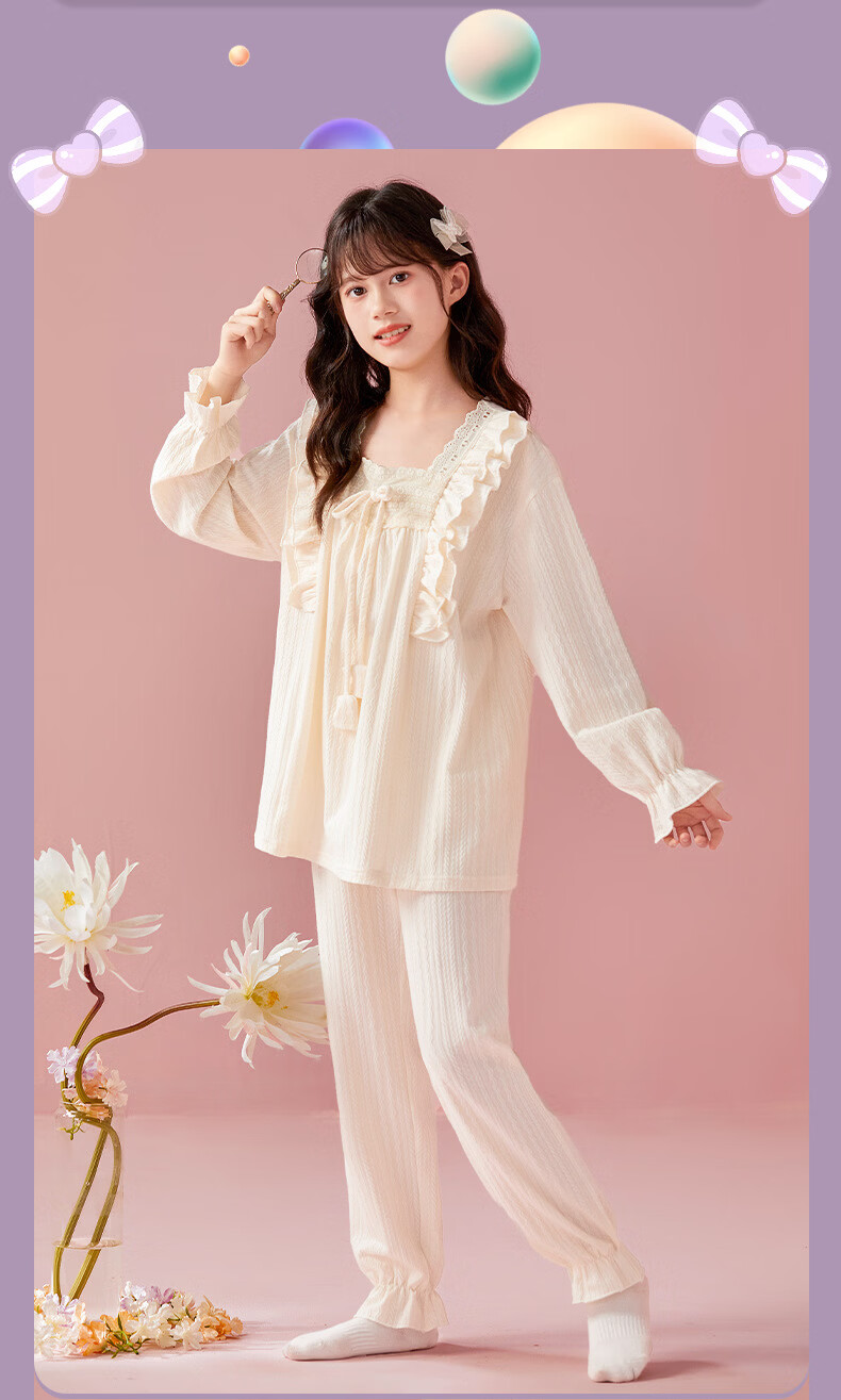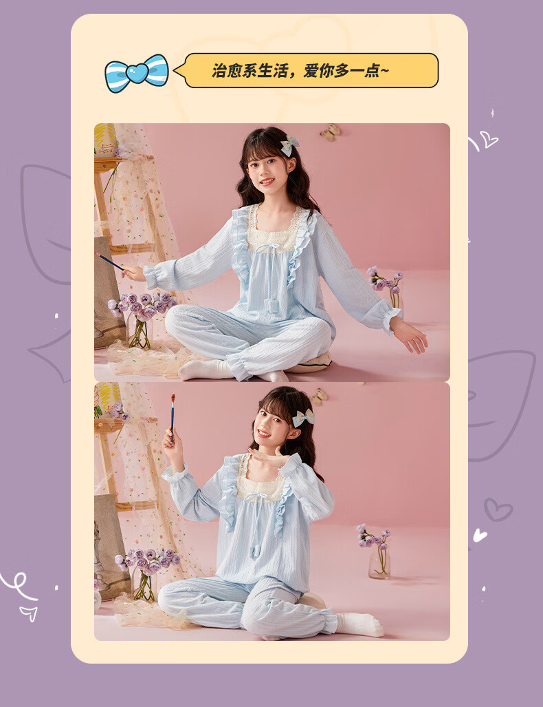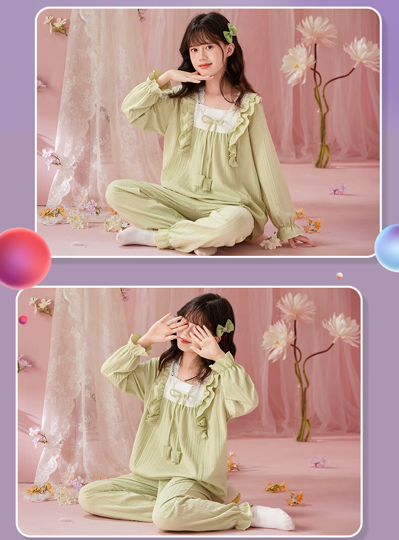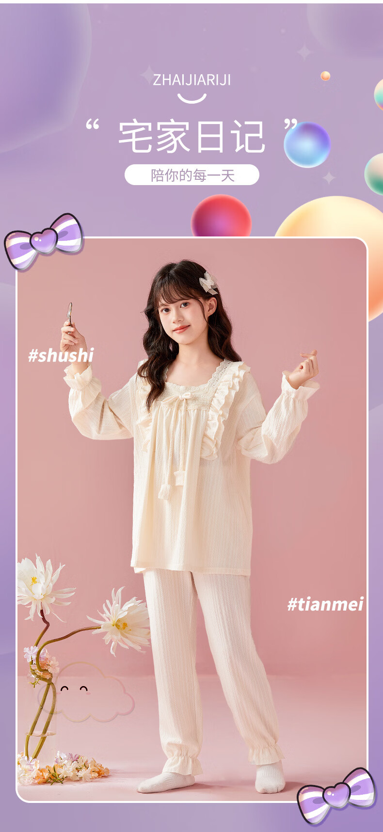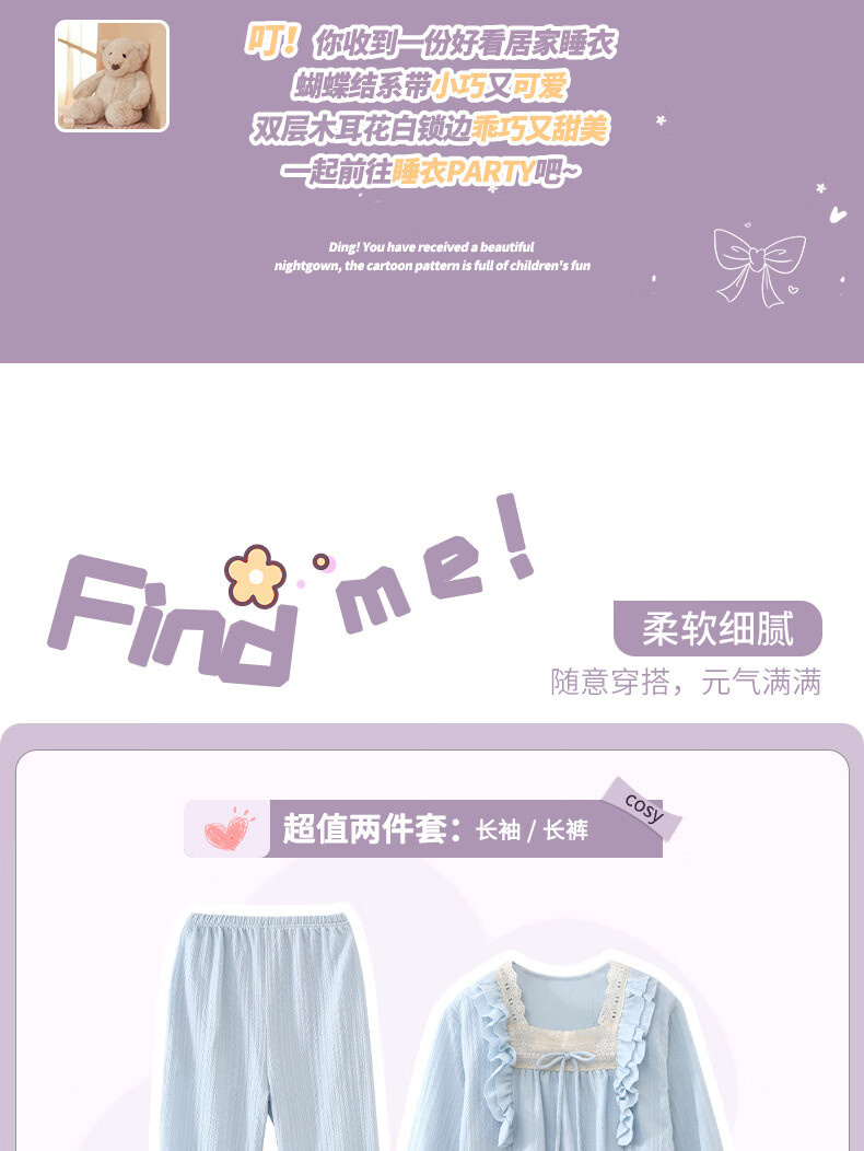 MiiOW children's pajamas girls pure cotton long-sleeved spring, autumn and winter palace-style big children's and girls' home wear suits with chest pads 44300# ice blue 170 size 12 (recommended height 115-125CM. Weight 50Jin Jin is equal to about 0.5 kg