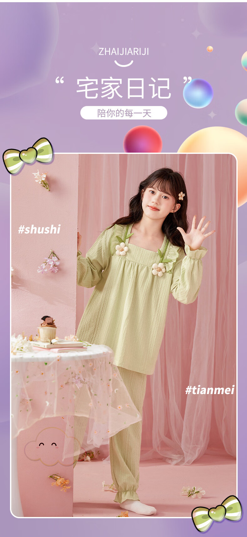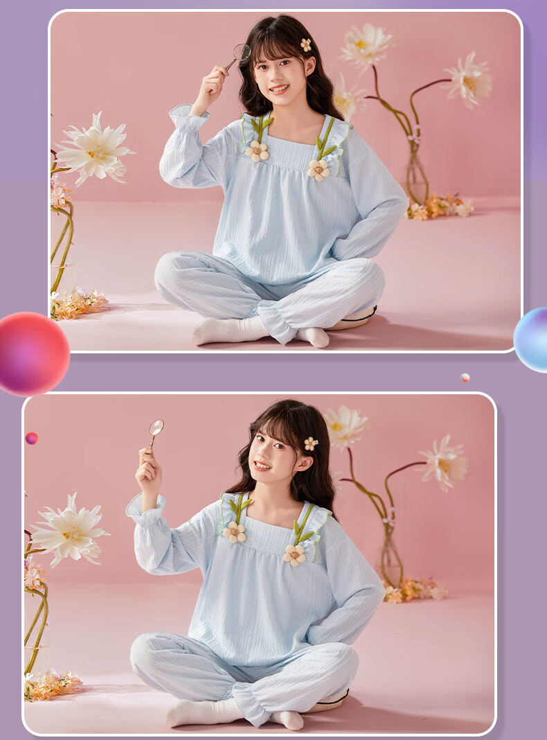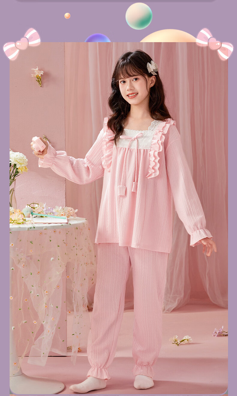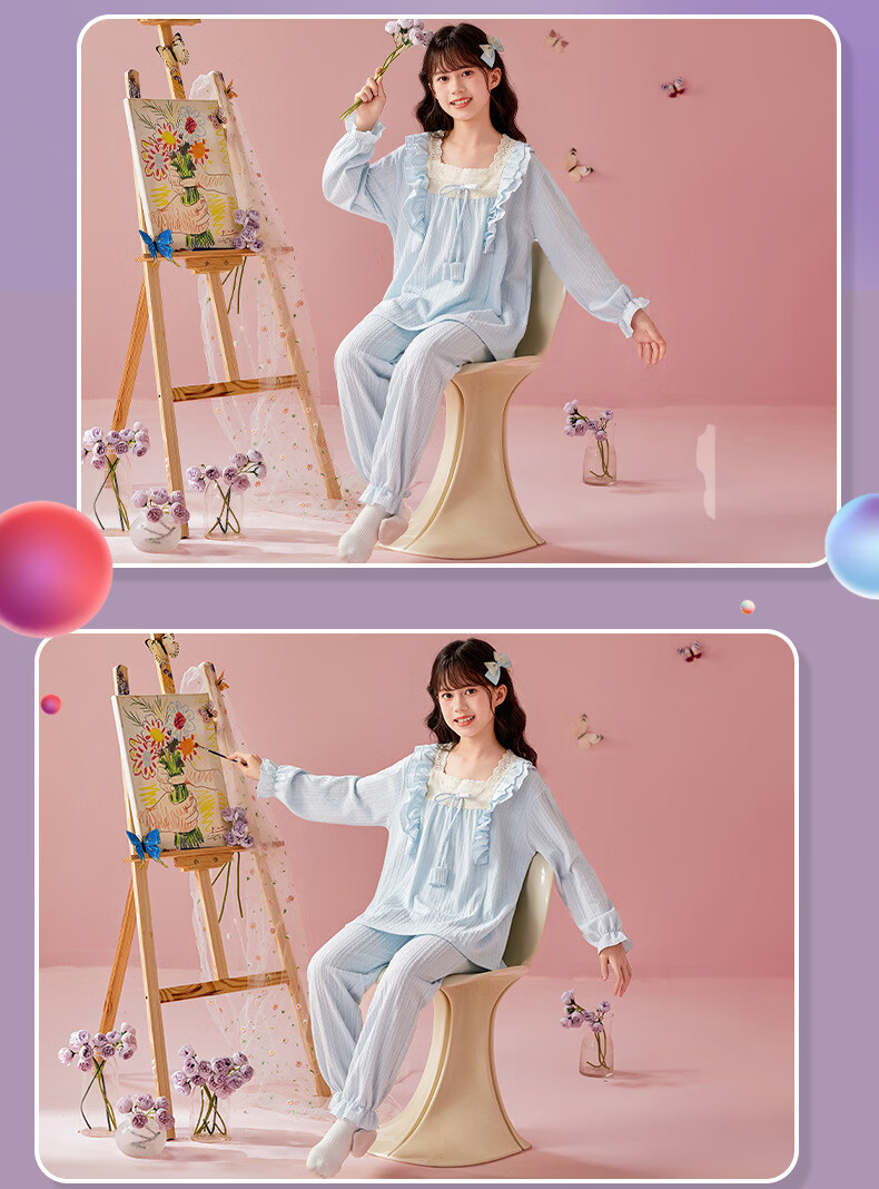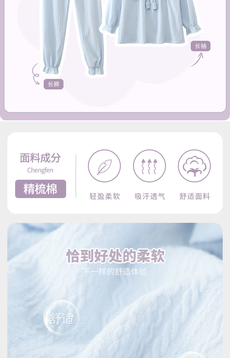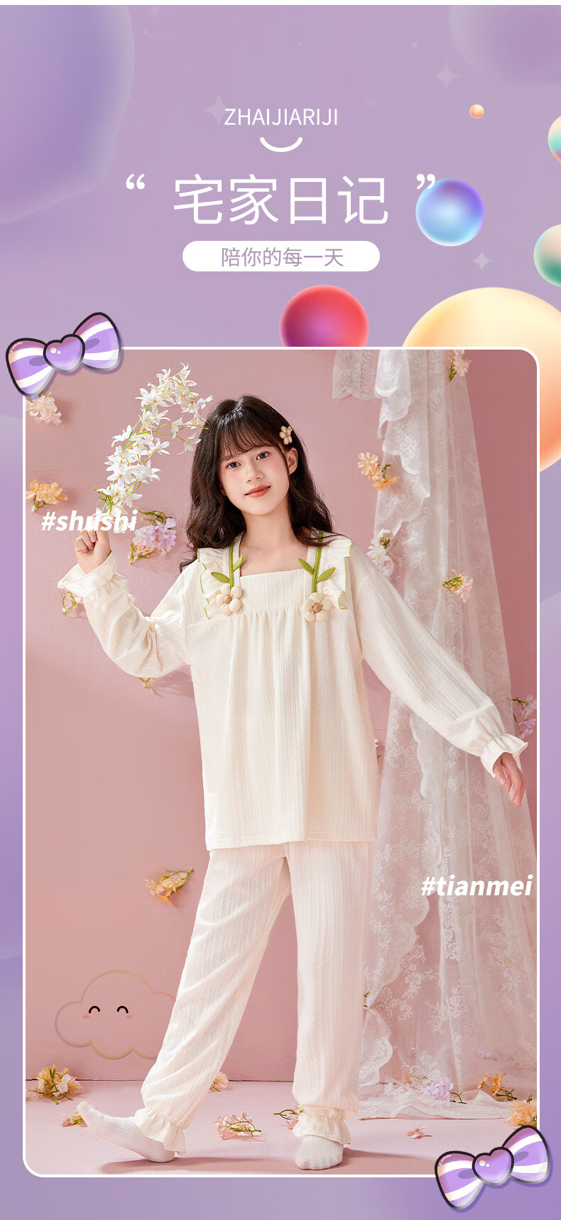 MiiOW children's pajamas girls pure cotton long-sleeved spring, autumn and winter palace-style big children's and girls' home wear suits with chest pads 44300# ice blue 170 size 12 (recommended height 115-125CM. Weight 50Jin Jin is equal to about 0.5 kg