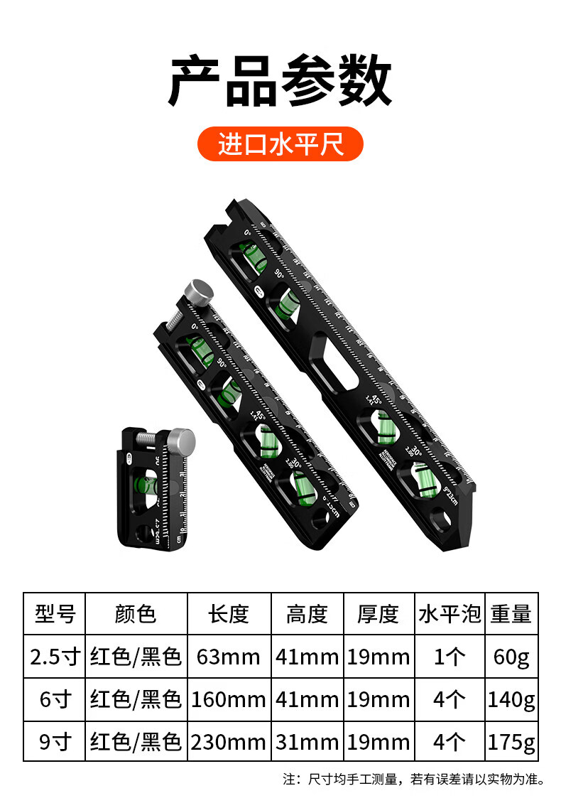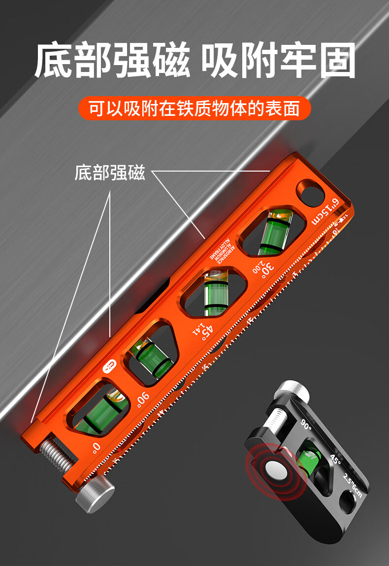 Yaowanxi high-precision level ruler mini small magnetic solid cast aluminum strong magnetic small new portable industrial grade level ruler solid strong magnetic high-precision 160mm orange (4 blisters)