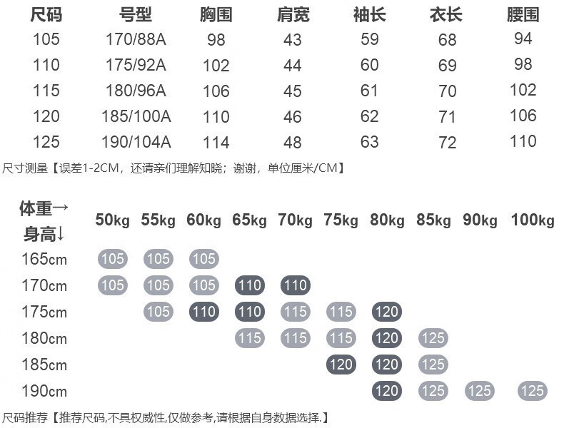 China (cm) 160-165/84-86 165-170 / 88-90 167-172 / 92-96 168-173 / 98-102 170-176 / 106-110