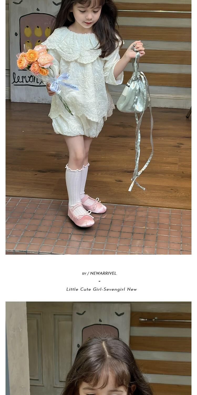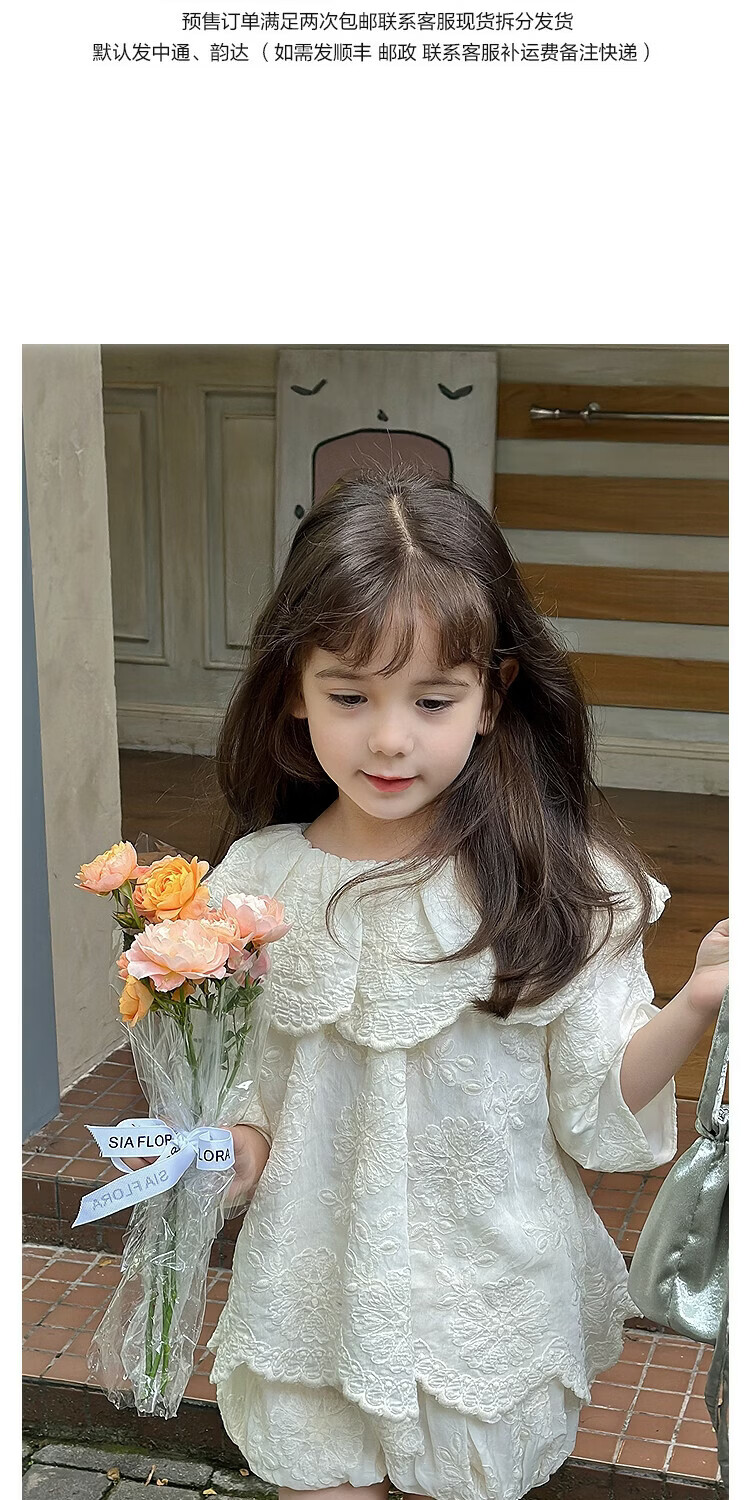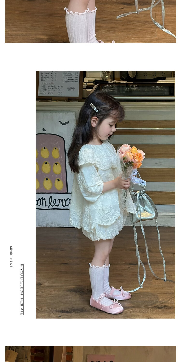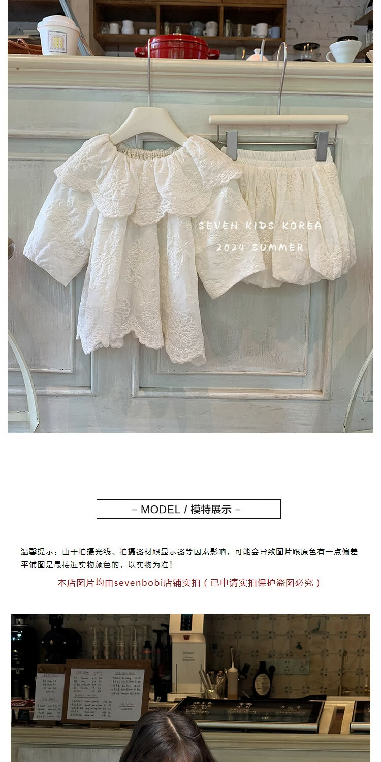 SEVEN BOBI No. 7 Children's Warehouse Girls' Korean Style Western Style Lapel Embroidered Jacquard Shirt Summer New Style Lace Trim Shorts Trendy Off-White Shirt Ready in Stock 120 cm