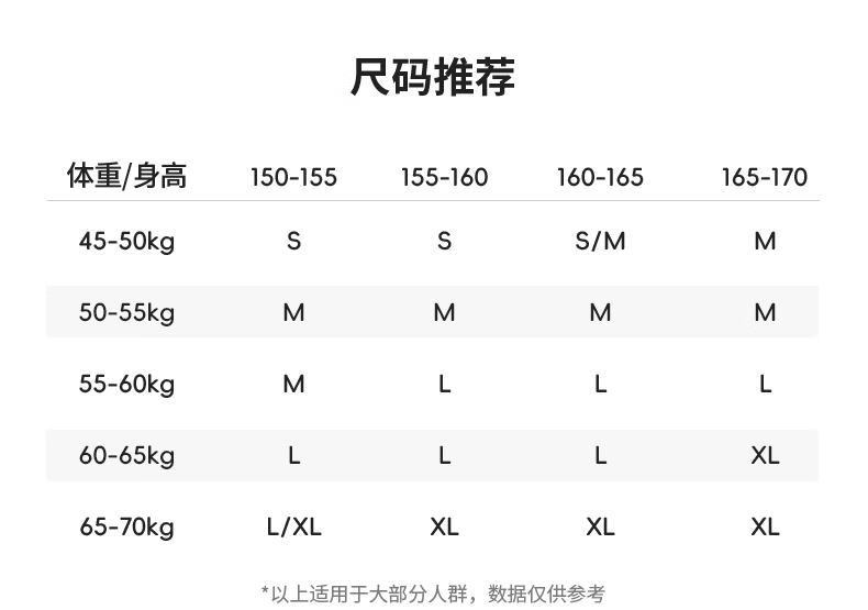 China (cm) 160-165/84-86 165-170 / 88-90 167-172 / 92-96 168-173 / 98-102 170-176 / 106-110