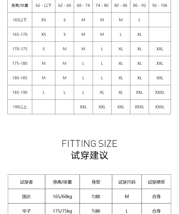 China (cm) 160-165/84-86 165-170 / 88-90 167-172 / 92-96 168-173 / 98-102 170-176 / 106-110