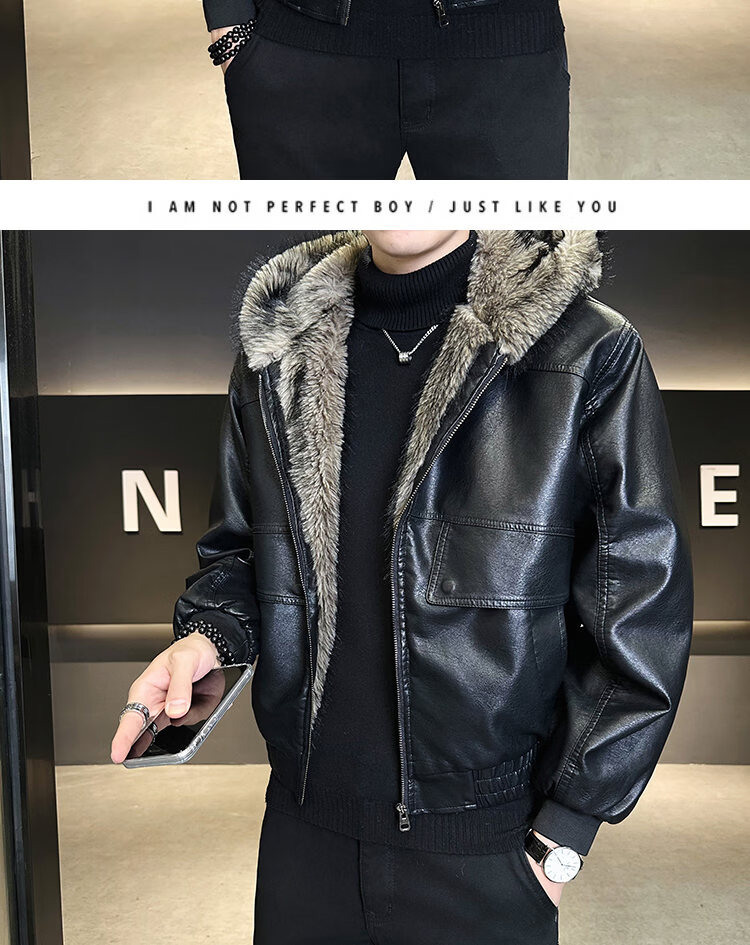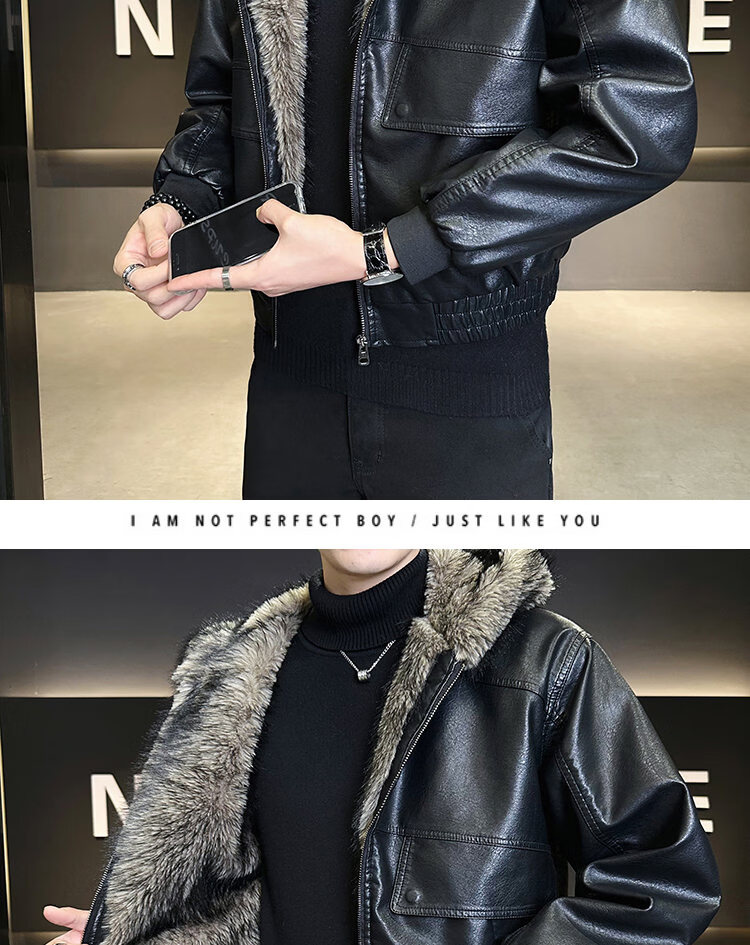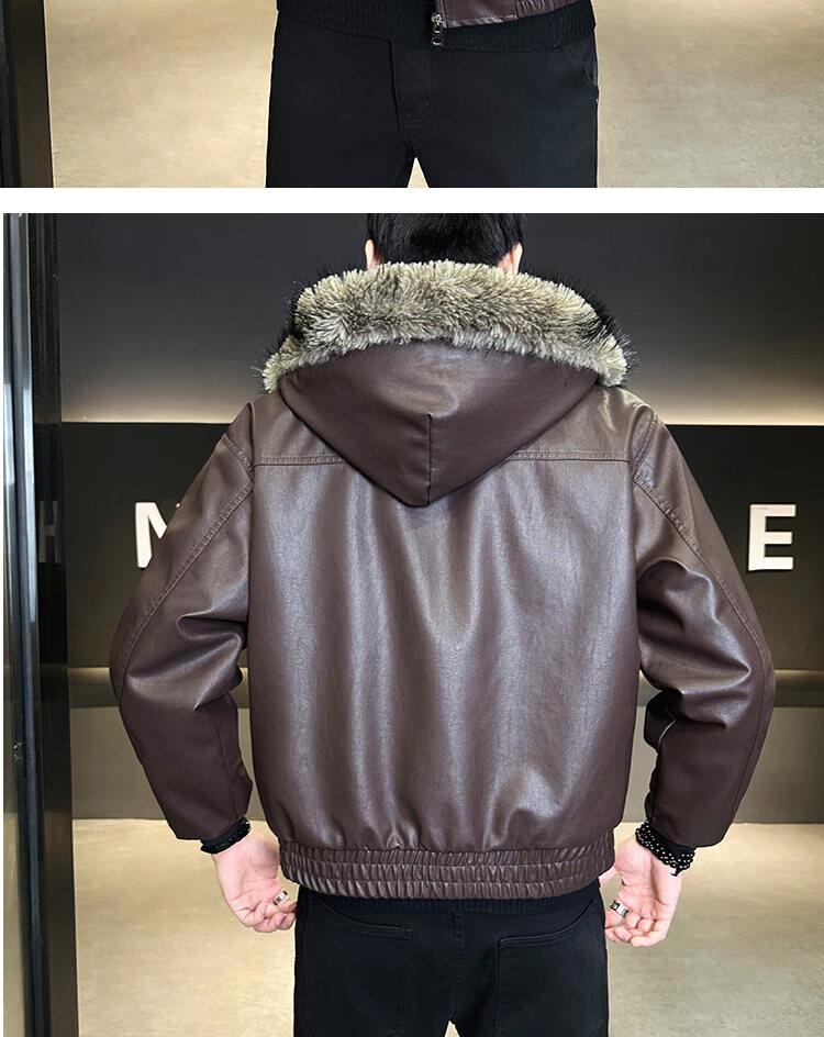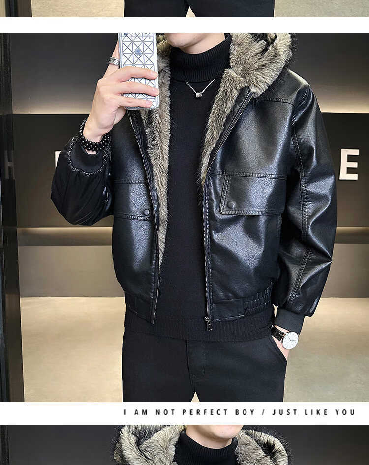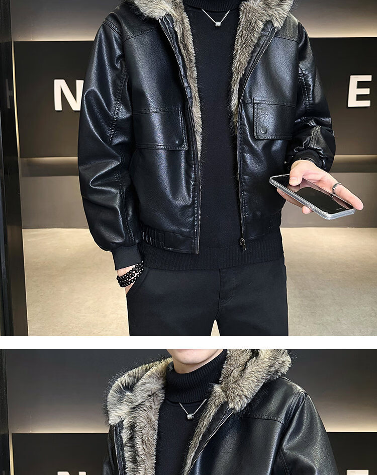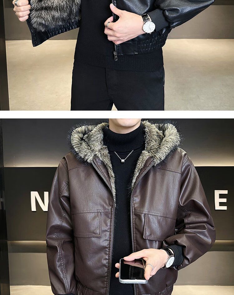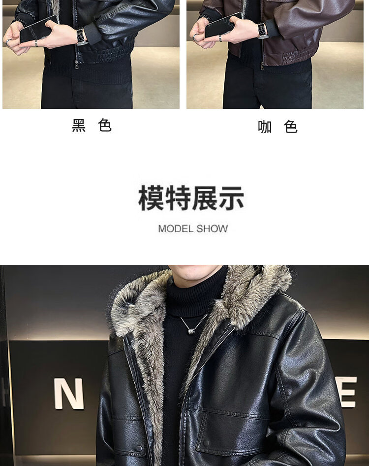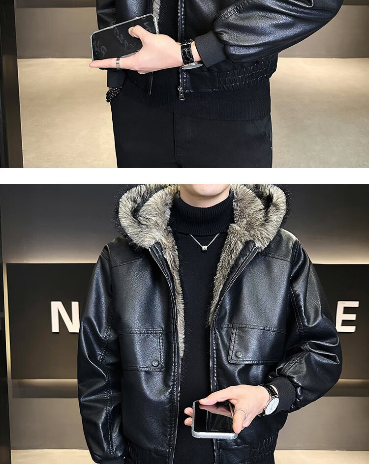 ROMON fur one-piece jacket men's winter trendy hooded new velvet thickened loose mountain carving leather jacket men's black XL