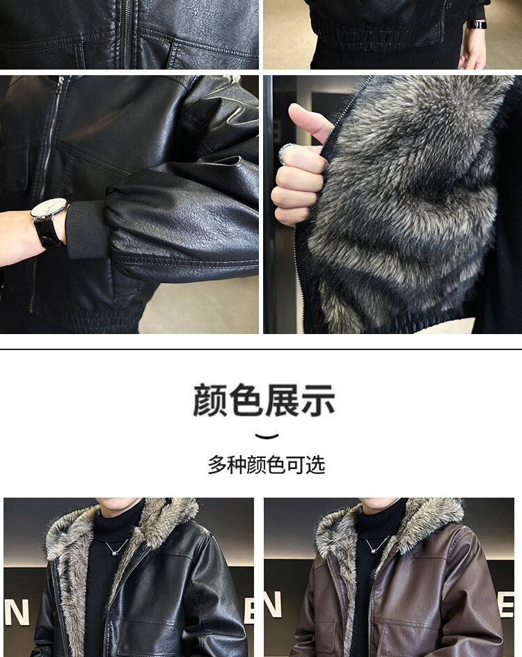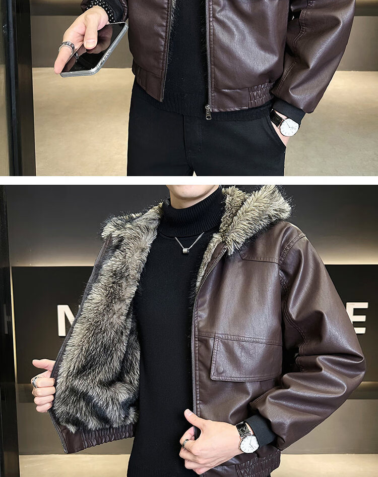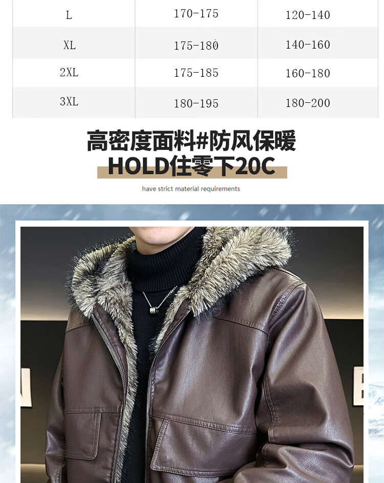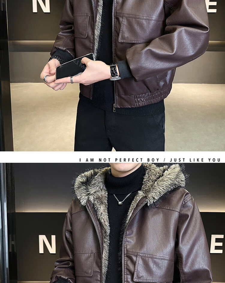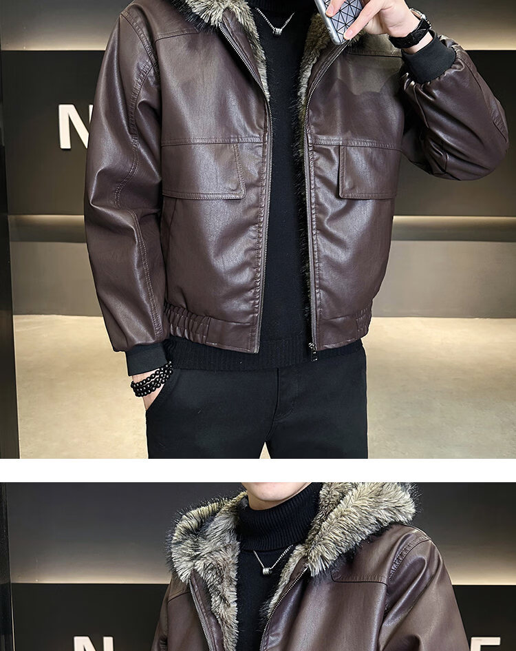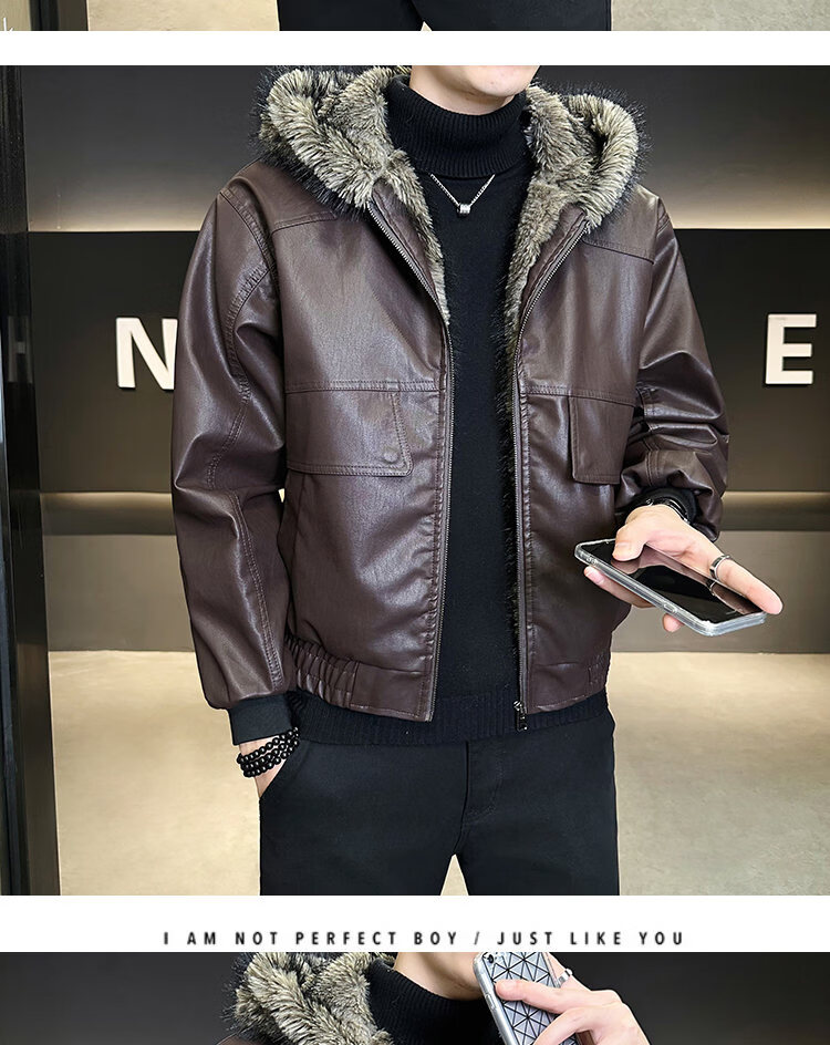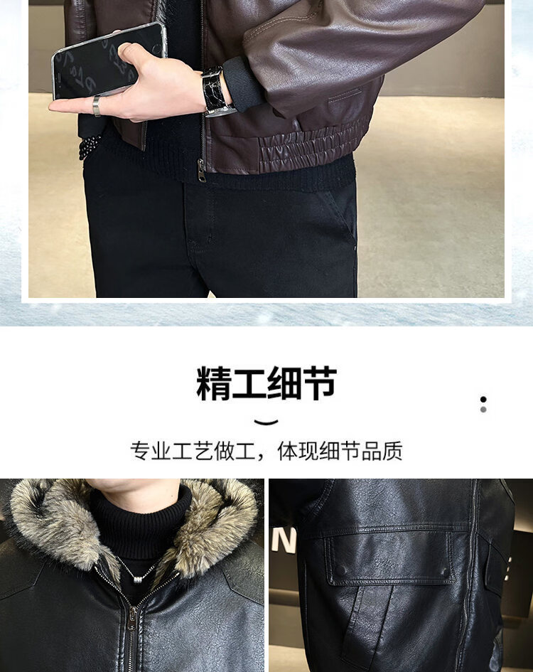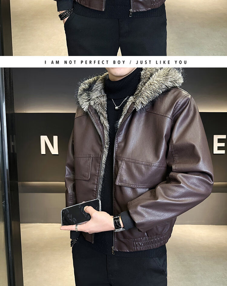 ROMON fur one-piece jacket men's winter trendy hooded new velvet thickened loose mountain carving leather jacket men's black XL