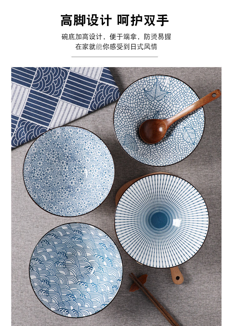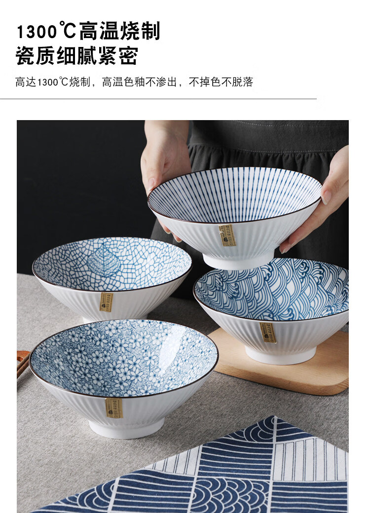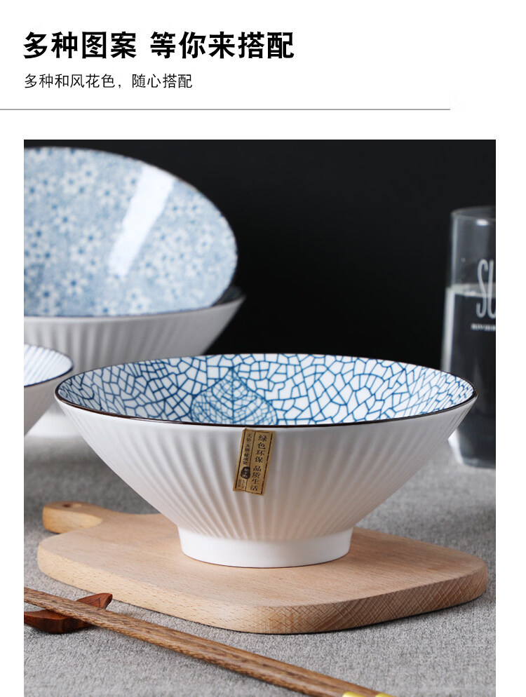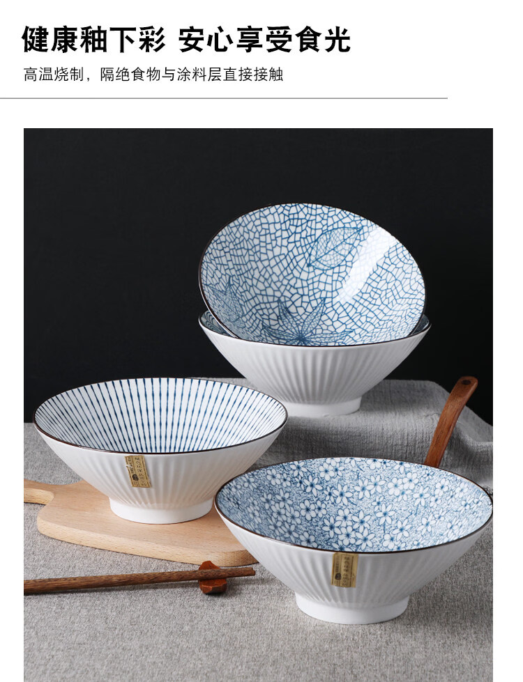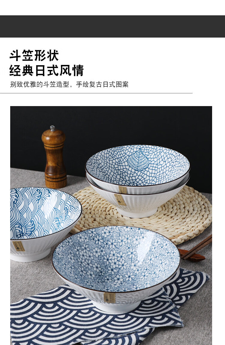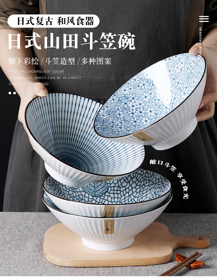 Yongfan German imported quality 4-pack Japanese-style bamboo hat bowls for home use ceramic underglaze colored noodle bowls creative personality Internet celebrity bubble 8-inch Yamada bamboo hat noodle bowls 4-pack - mixed color