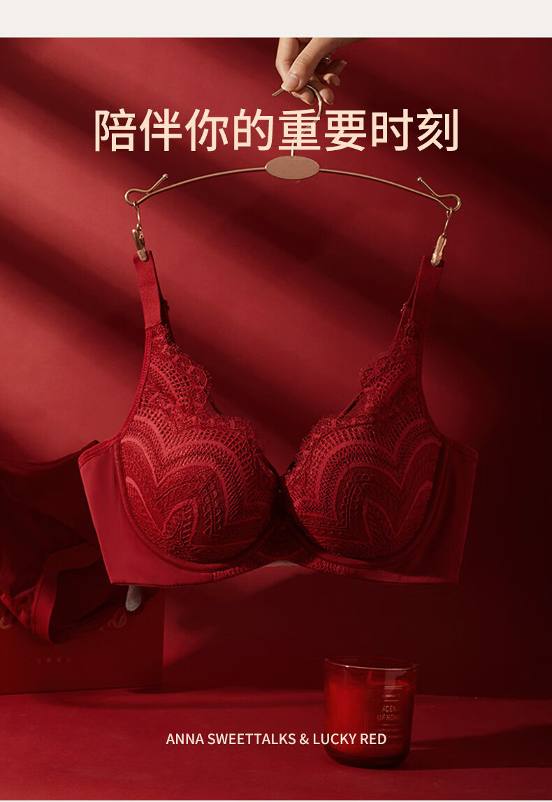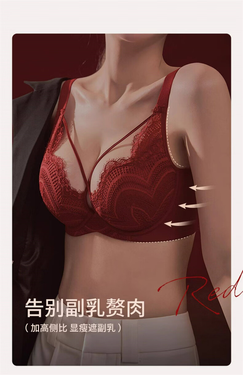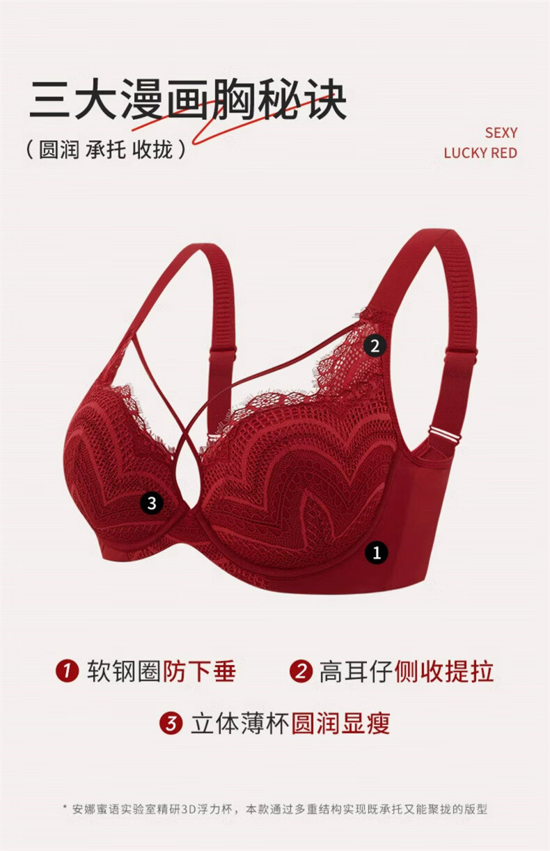 Oushiqian red benmingnian sexy lace underwear for women with big breasts, small upper support, secondary breast anti-sagging, large size bra, wine red M 34/75 (BC Tong cup)