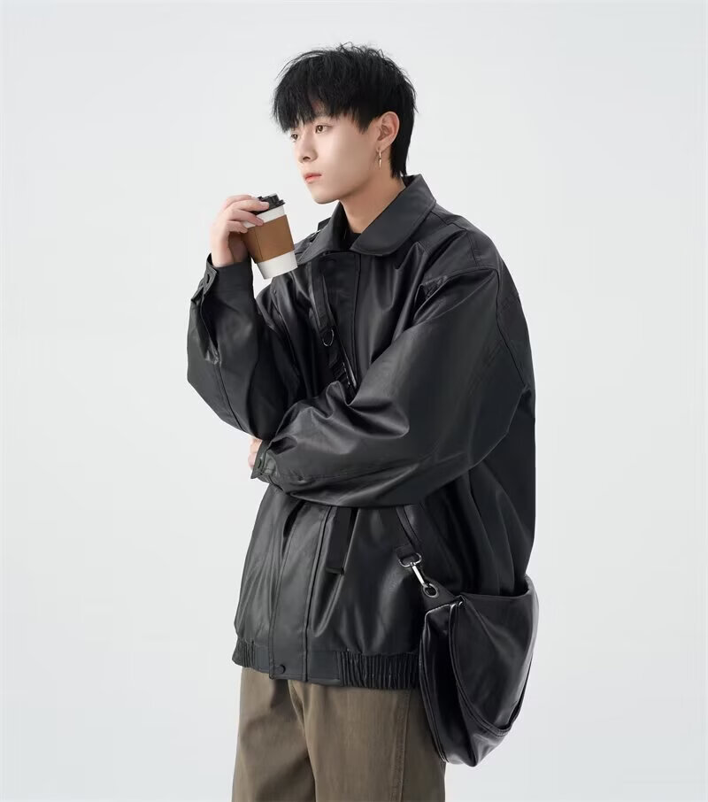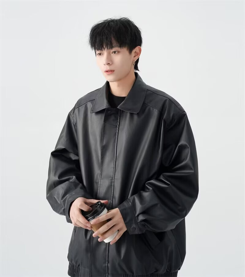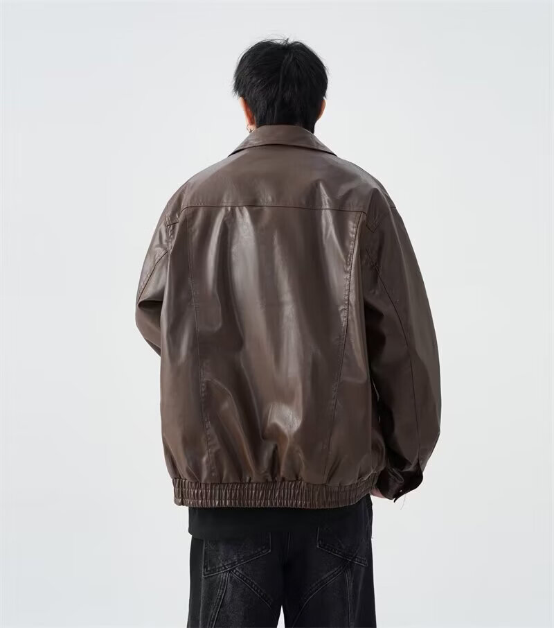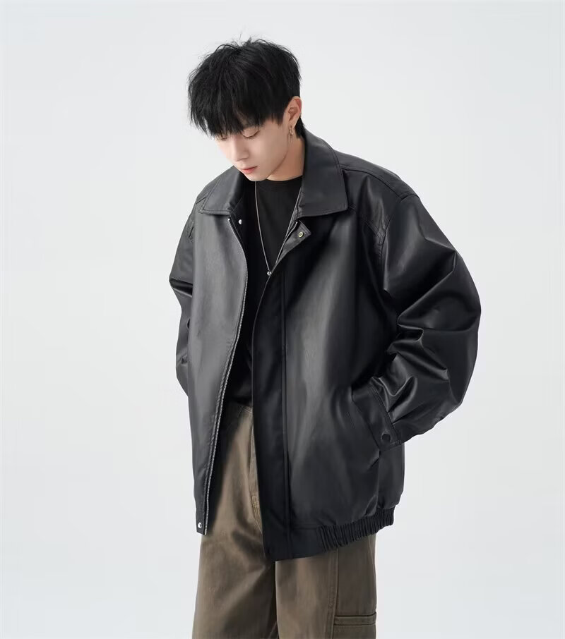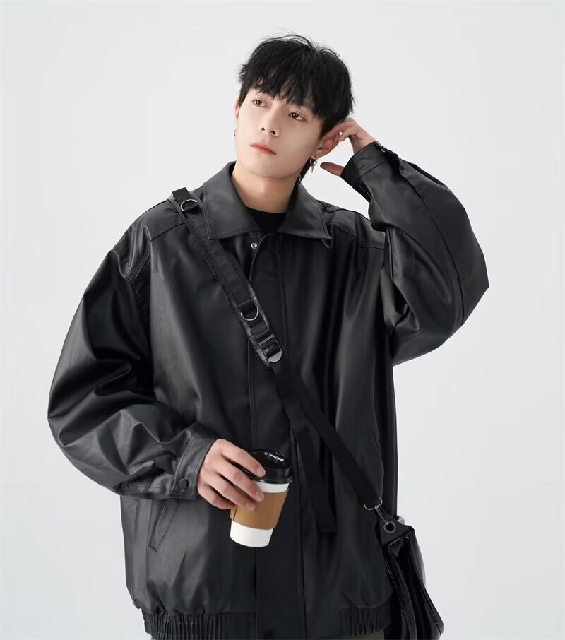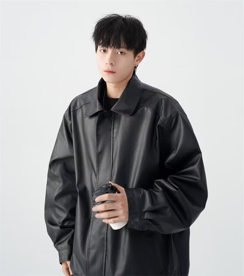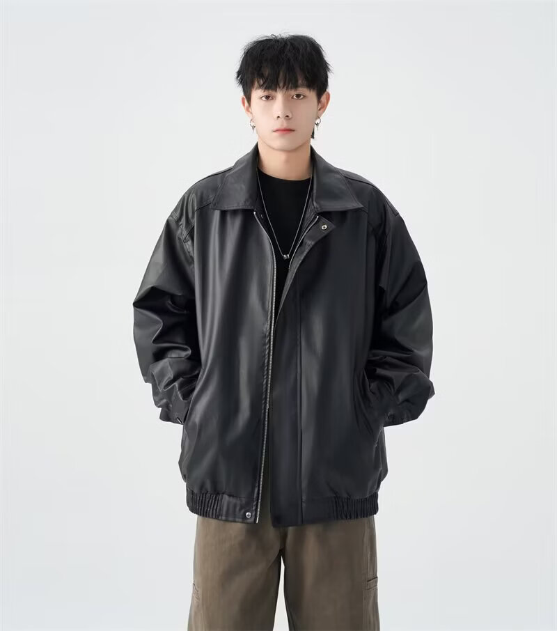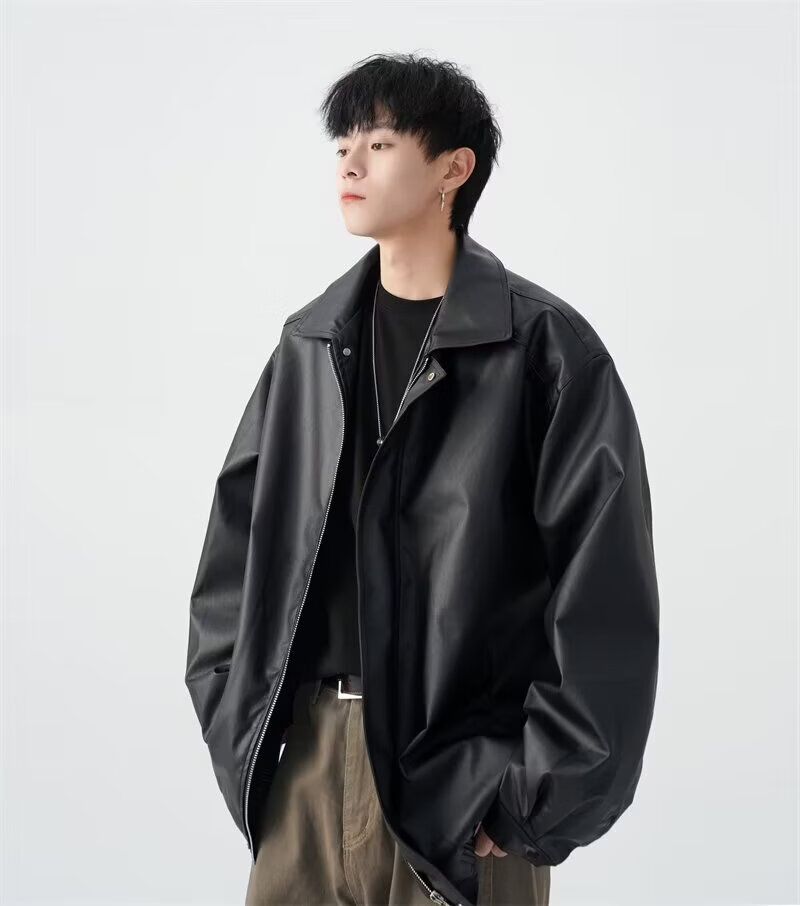 American high street PU lapel leather jacket for men and women in autumn and winter handsome loose motorcycle jacket black 2XL
