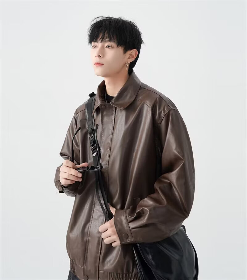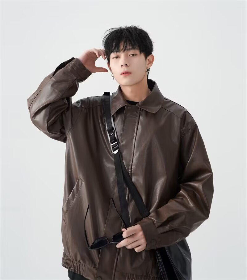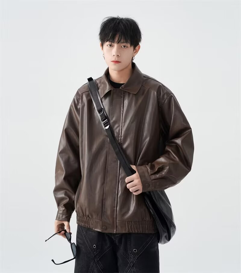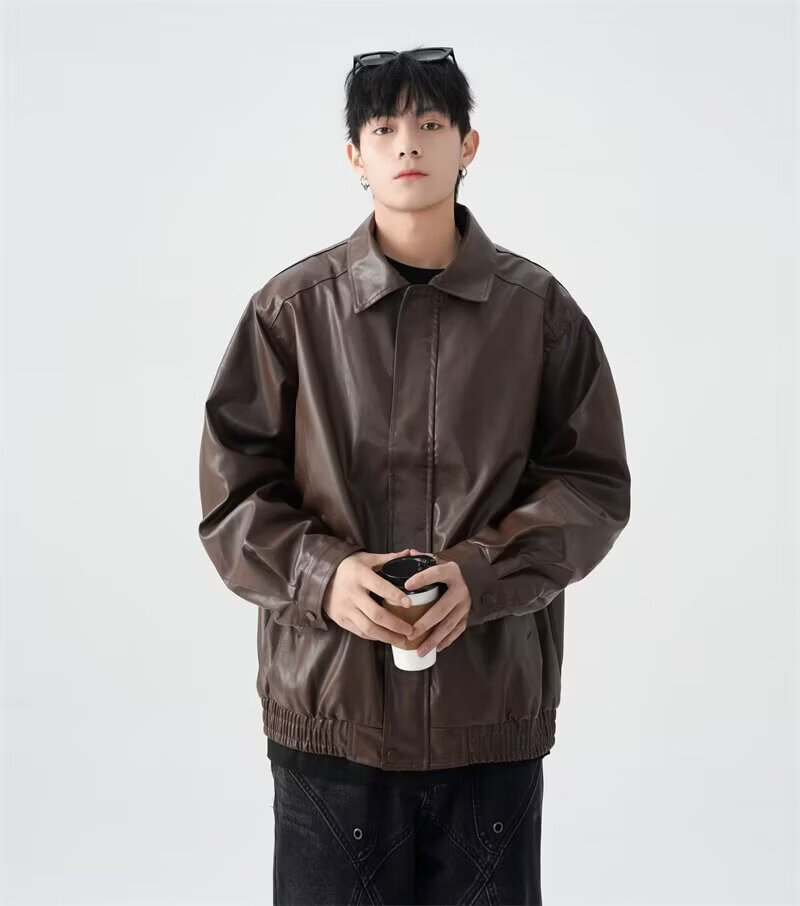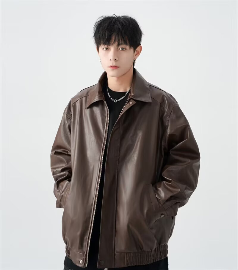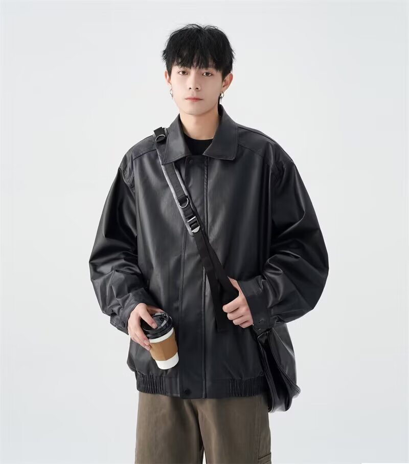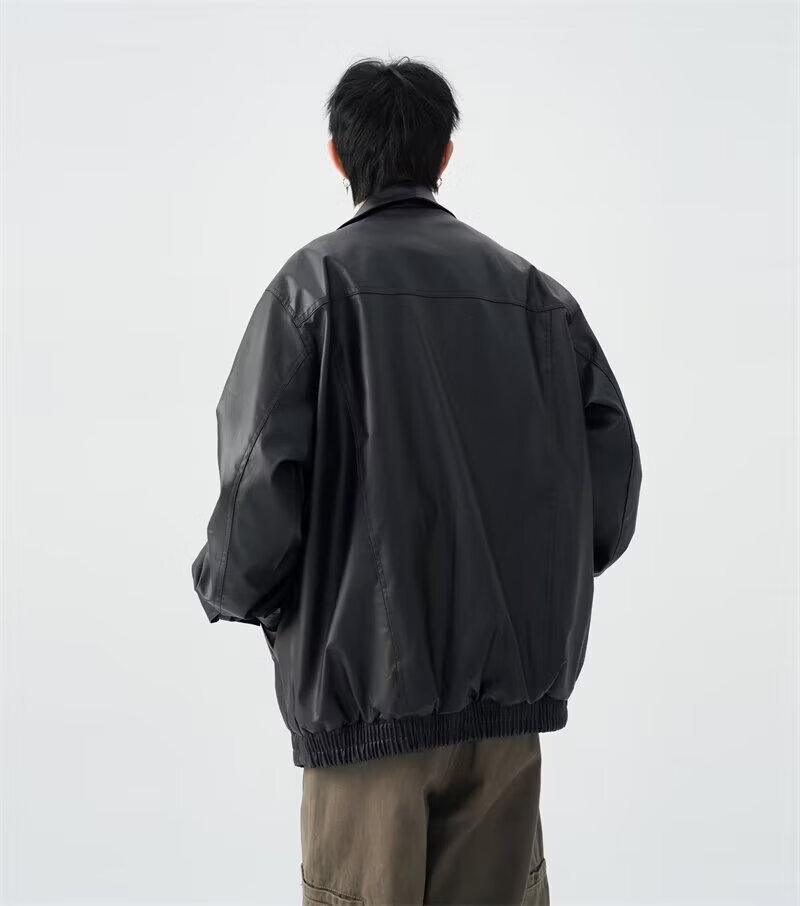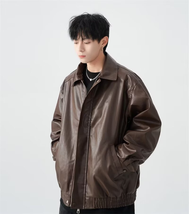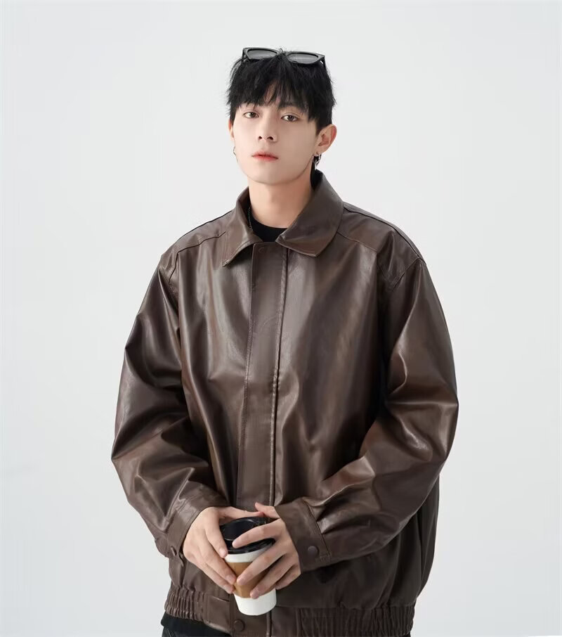 American high street PU lapel leather jacket for men and women in autumn and winter handsome loose motorcycle jacket black 2XL