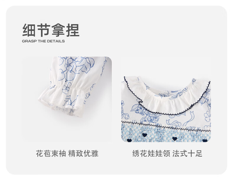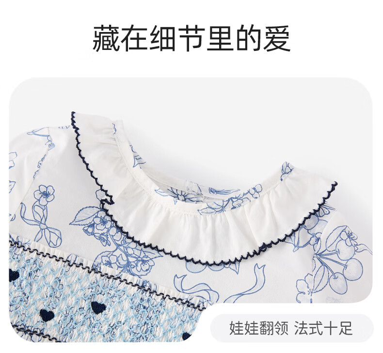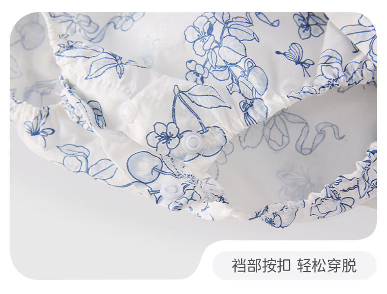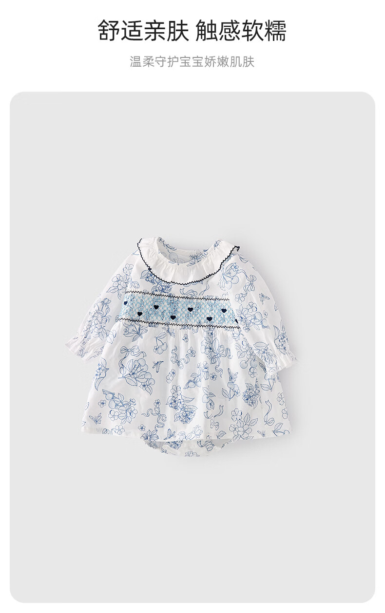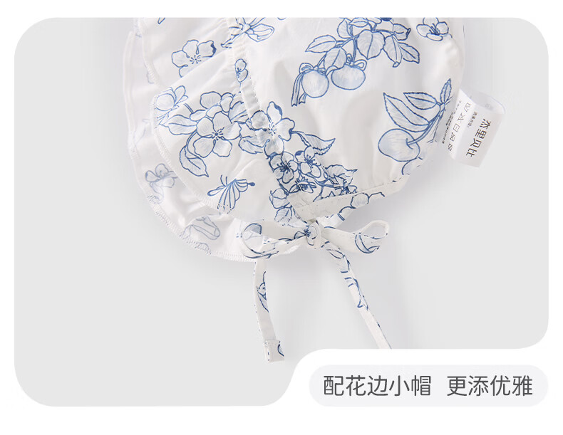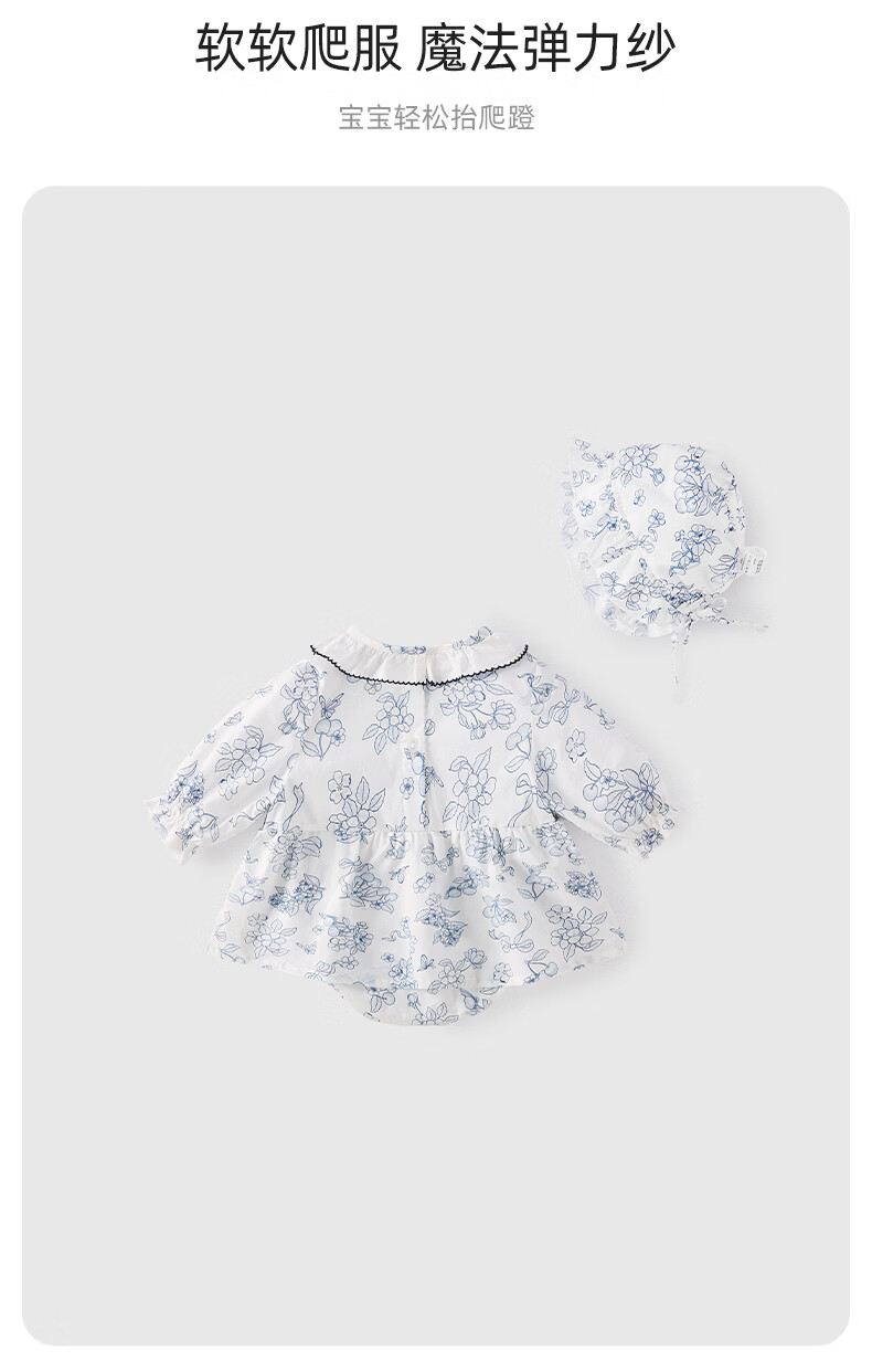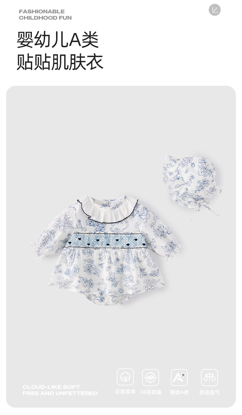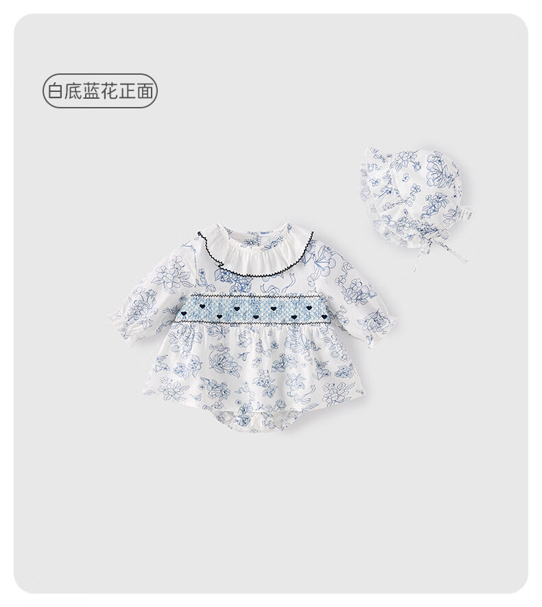 JELLYBABY 2026 Spring New Product Infant Onesie Newborn Triangle Romper Baby French Style Hat Two-piece Spring Suit White Background Blue Flower 66cm