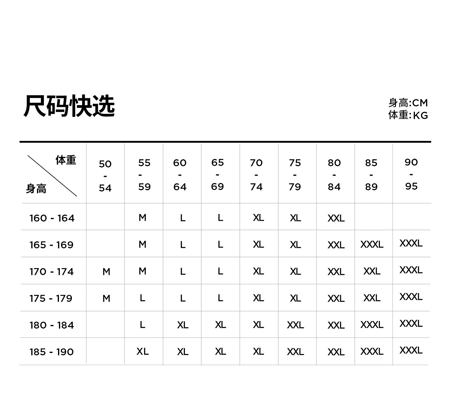 China (cm) 160-165/84-86 165-170 / 88-90 167-172 / 92-96 168-173 / 98-102 170-176 / 106-110