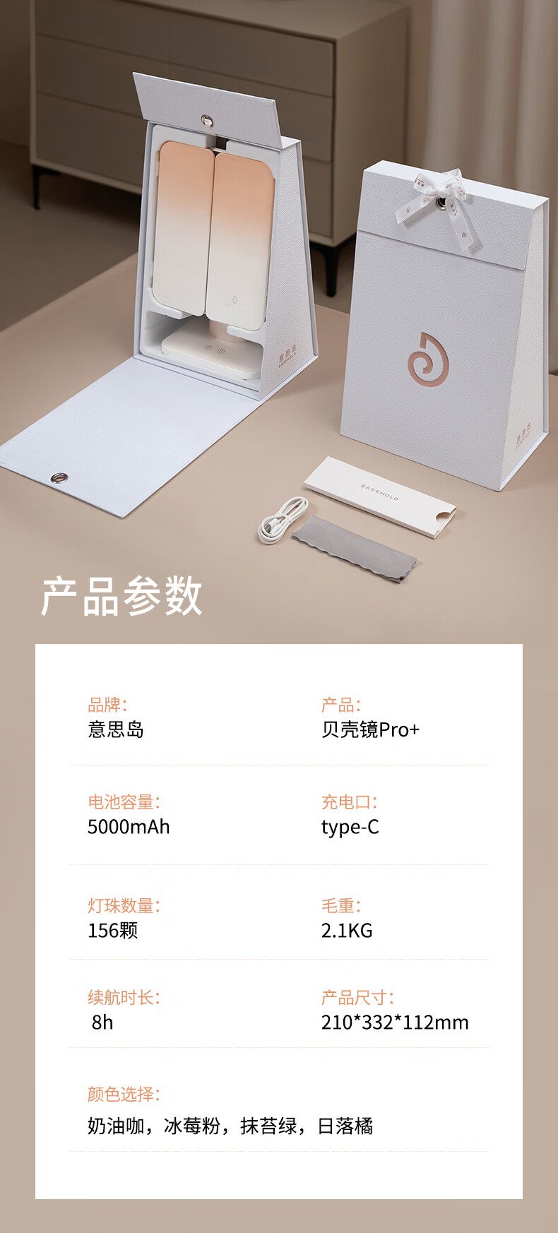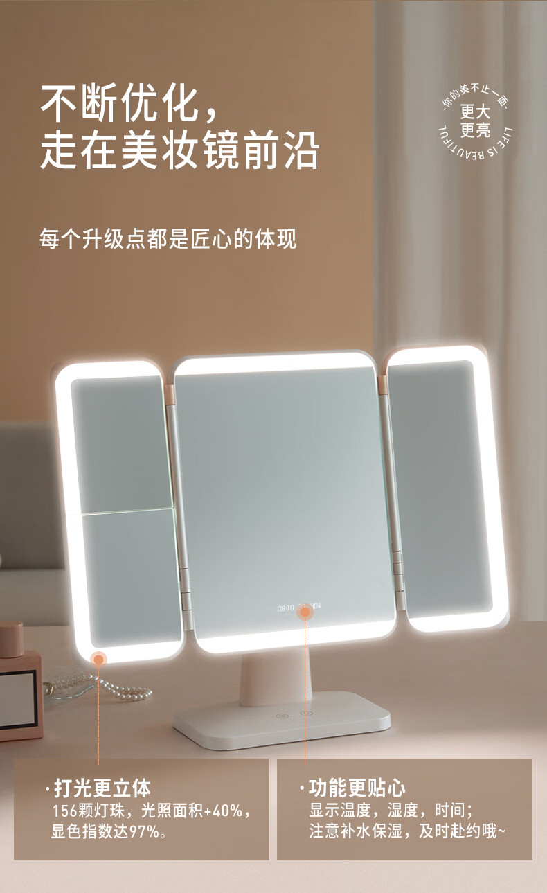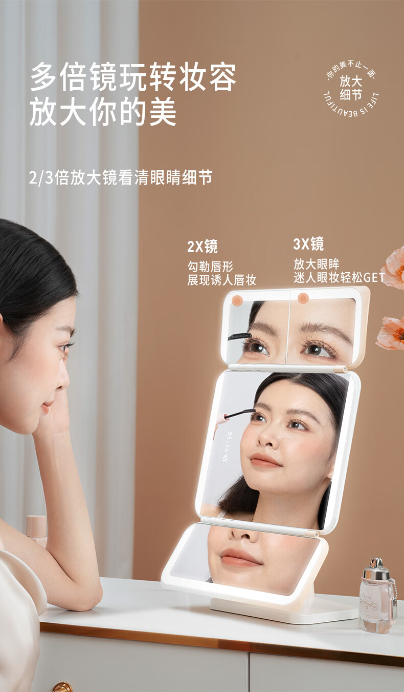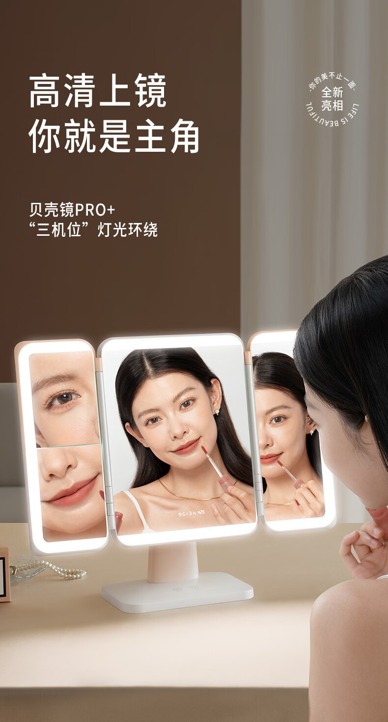 EASEHOLD three-sided folding shell mirror LED with light fill-in dressing table desktop makeup mirror minimalist white small three-fold 2000mah three-color light rechargeable