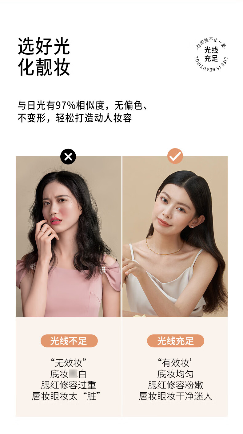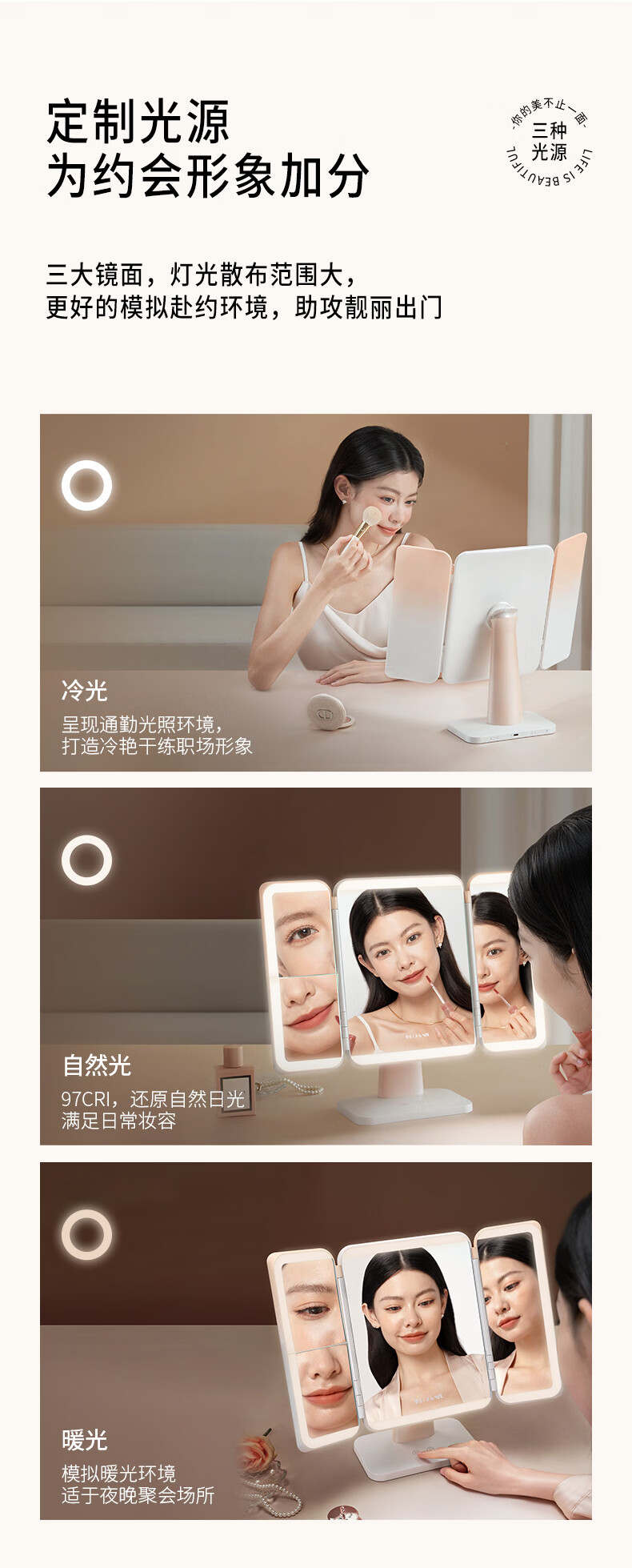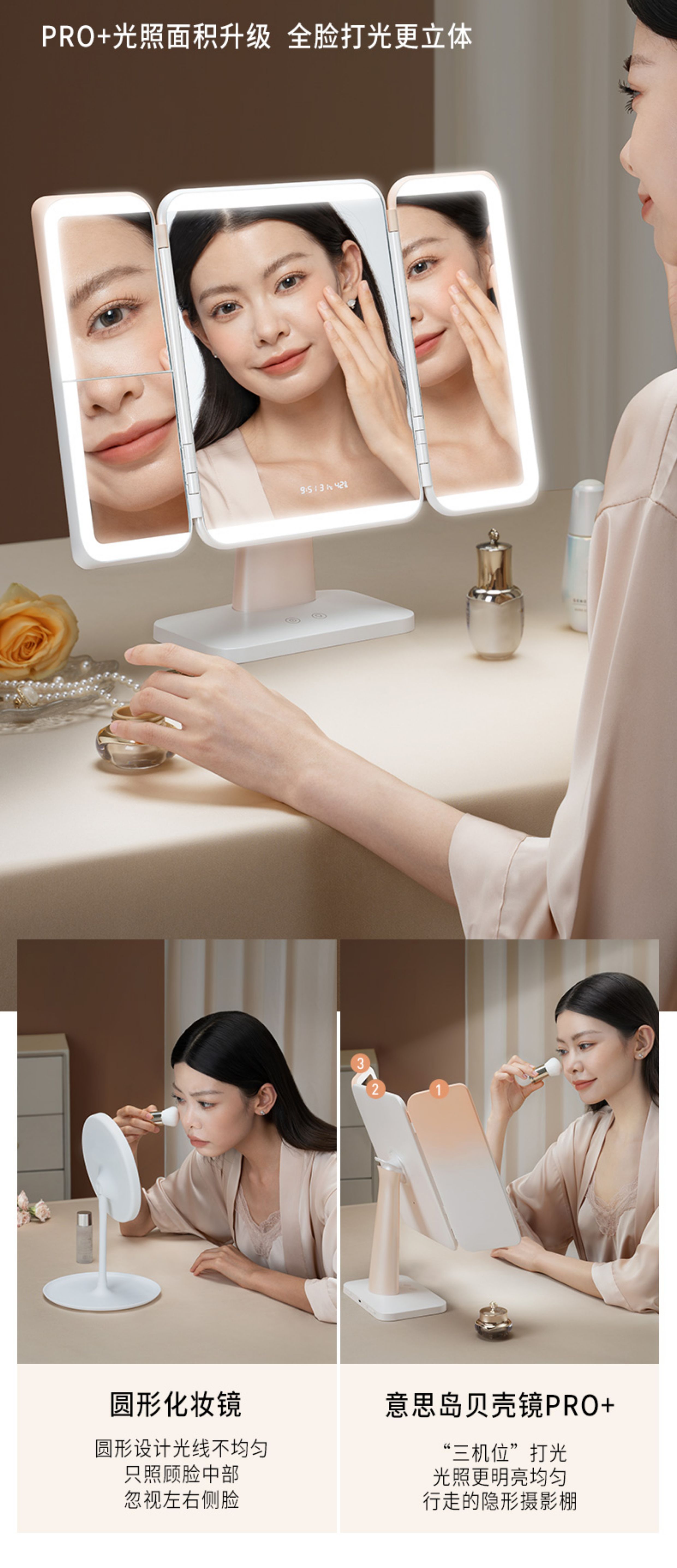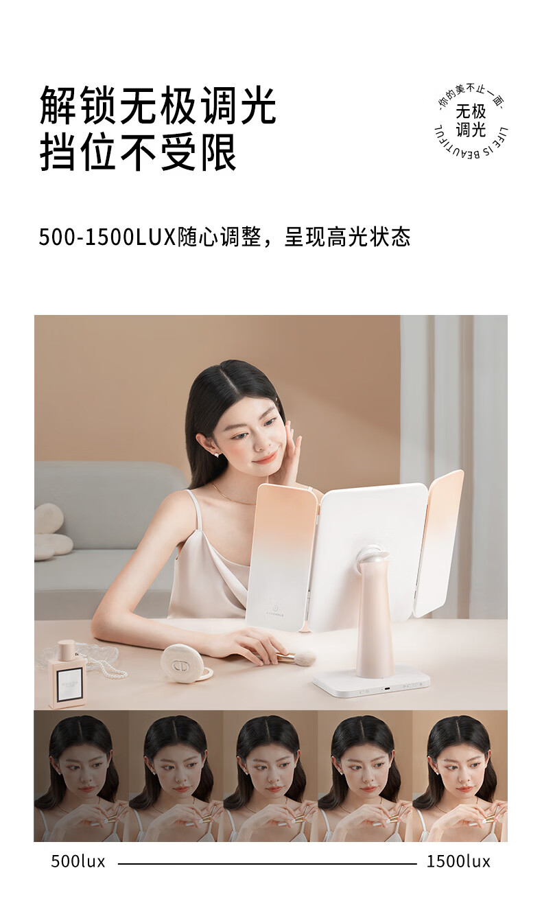 EASEHOLD three-sided folding shell mirror LED with light fill-in dressing table desktop makeup mirror minimalist white small three-fold 2000mah three-color light rechargeable