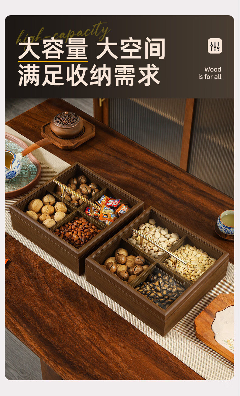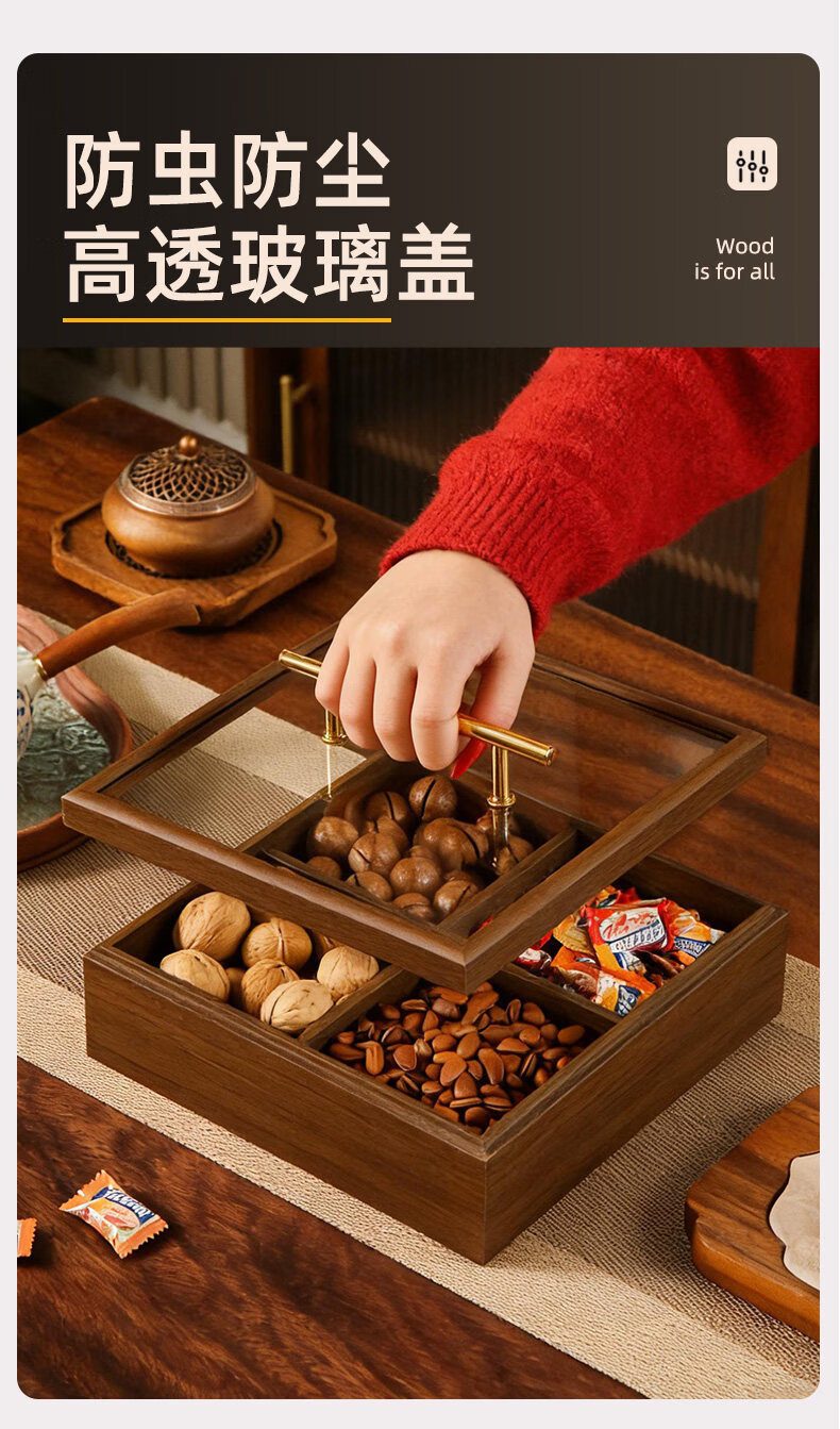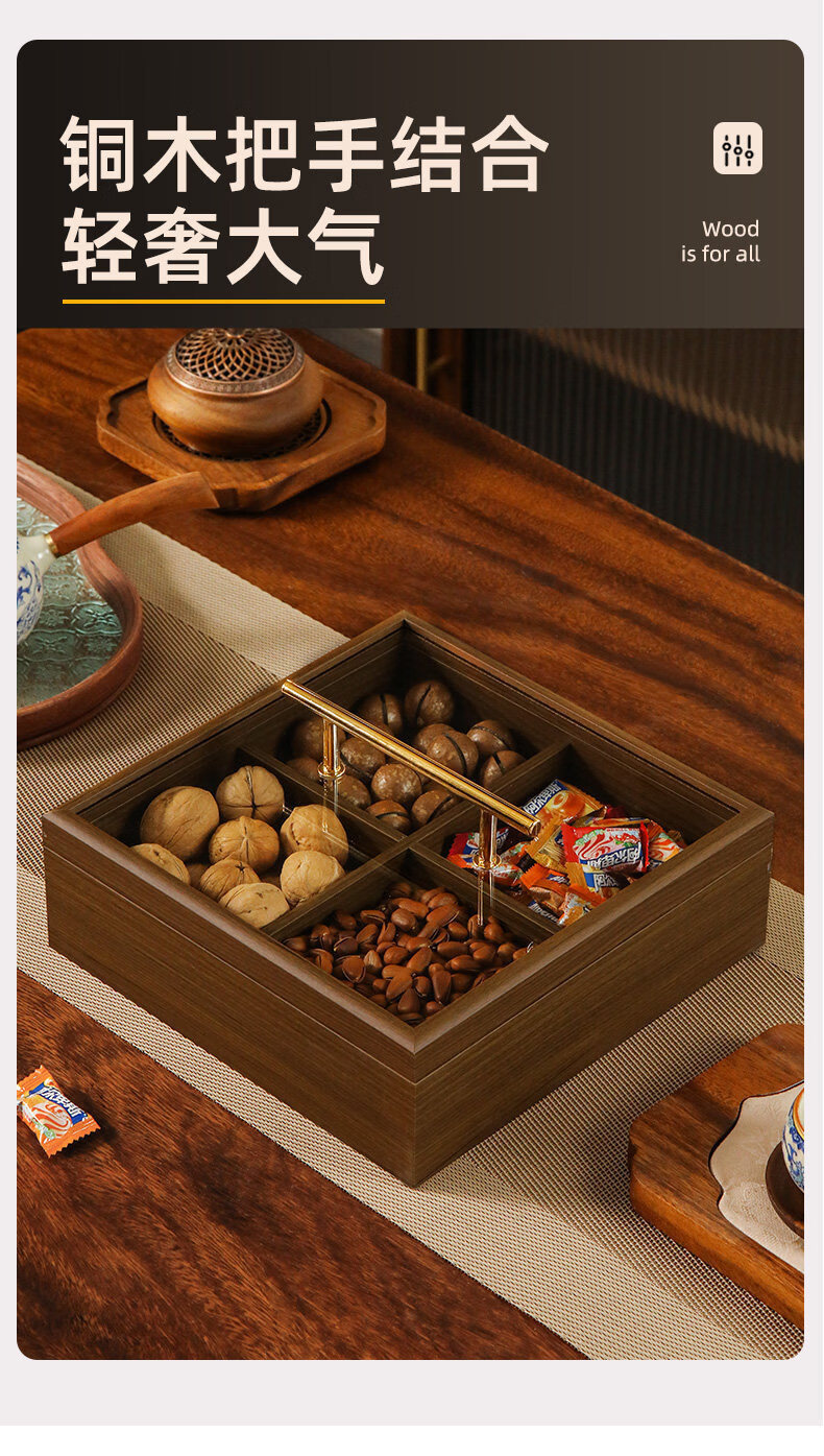 New Year living room coffee table solid wood dried fruit storage box fruit tray high-end light luxury snacks dried fruit tray with lid kk Chinese style walnut grain dried fruit box-solid wood 6 square grid handle style