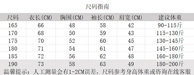 China (cm) 165 / 88-90 170 / 96-98 175 / 108-110 180 / 118-122 185 / 126-130