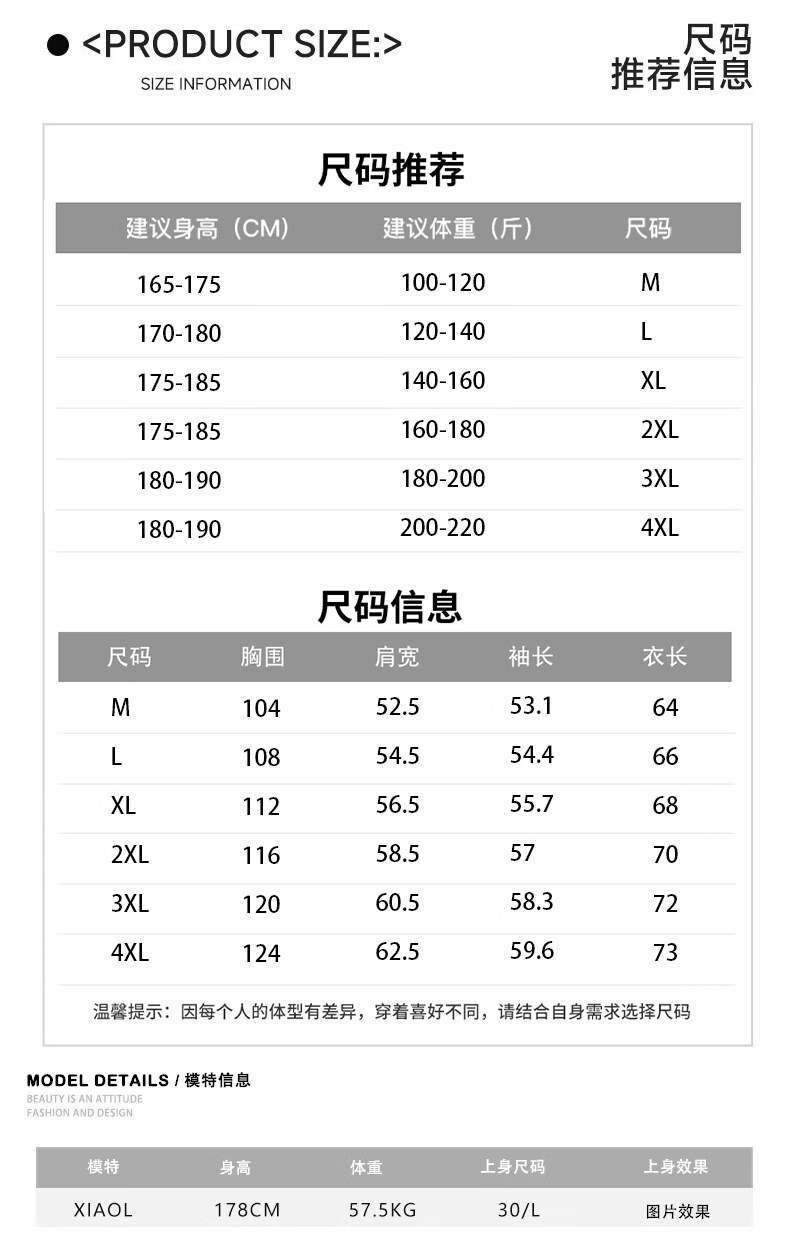 China (cm) 165 / 88-90 170 / 96-98 175 / 108-110 180 / 118-122 185 / 126-130