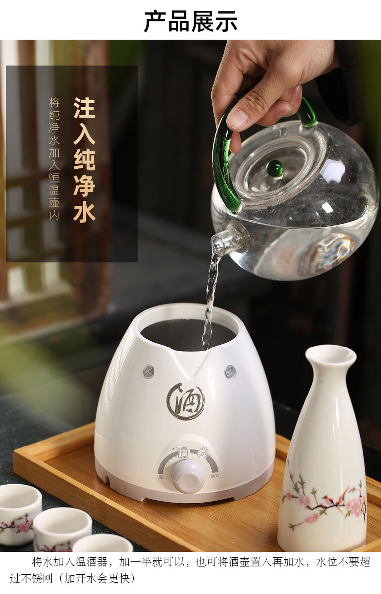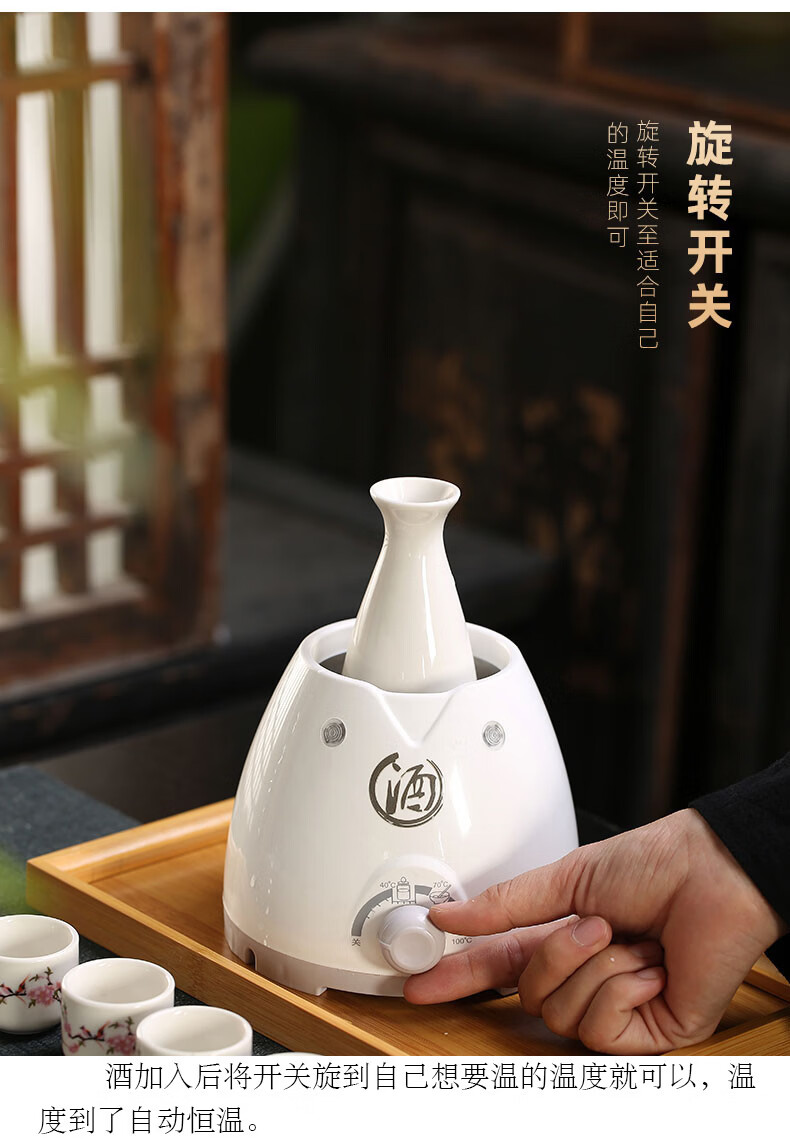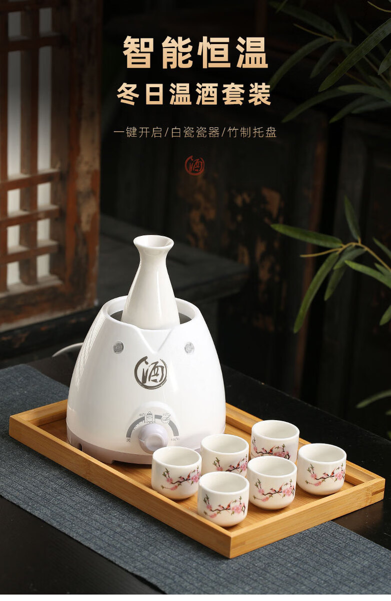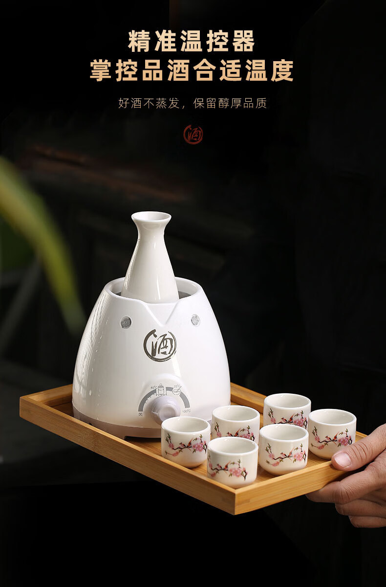 Miaopule Electric Wine Warmer Constant Temperature Wine Bottle Home Fashion Retro Ceramic Temperature Control White Wine Yellow Wine Tray Wine Set Electric Heat Control Temperature Wine Warmer + 250ml Flower and Bird Round Wine Bottle + 6 Cups + Tray