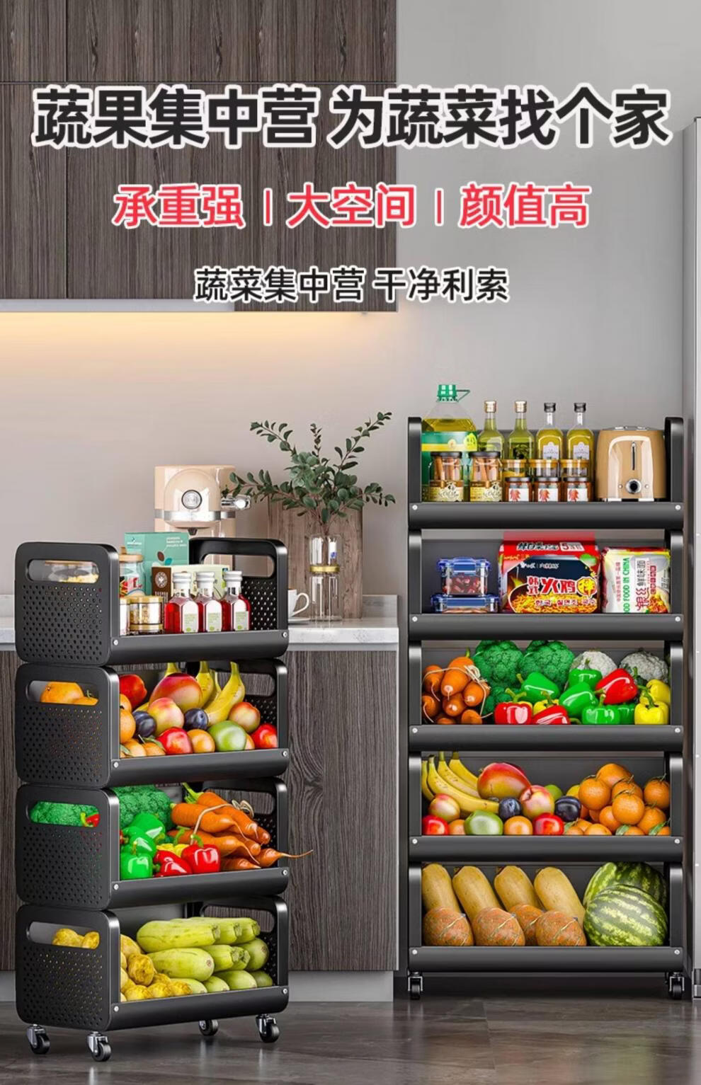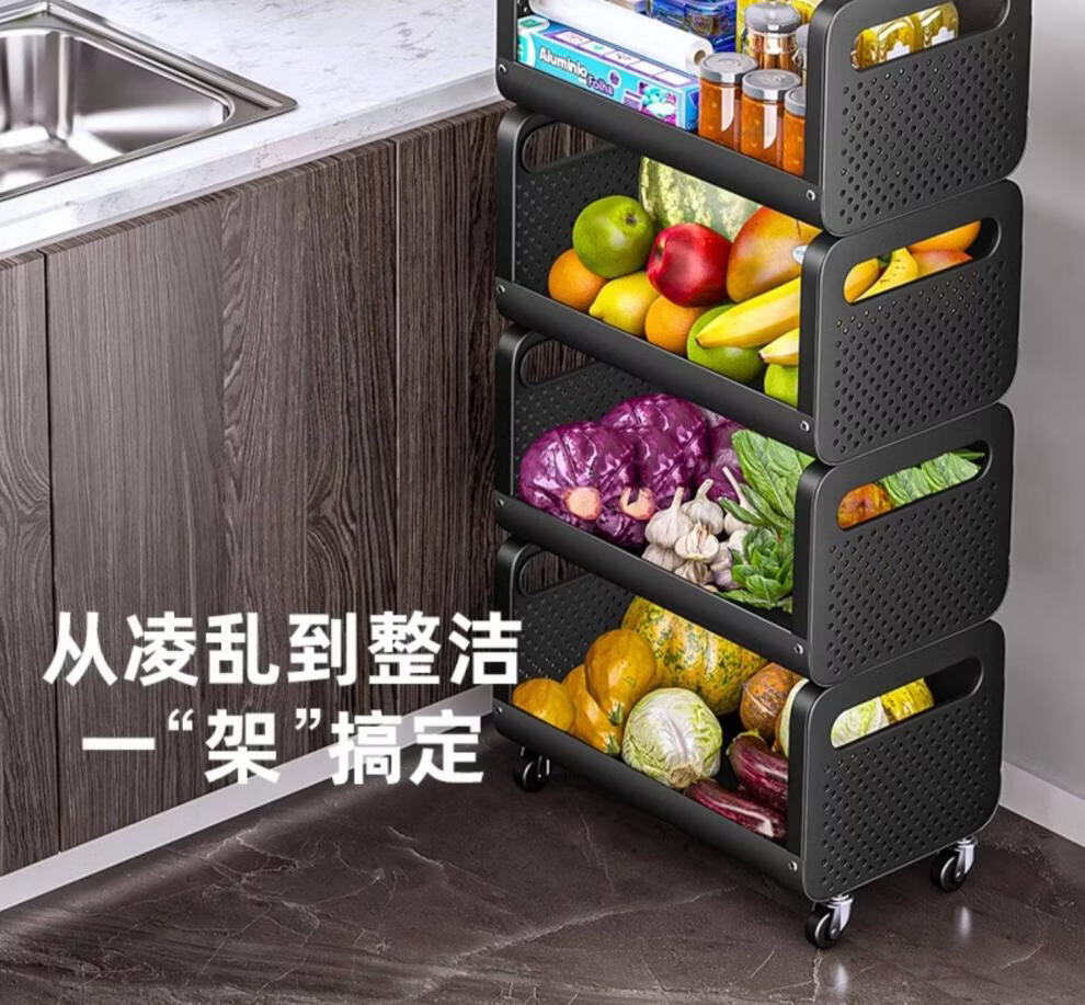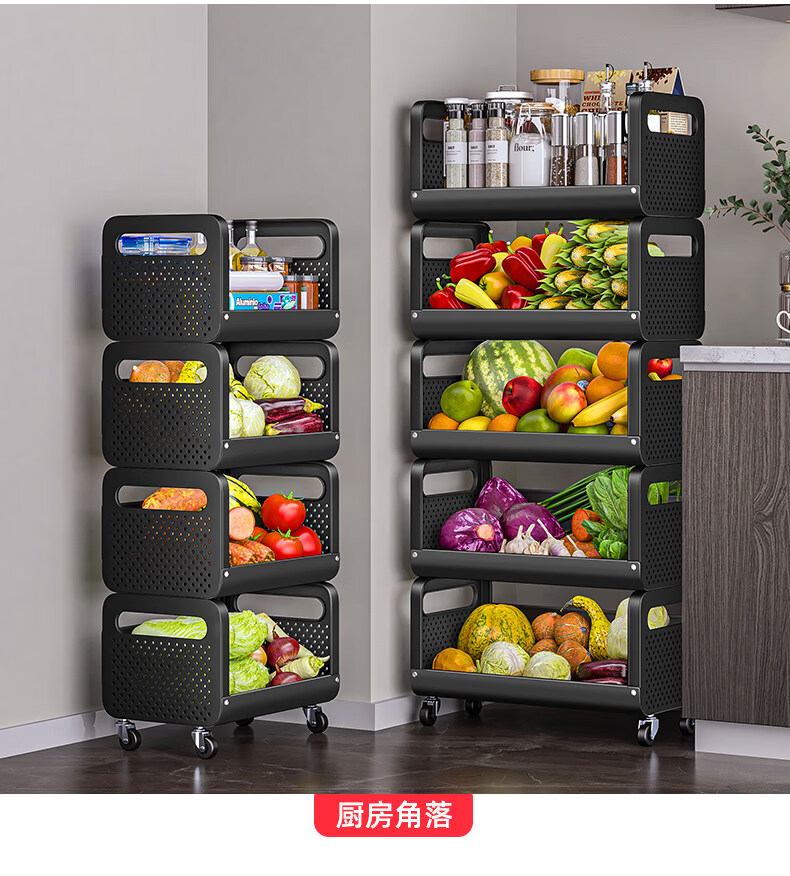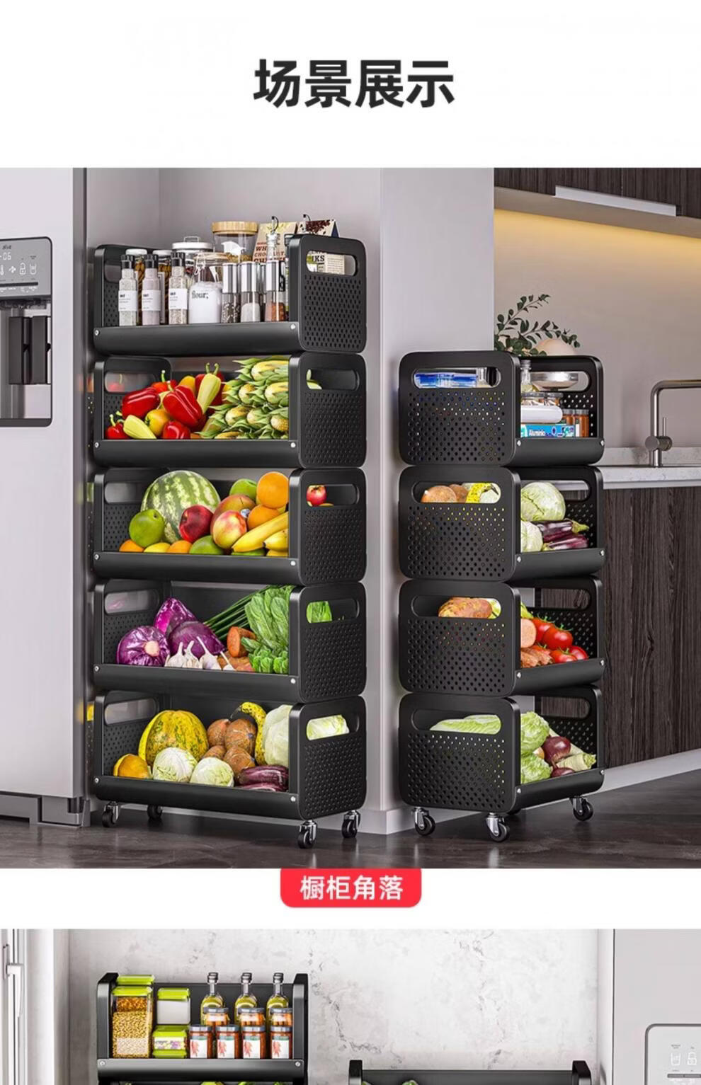 Tuojin kitchen vegetable basket rack multi-layer floor-standing removable fruit and vegetable storage household multi-functional trolley with top extra thick 40CM large four-layer charcoal black SF Express
