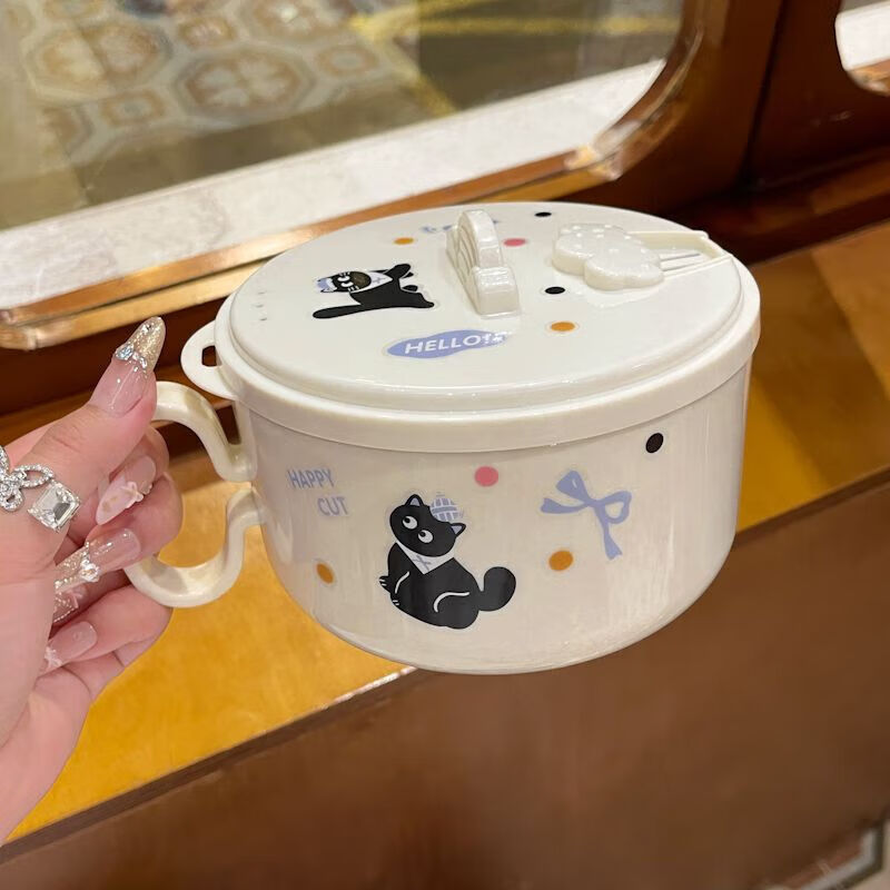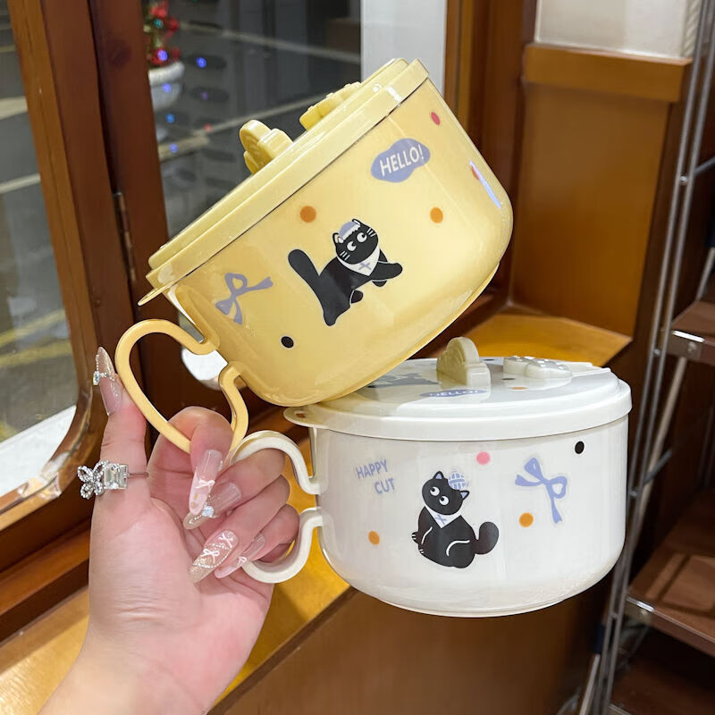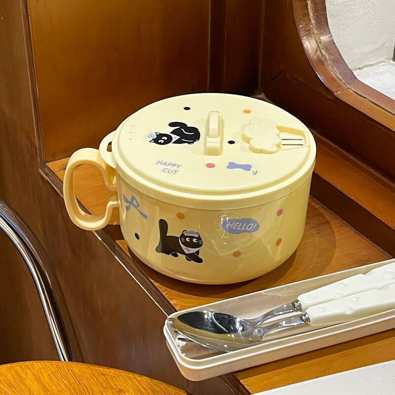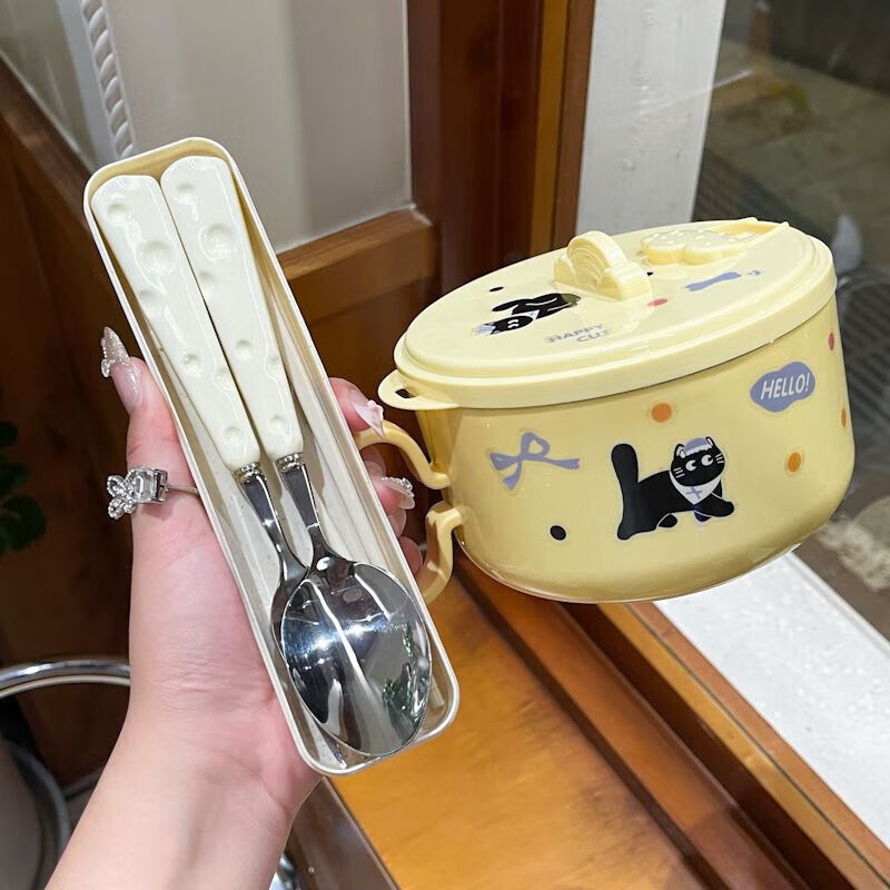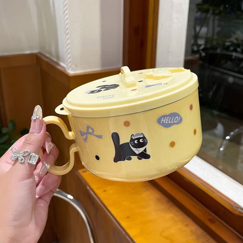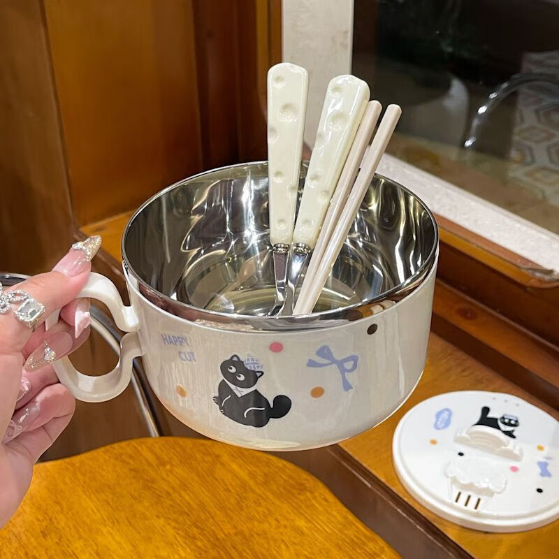 Sailotou Cute Student Instant Noodle Bowl Stainless Steel Drainable Lunch Box with Lid Capacity No. 1600ml304 For Contact Custard Bowl + Black Cat