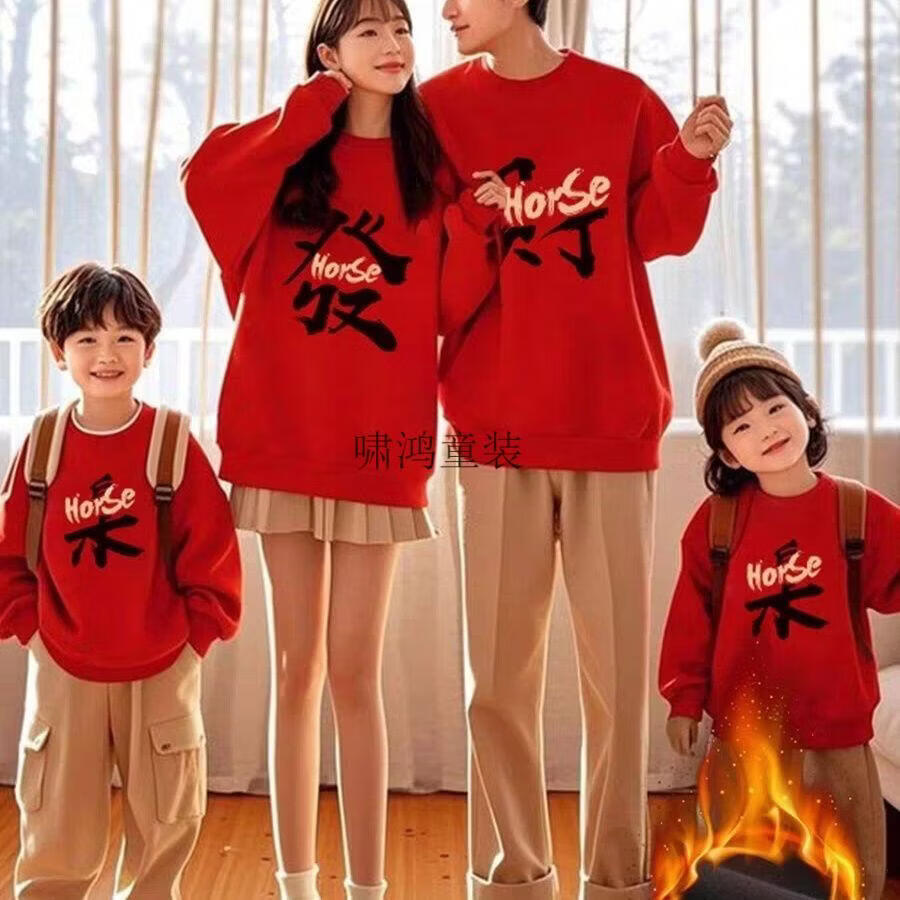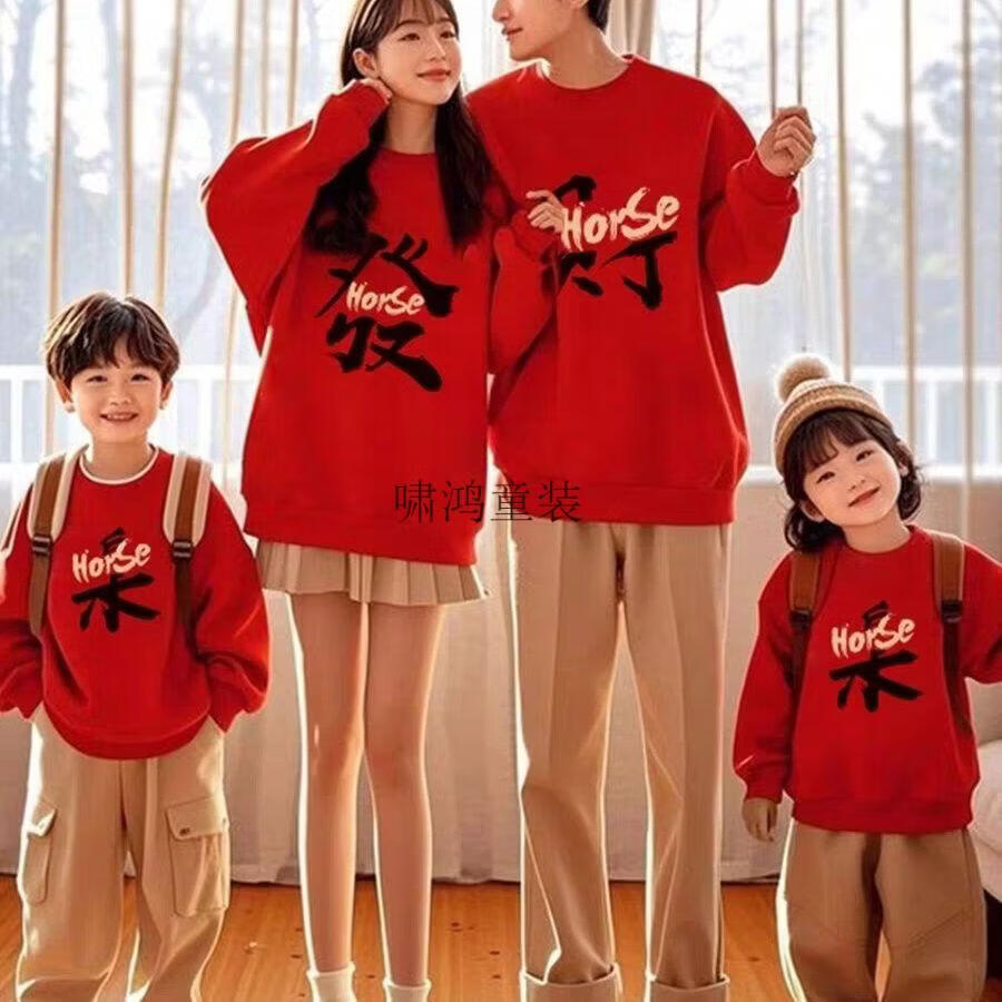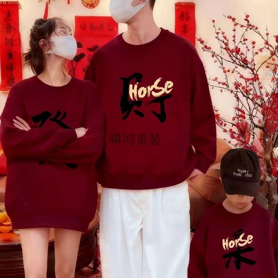 Wooden house celebrates the New Year in red parent-child outfits for a family of three or four, mother and child, round-neck sweatshirts, autumn and winter zodiac year tops, burgundy (plus velvet) 130 baby boy (recommended 40-50 Jin Jin equals 0.5 kg)