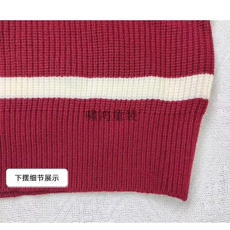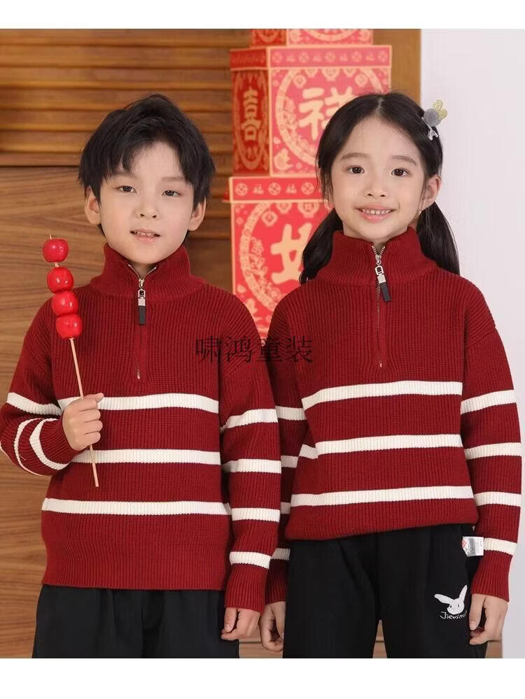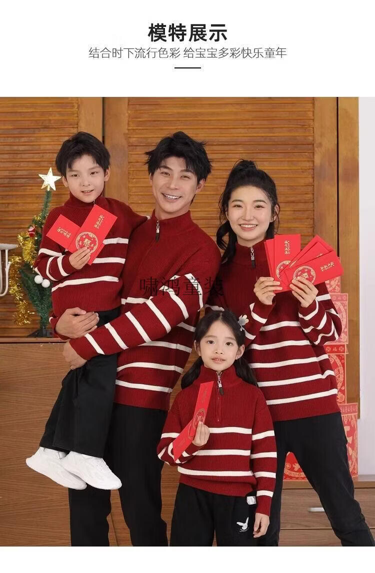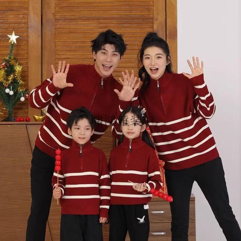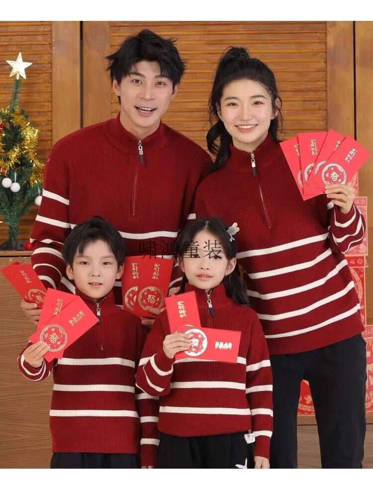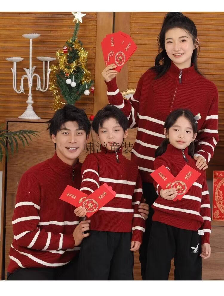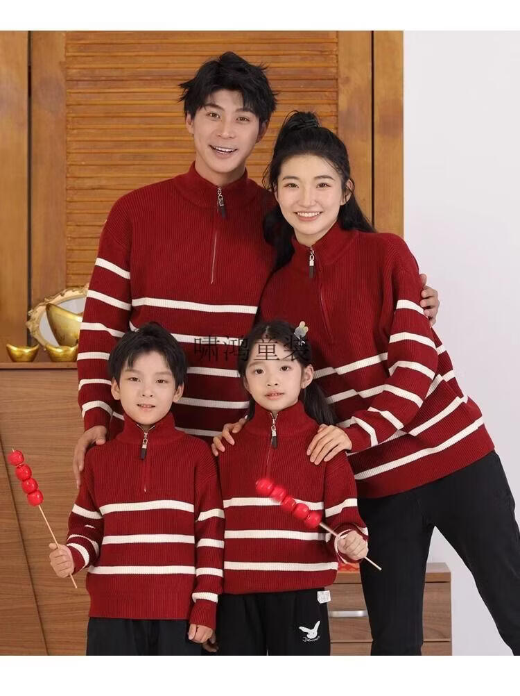 Wooden house parent-child clothing for a family of three and four, striped half-zip autumn, winter and Spring Festival mother-daughter clothing, mother-child knitted sweater, New Year sweater, burgundy sweater 140 children's clothing