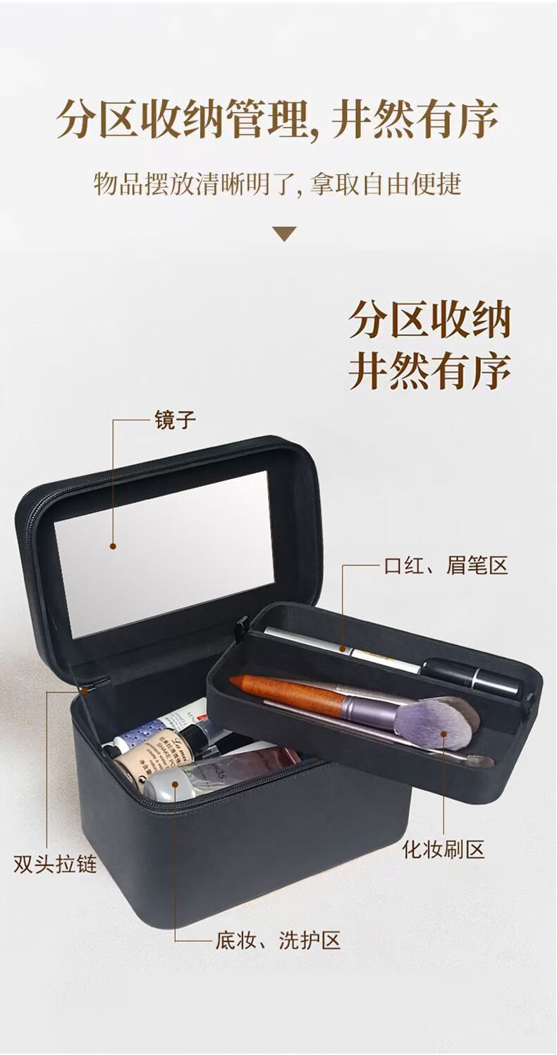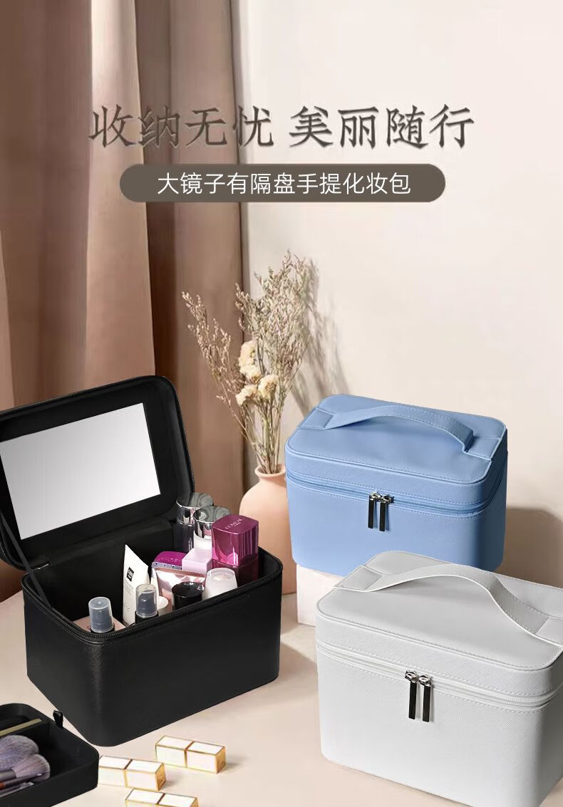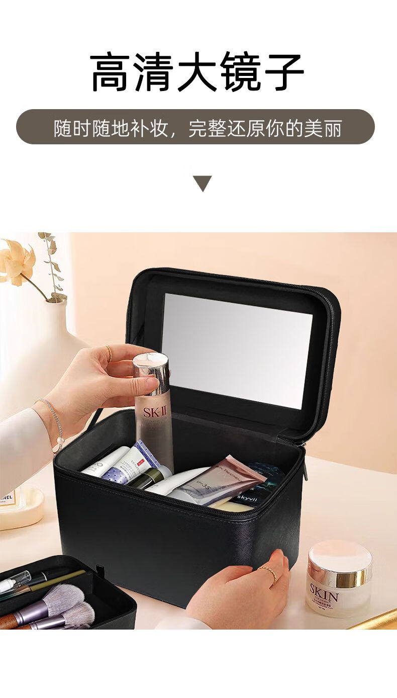 Cosmetic case with multifunctional capacity, simple and portable double-layered hand cosmetic bag, Internet celebrity cosmetics storage box with mirror, black cross pattern with partition mirror