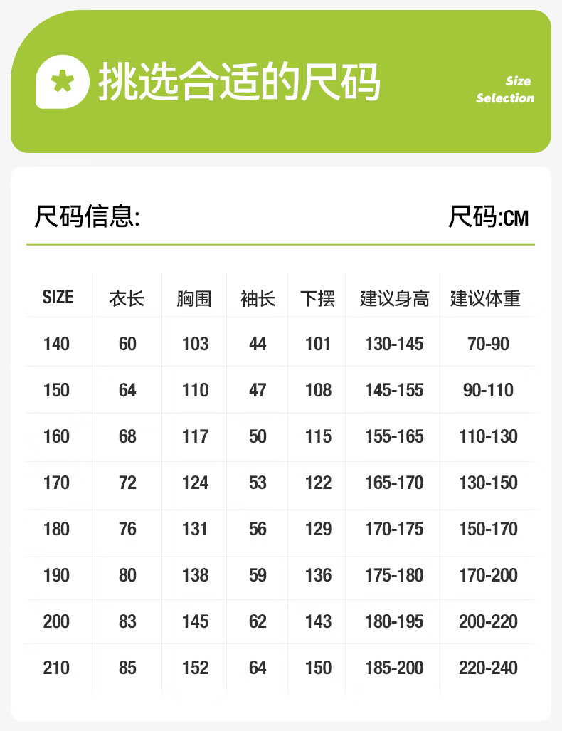 China (cm) 165 / 88-90 170 / 96-98 175 / 108-110 180 / 118-122 185 / 126-130