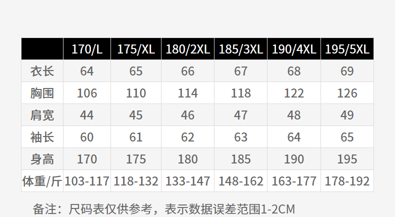 China (cm) 165 / 88-90 170 / 96-98 175 / 108-110 180 / 118-122 185 / 126-130