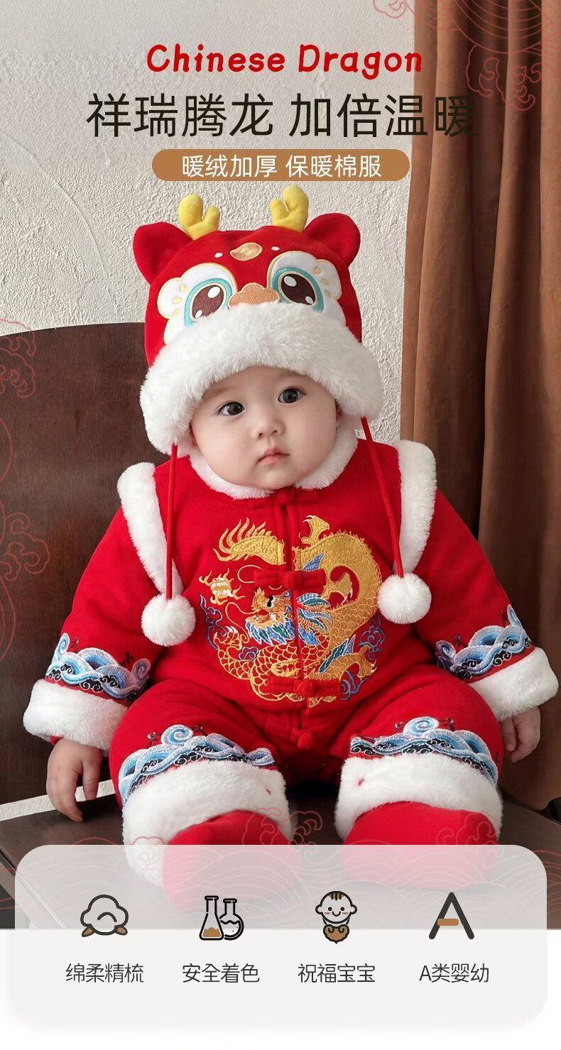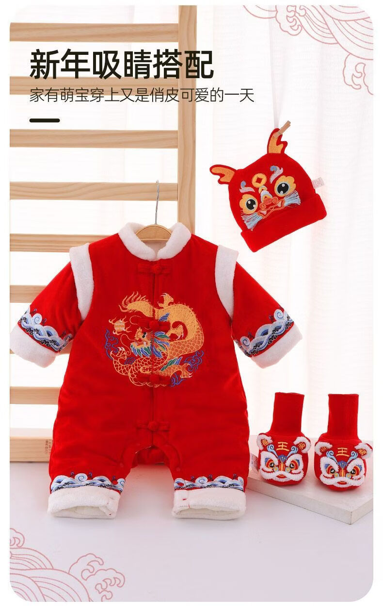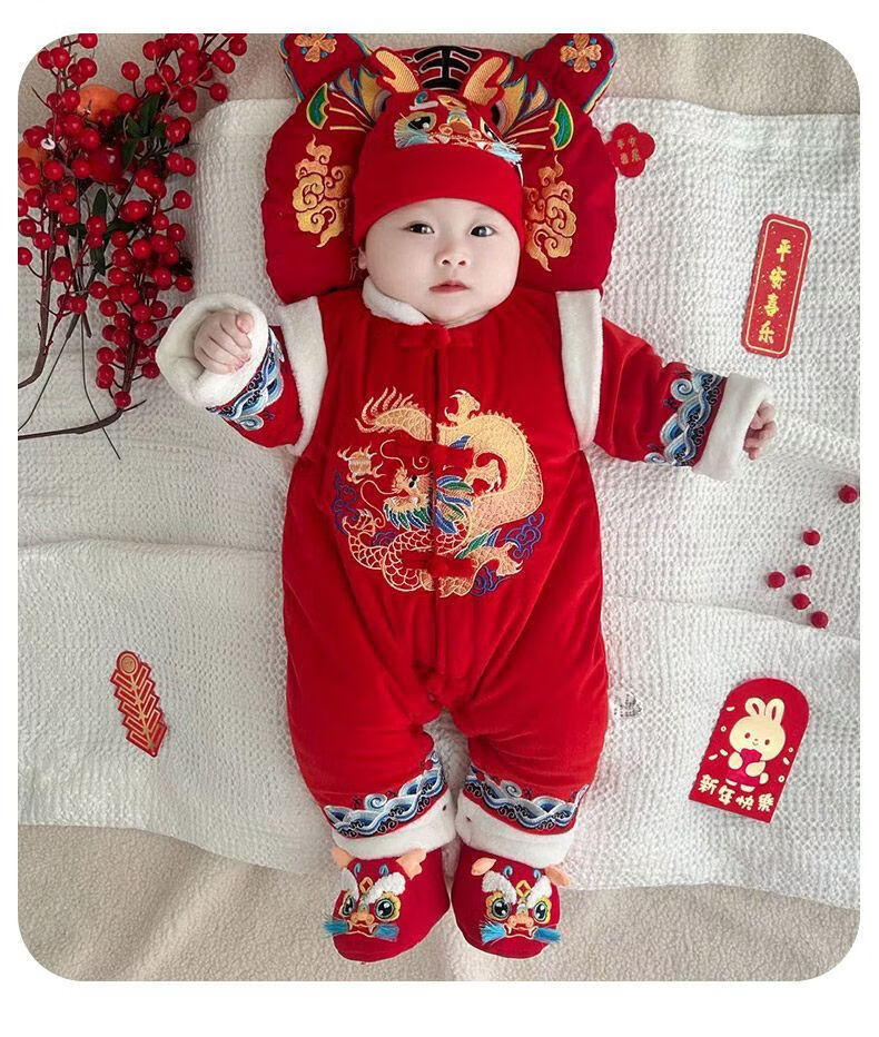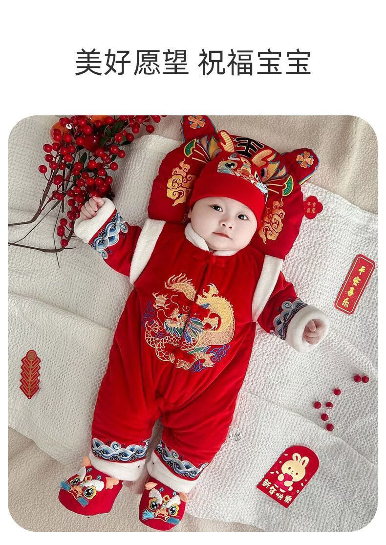 Youqi baby clothes, autumn and winter baby New Year greetings, winter clothes, New Year's full moon clothes, festive jumpsuits, Category A丨Warmth丨Long Dragon 3-piece set, with clothes, lion hat, lucky socks, 59cm, recommended height 52-59CM