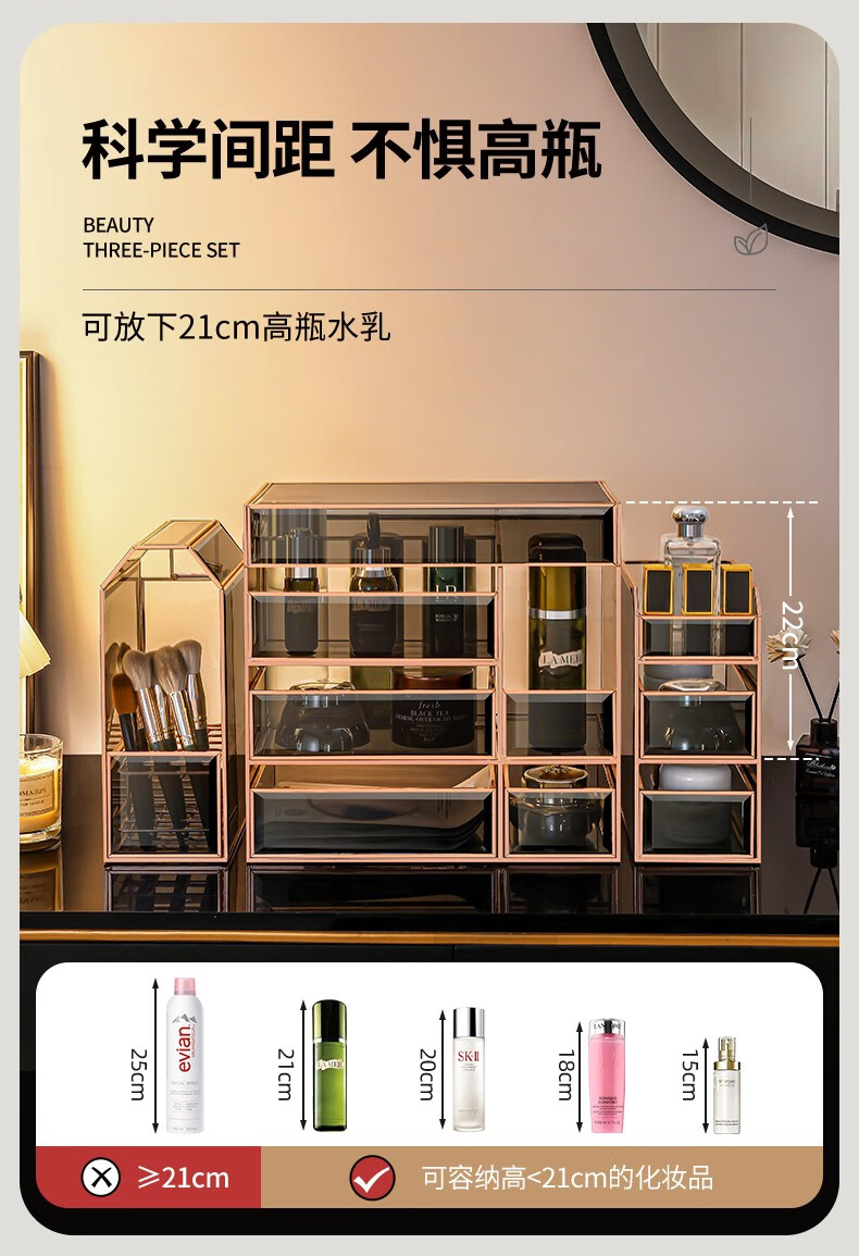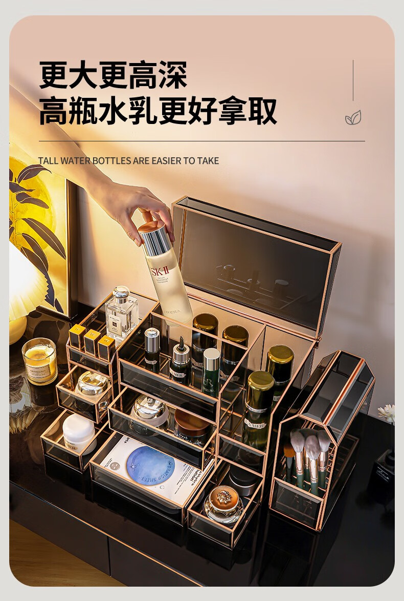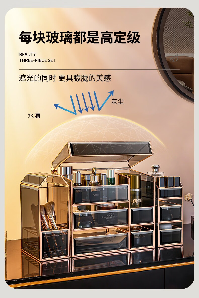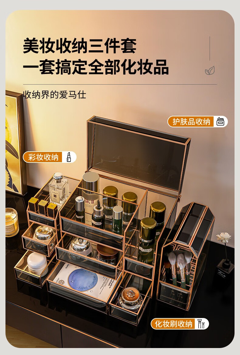 RSRDDY Cosmetic Storage Box Desktop Glass Skin Care Product Storage Box Light Luxury Beauty Brush Storage Rack Small Black Box Series Three-piece Set