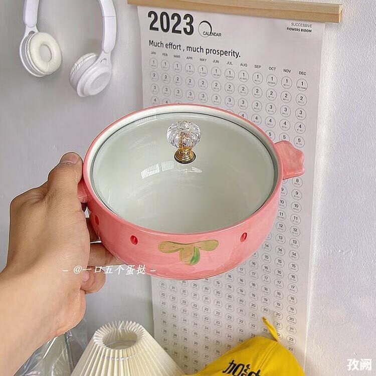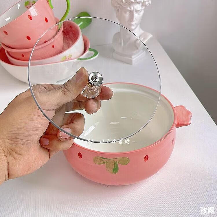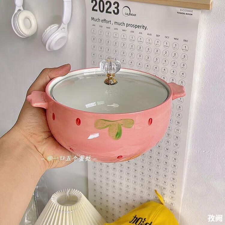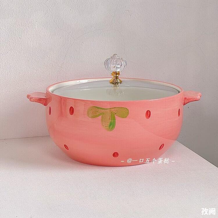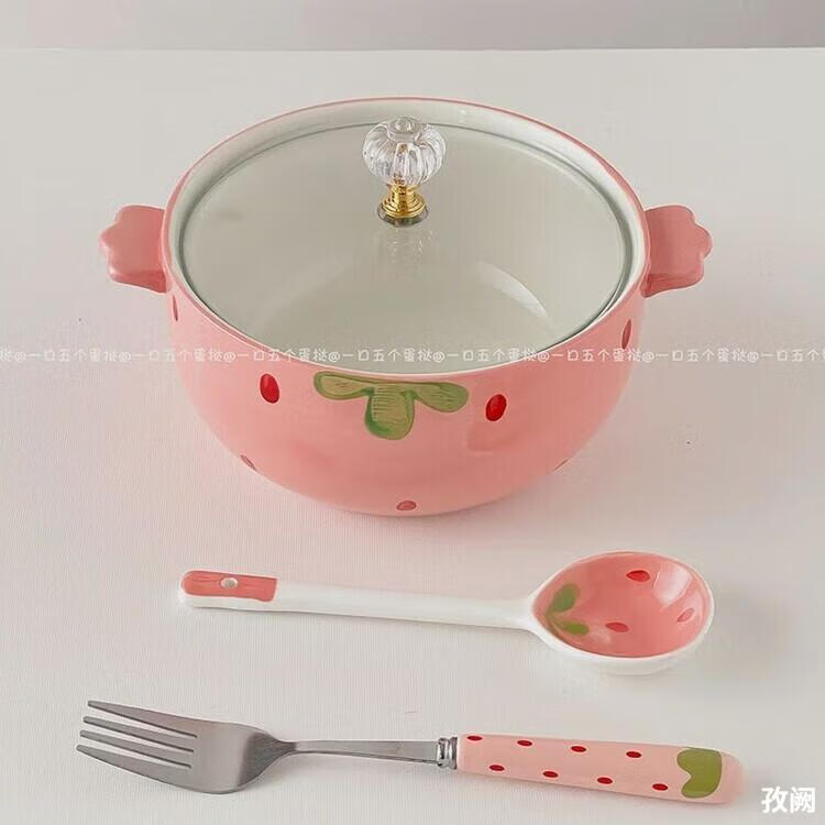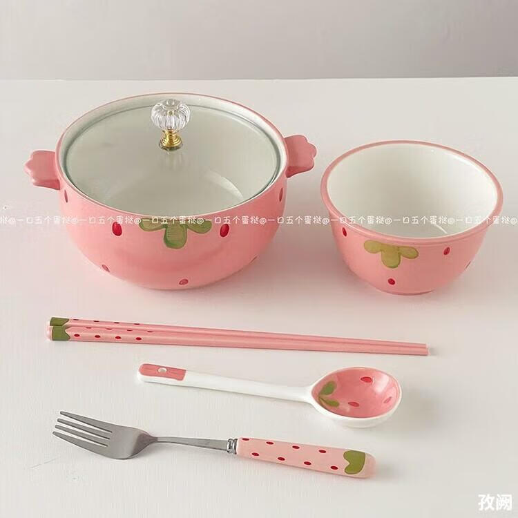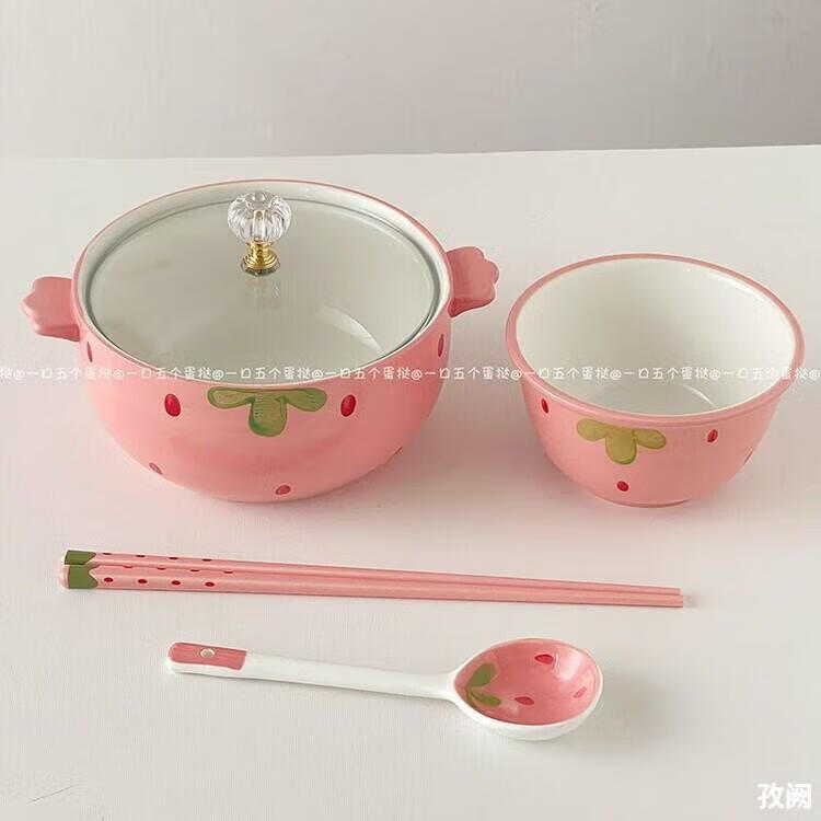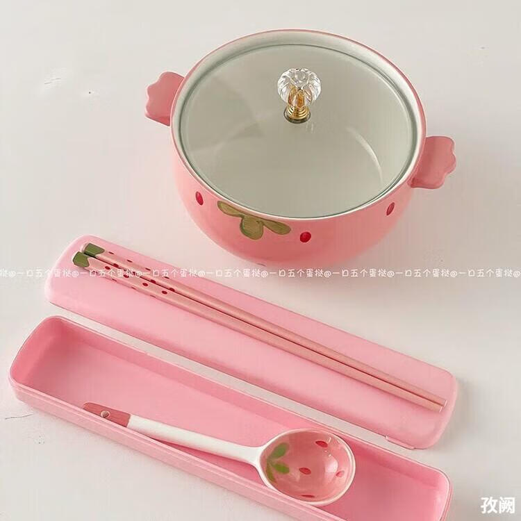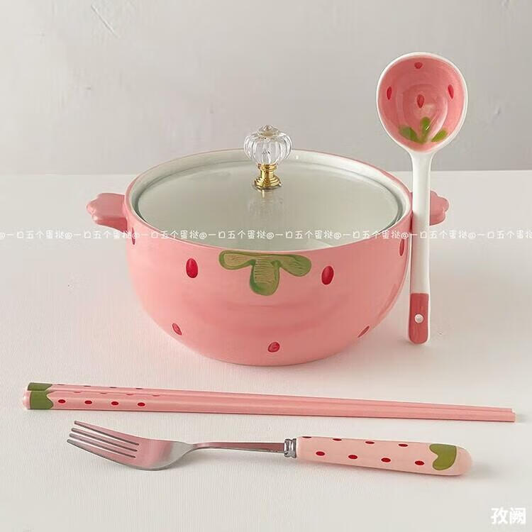 Sailotou instant noodle bowl three-piece set strawberry ceramic i-style double-eared soup bowl with lid student eating bowl cute girly tableware Strawberry instant noodle bowl + spoon + chopsticks